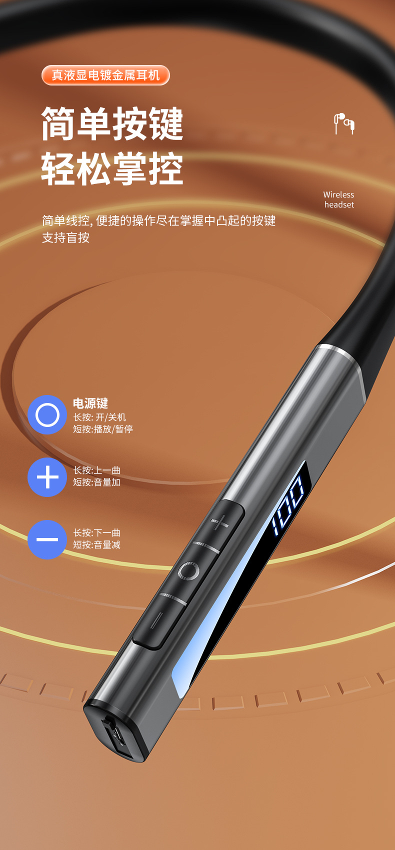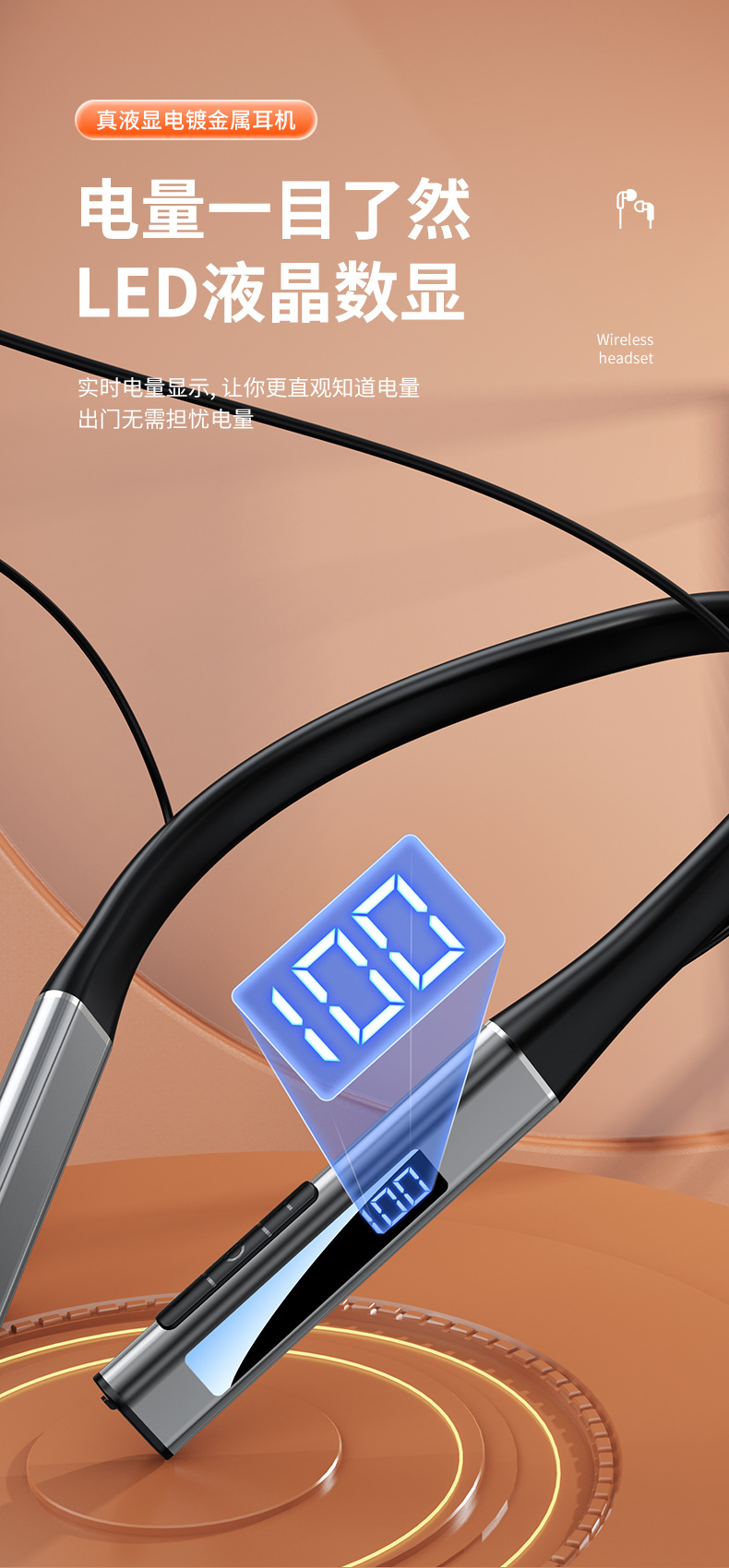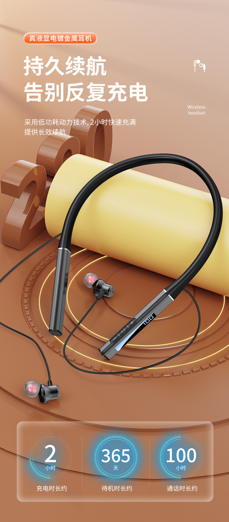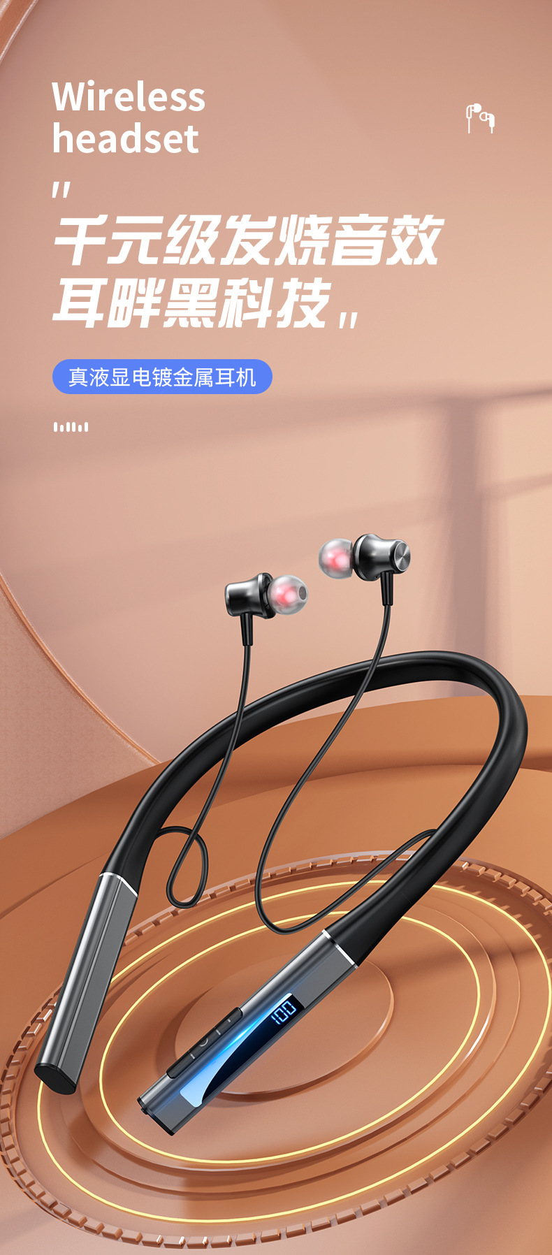 디지털 디스플레이, 긴 배터리 수명, 우수한 음질, 목걸이형 스포츠 헤드셋을 갖춘 새로운 5.0 인이어 무선 블루투스 헤드셋 공장