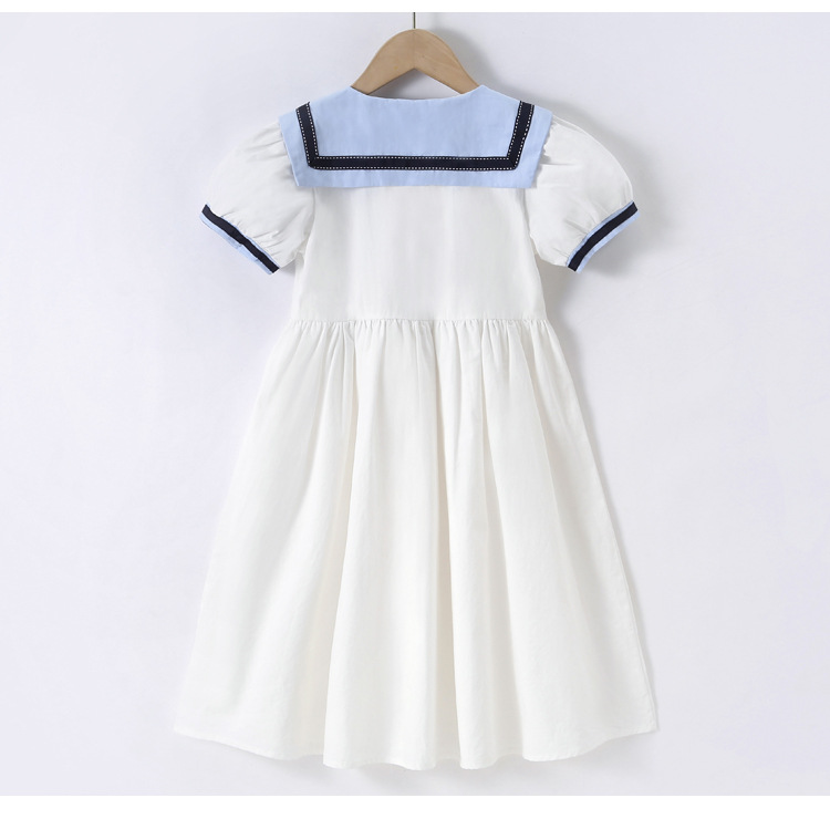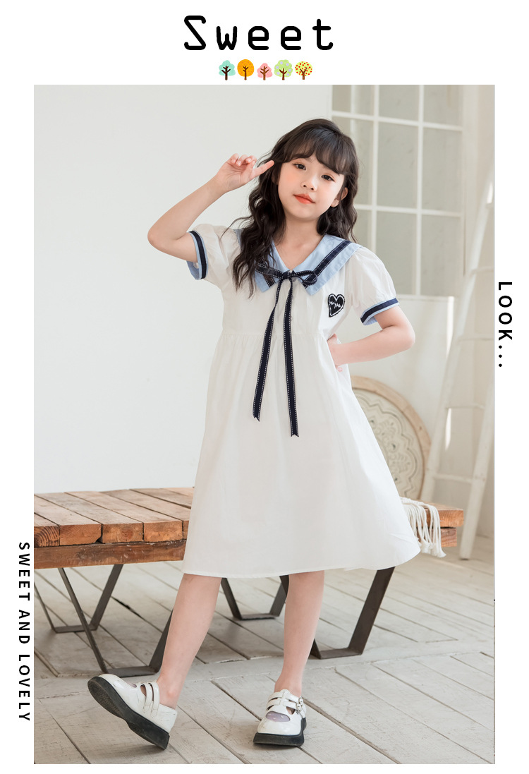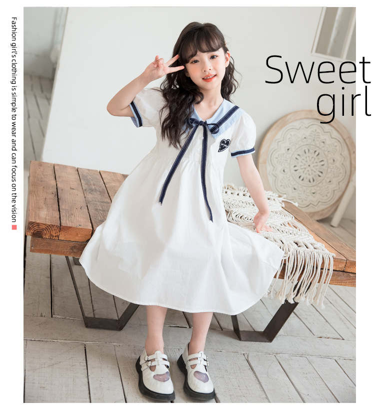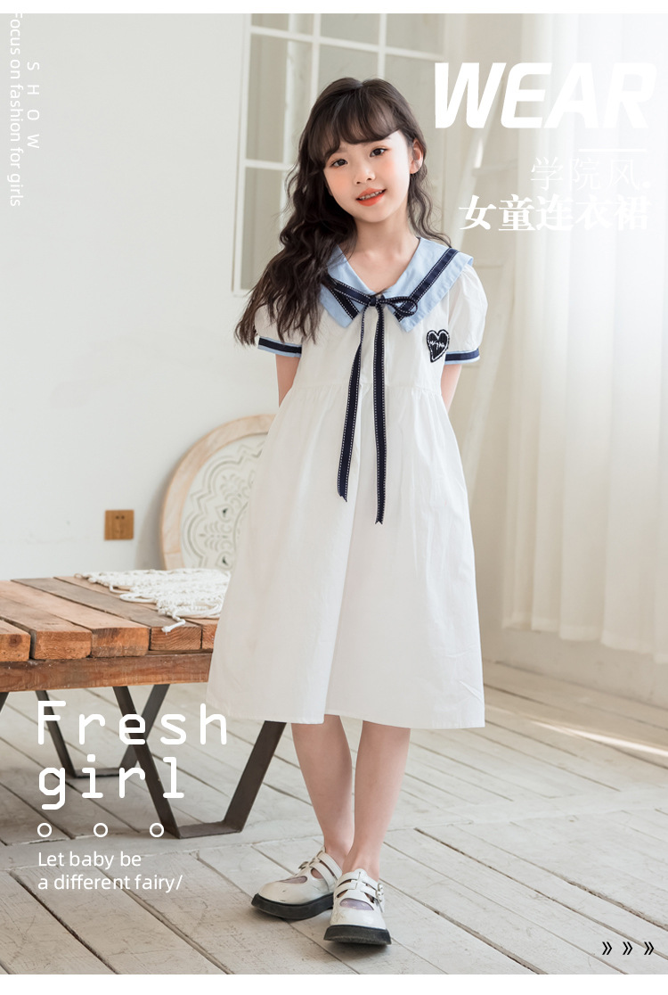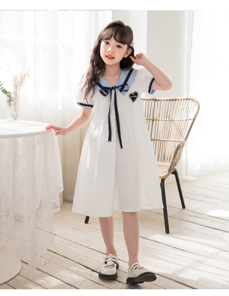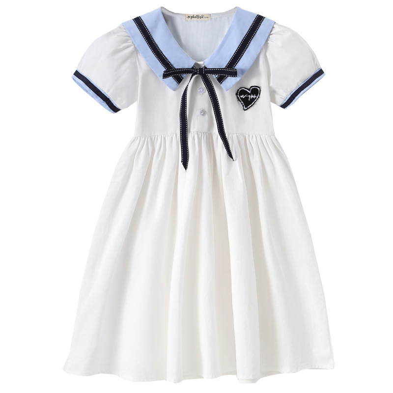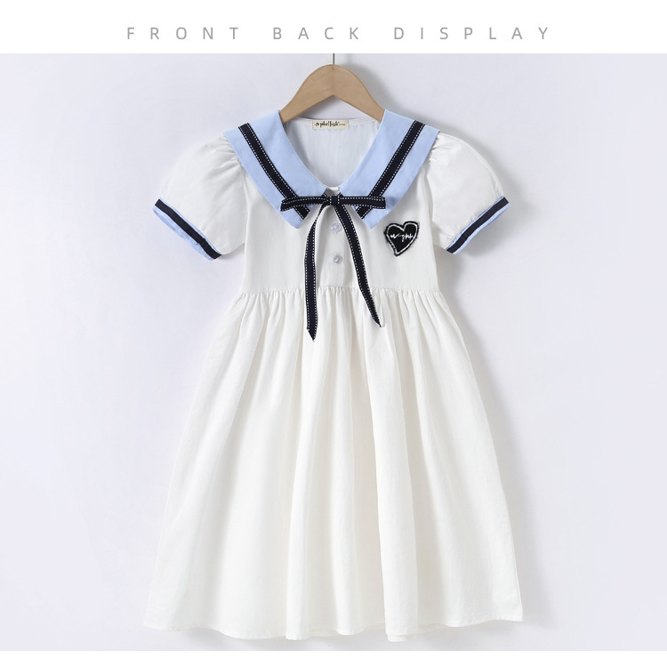 여아 반팔 스커트, 면 대학 스타일 셔츠, 공주 스커트, 흰색 라펠 중대형 아동 드레스, 2025 여름 의류스토어 가기