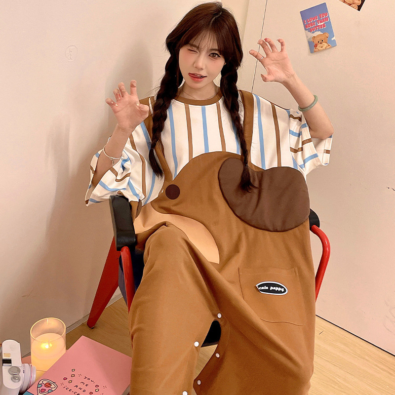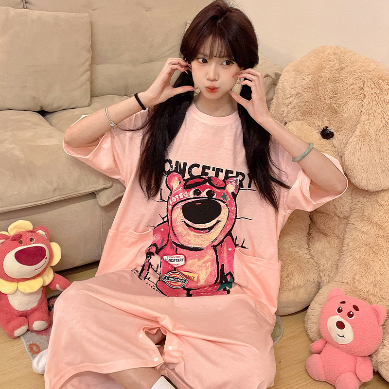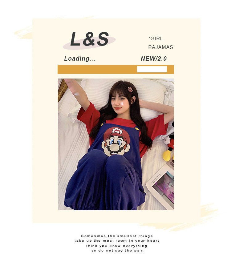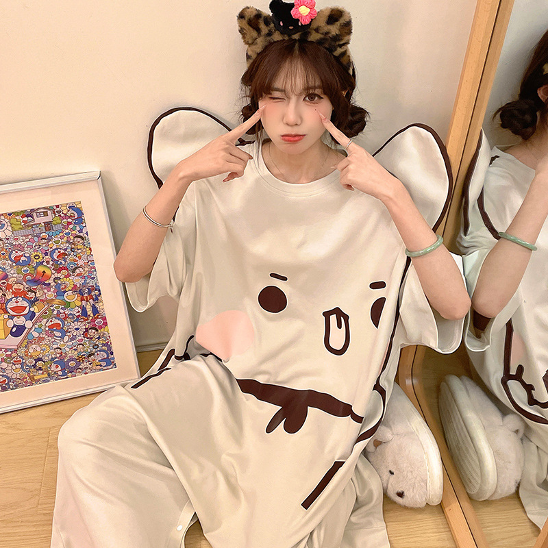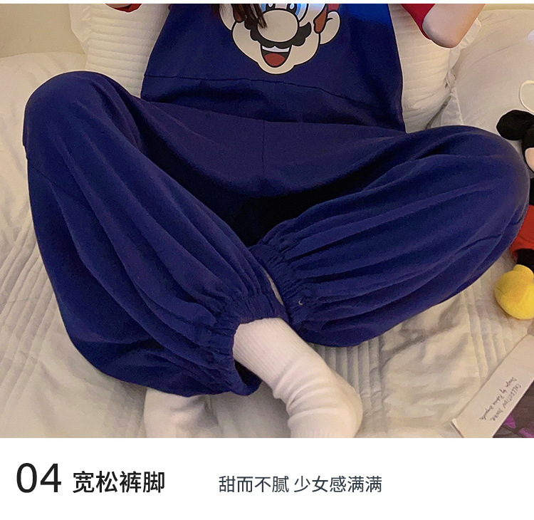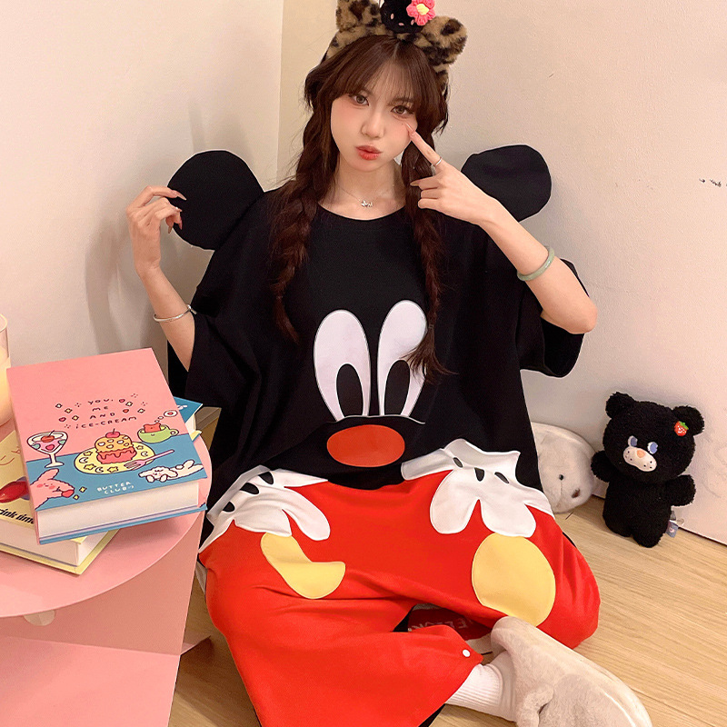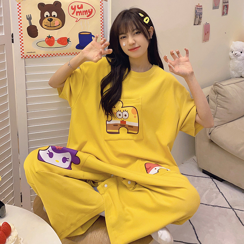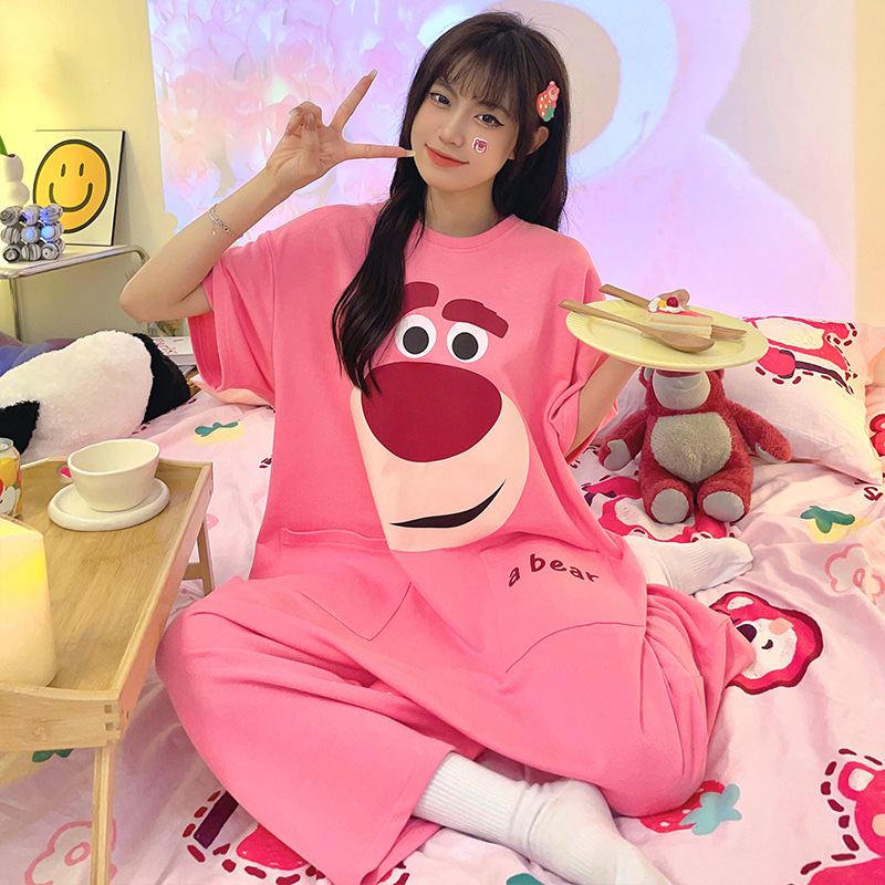 여성의 봄과 여름 얇은 귀여운 만화 소매 바지 면 반팔 외부 세트 소매 파자마스토어 가기