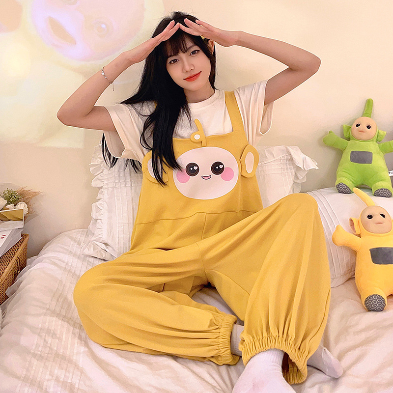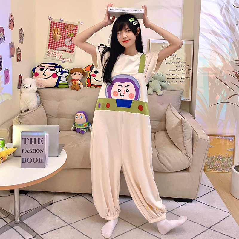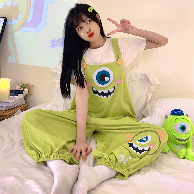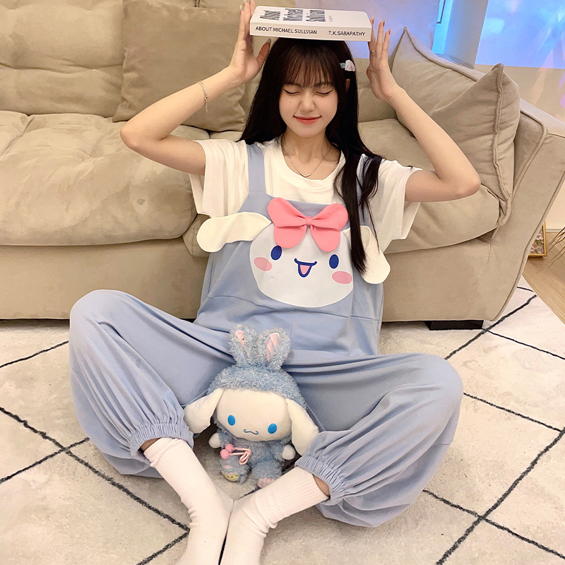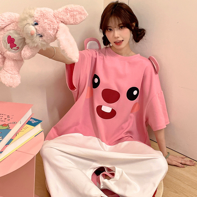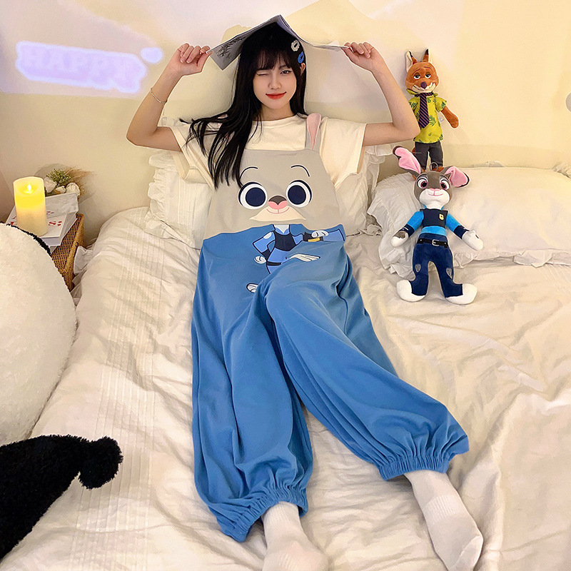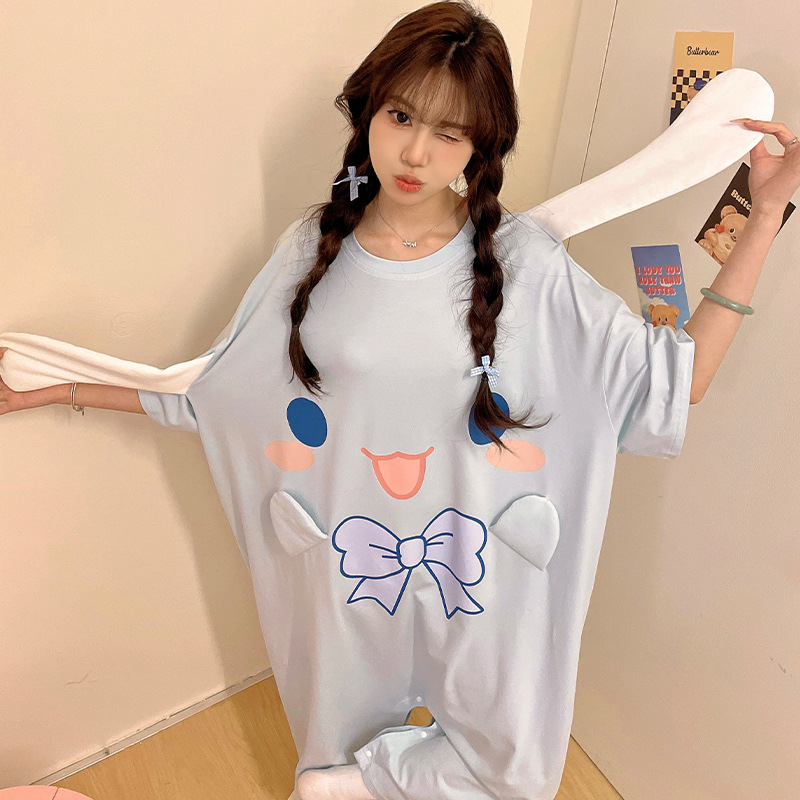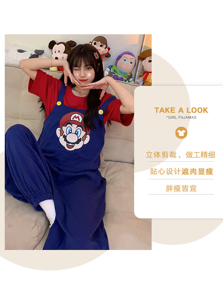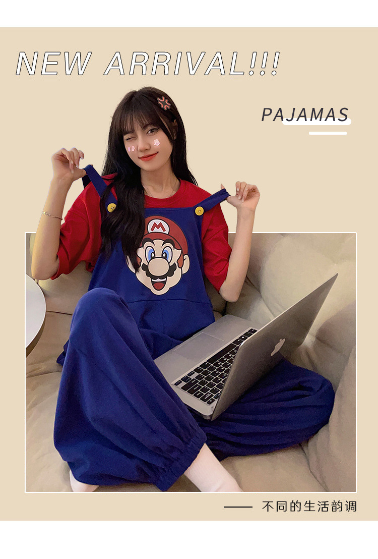 여성의 봄과 여름 얇은 귀여운 만화 소매 바지 면 반팔 외부 세트 소매 파자마스토어 가기
