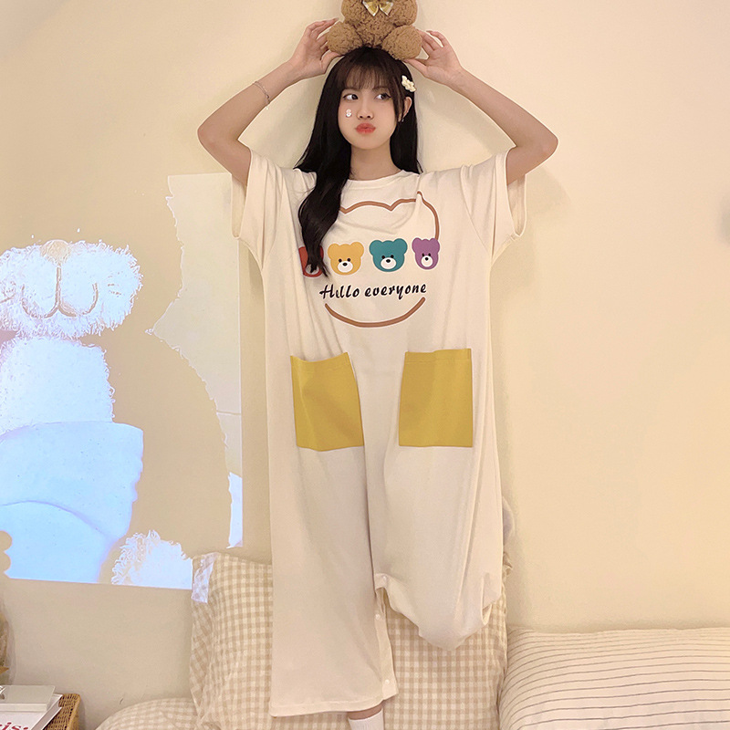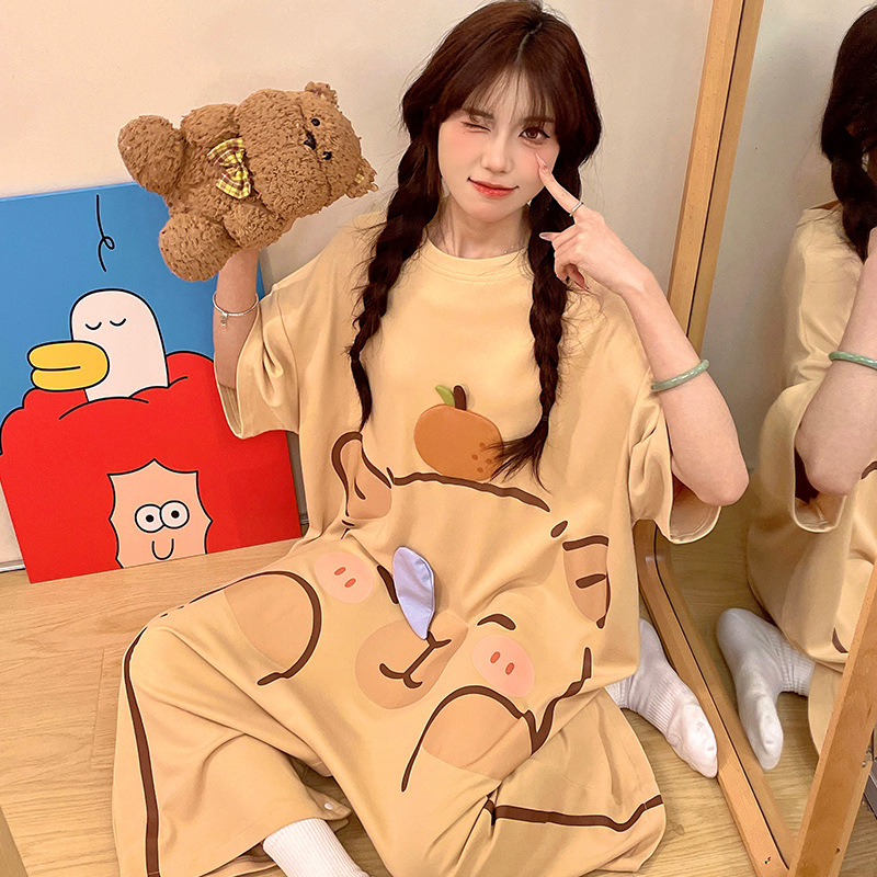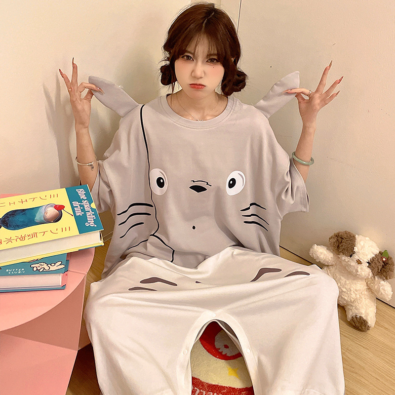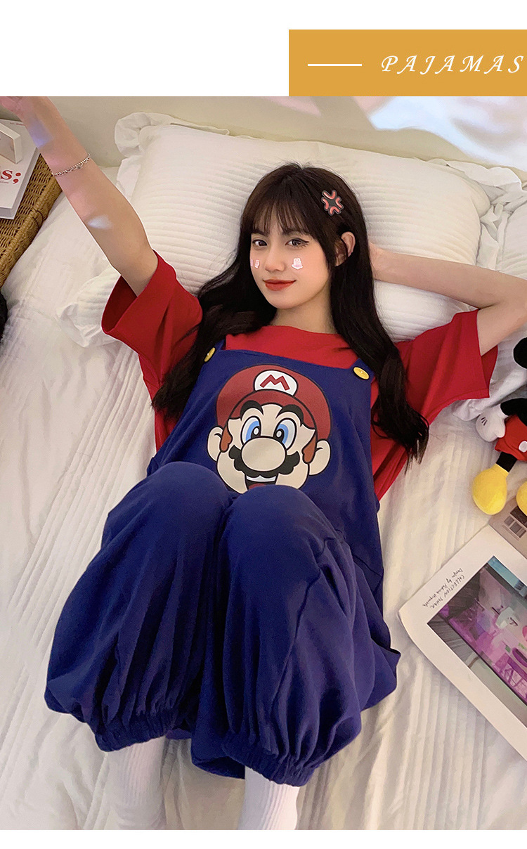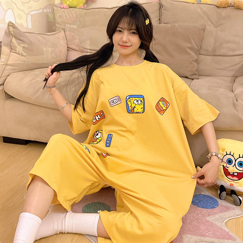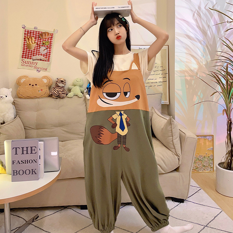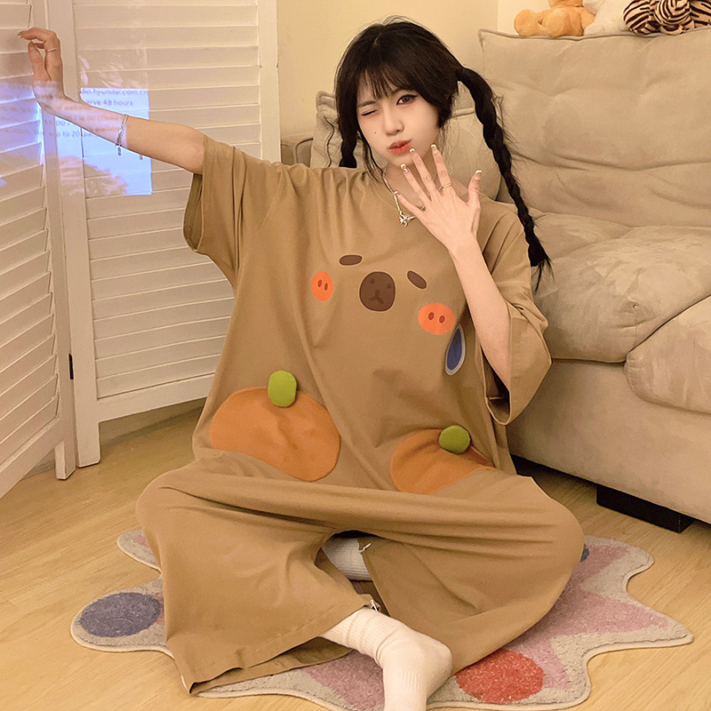 여성의 봄과 여름 얇은 귀여운 만화 소매 바지 면 반팔 외부 세트 소매 파자마스토어 가기