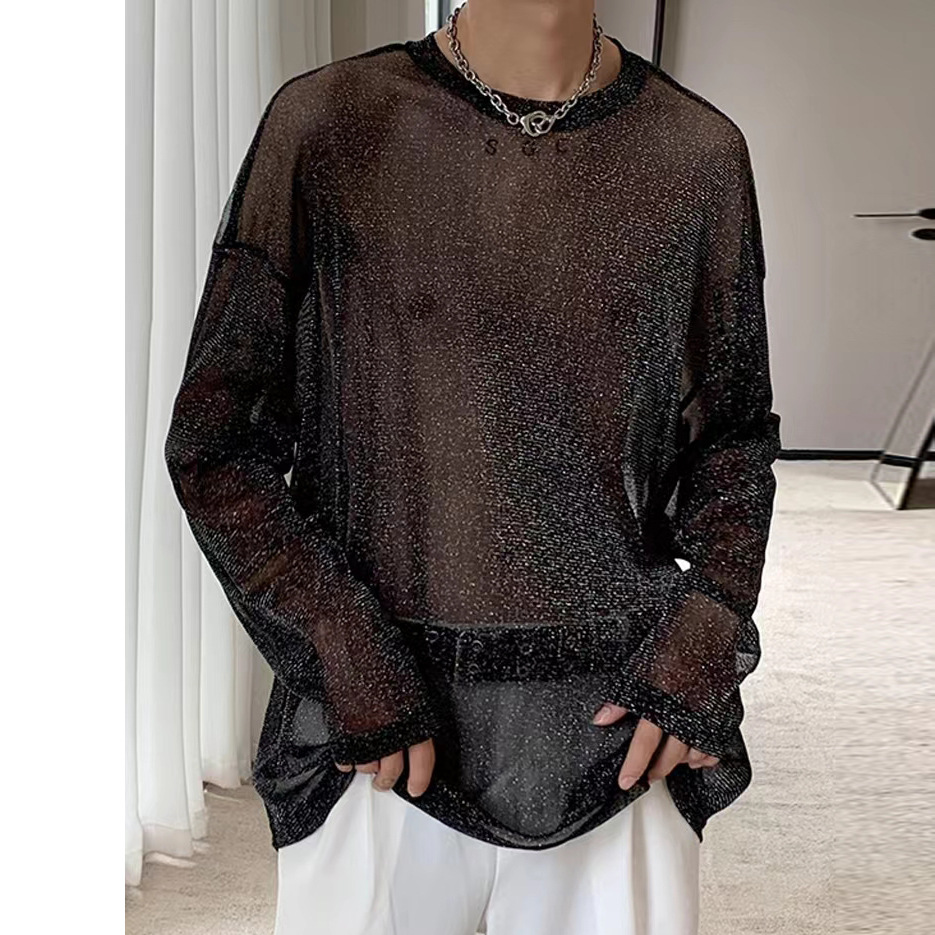 메쉬 긴팔 숄더 시스루 티셔츠 남자의 섹시한 밤 옷 반짝 이는 통기성 메쉬베이스 셔츠 남자 의상