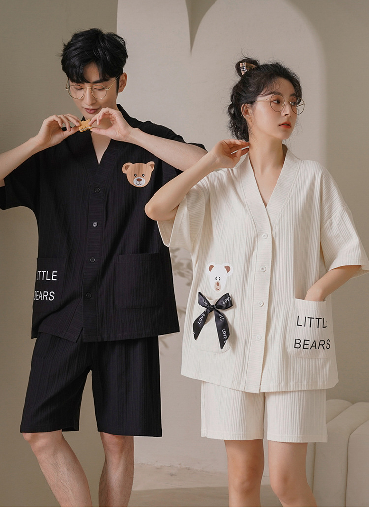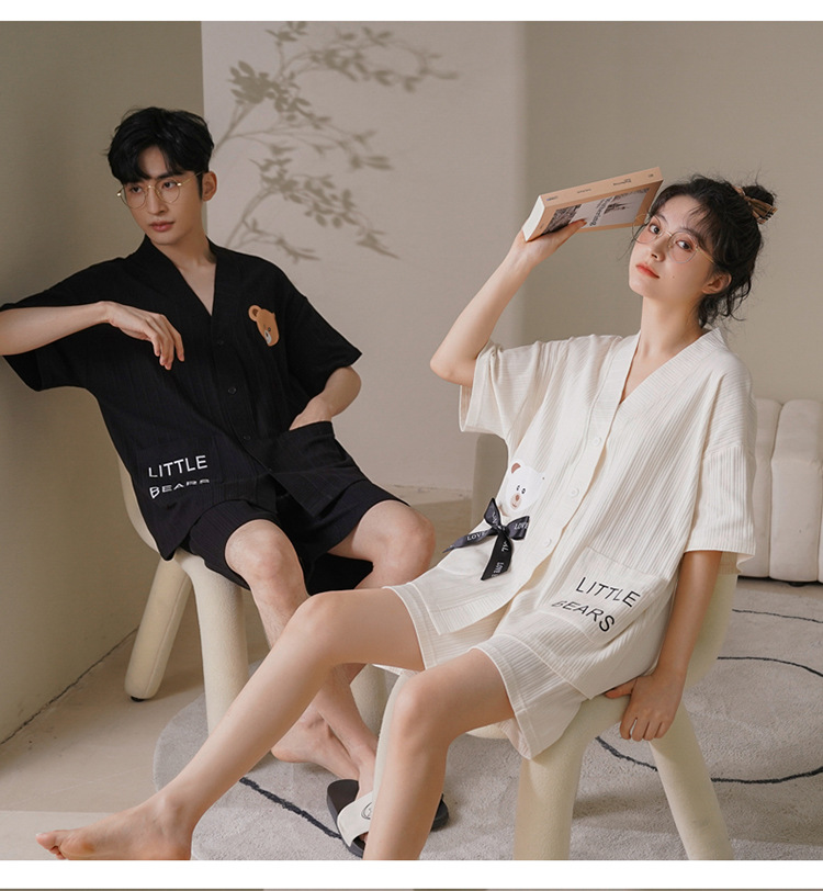 커플 잠옷 여성 기모노 여름 코튼 가디건은 만화 잠옷 남성과 여성 반팔 반바지 옷깃 세트 외부에서 착용 가능