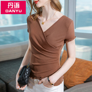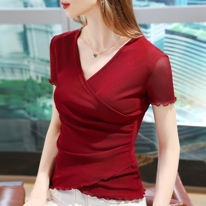 여성을위한 크로스 v 넥 반팔 티셔츠 2025 여름 신작 여성 솔리드 컬러 메쉬 바닥 셔츠 곰팡이 가장자리 허리 탑스토어 가기