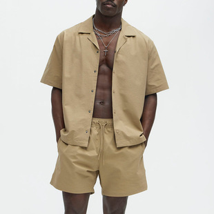 2025欧美亚马逊跨境夏季男装新款纯色休闲翻领短袖衬衫短裤男套装