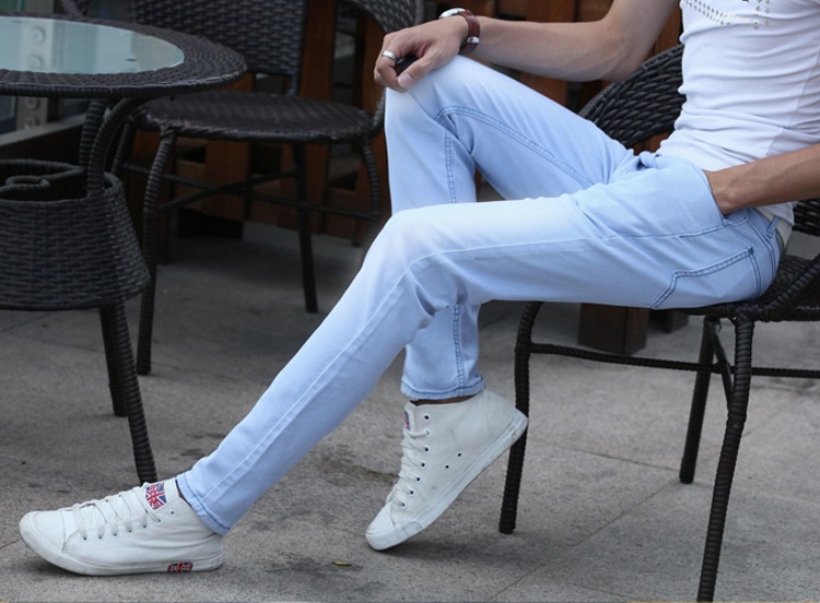 봄 새로운 한국 스타일 트렌디 남성복 남성 슬림핏 스트레치 블루 진 펜슬 팬츠 7021스토어 가기