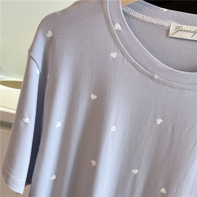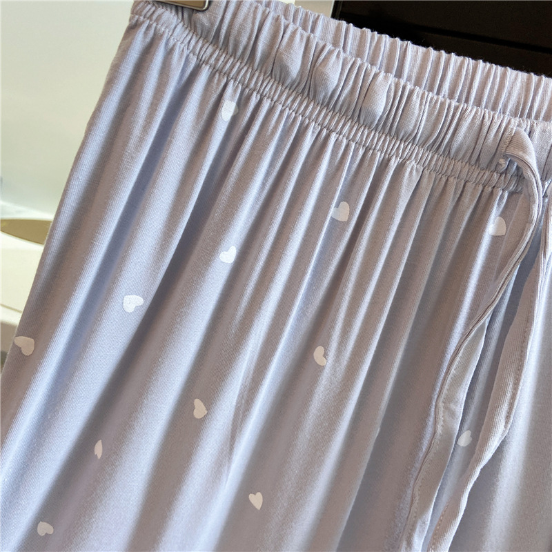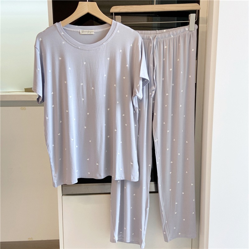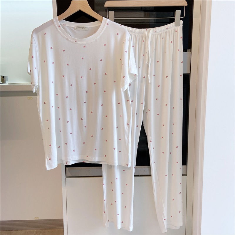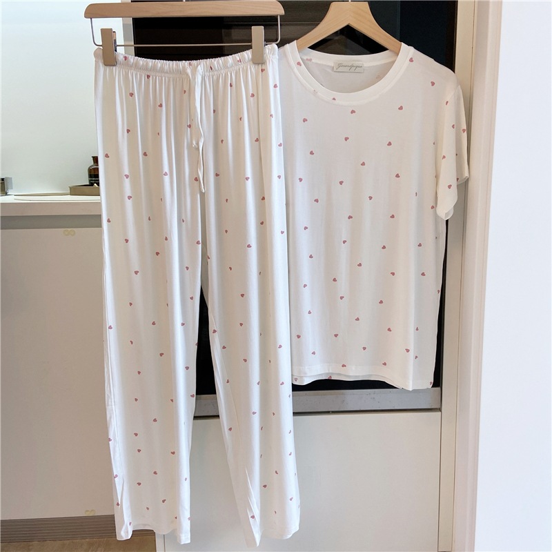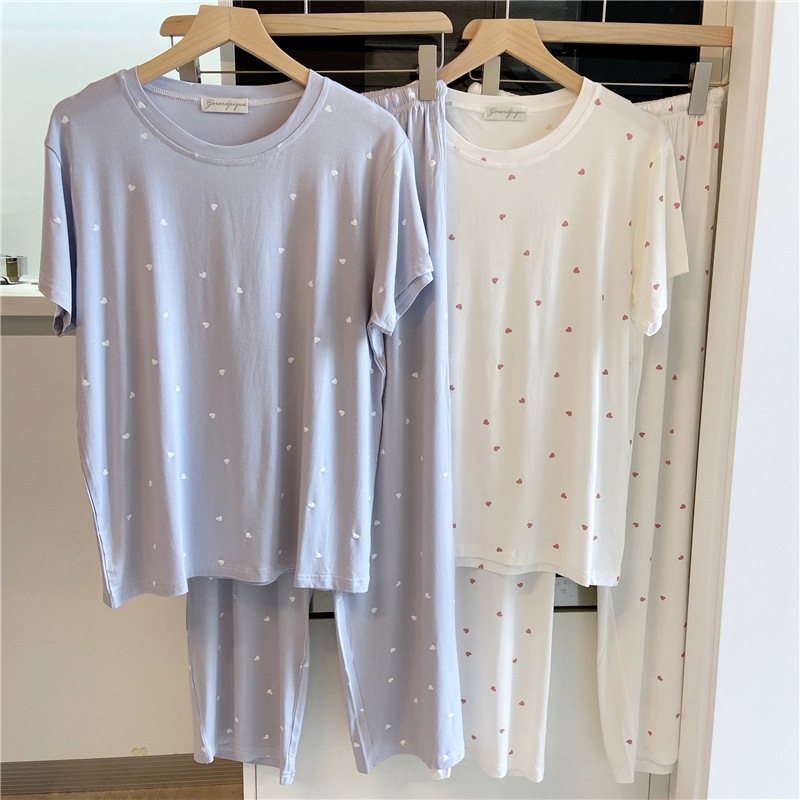 잠옷 여자의 여름 신선한 작은 사랑 귀여운 부드럽고 편안한 반소매 바지 가정 옷 세트 얇은스토어 가기