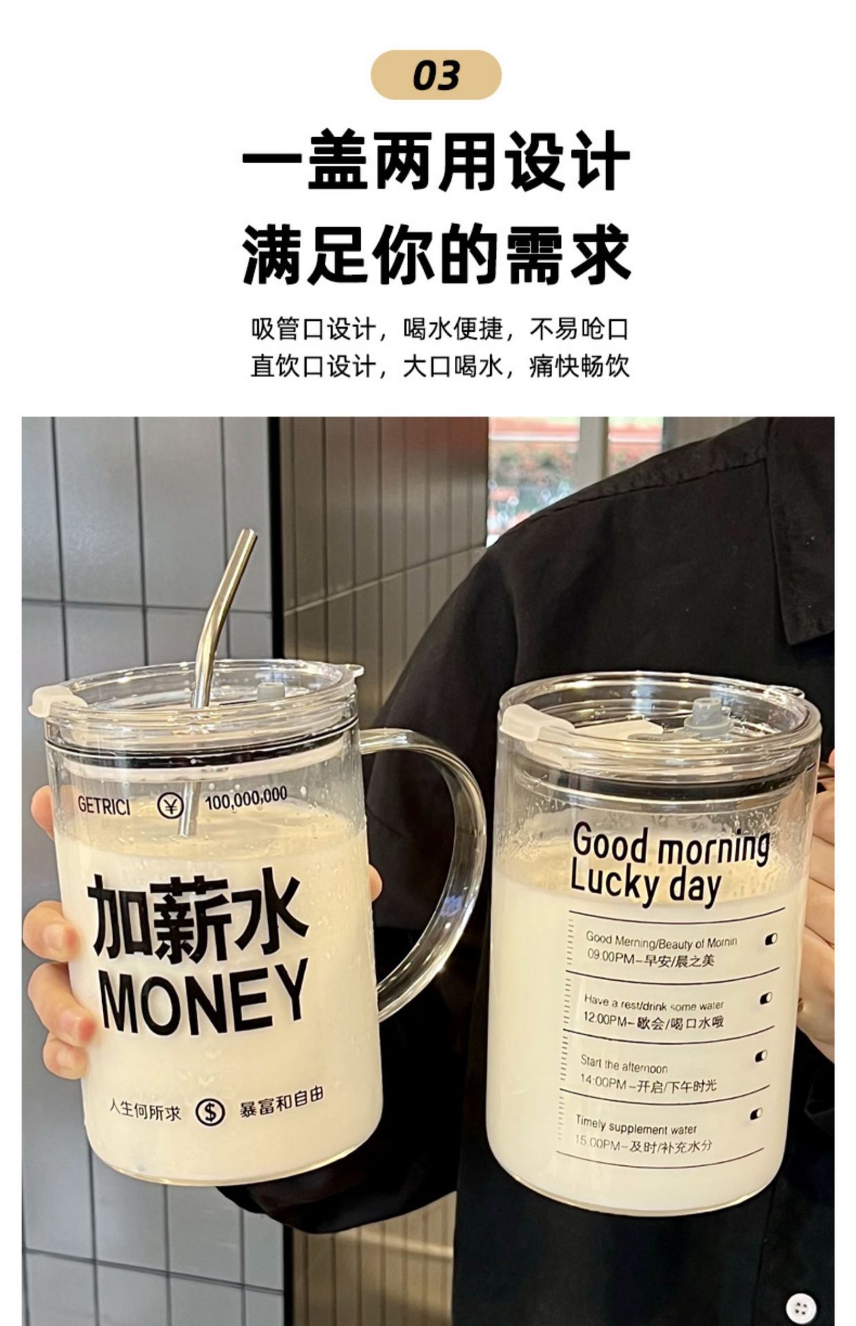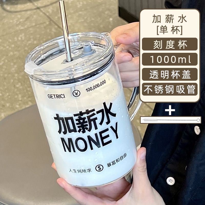 • 급여 인상 (돌연 부자) 투명 컵 본체 + 스테인리스 빨대 + 컵 뚜껑 + 빨대 브러시