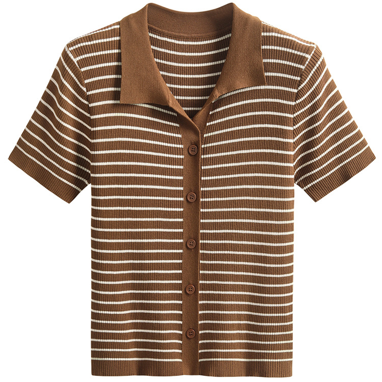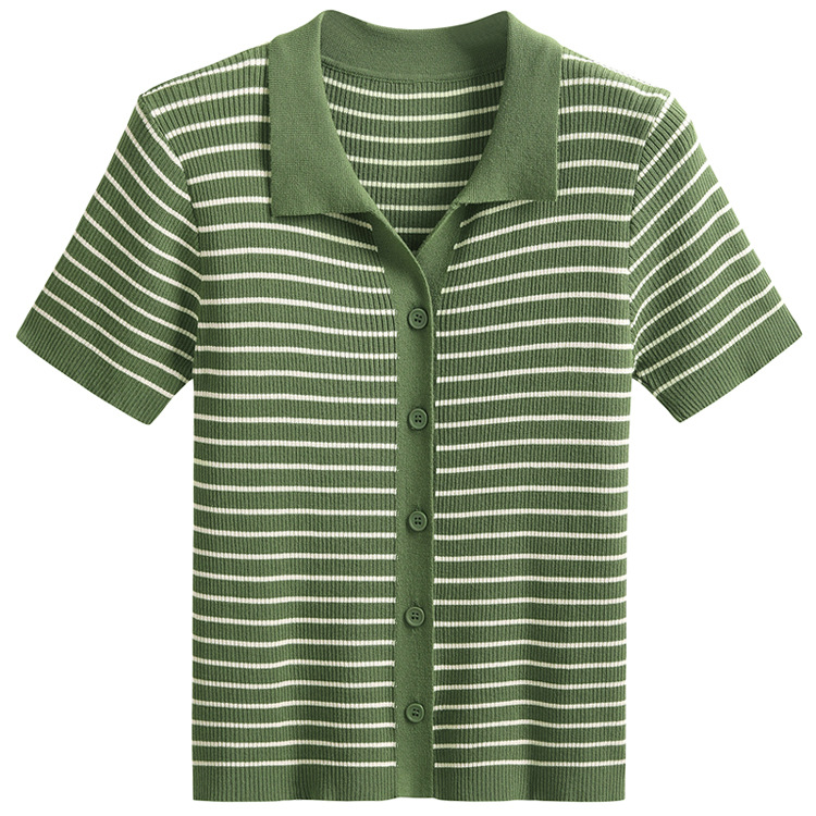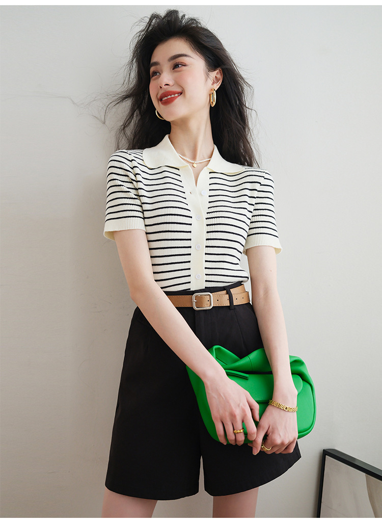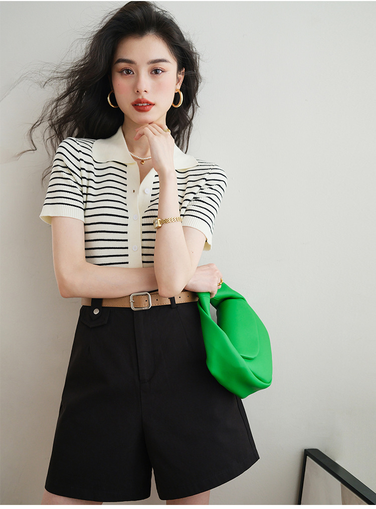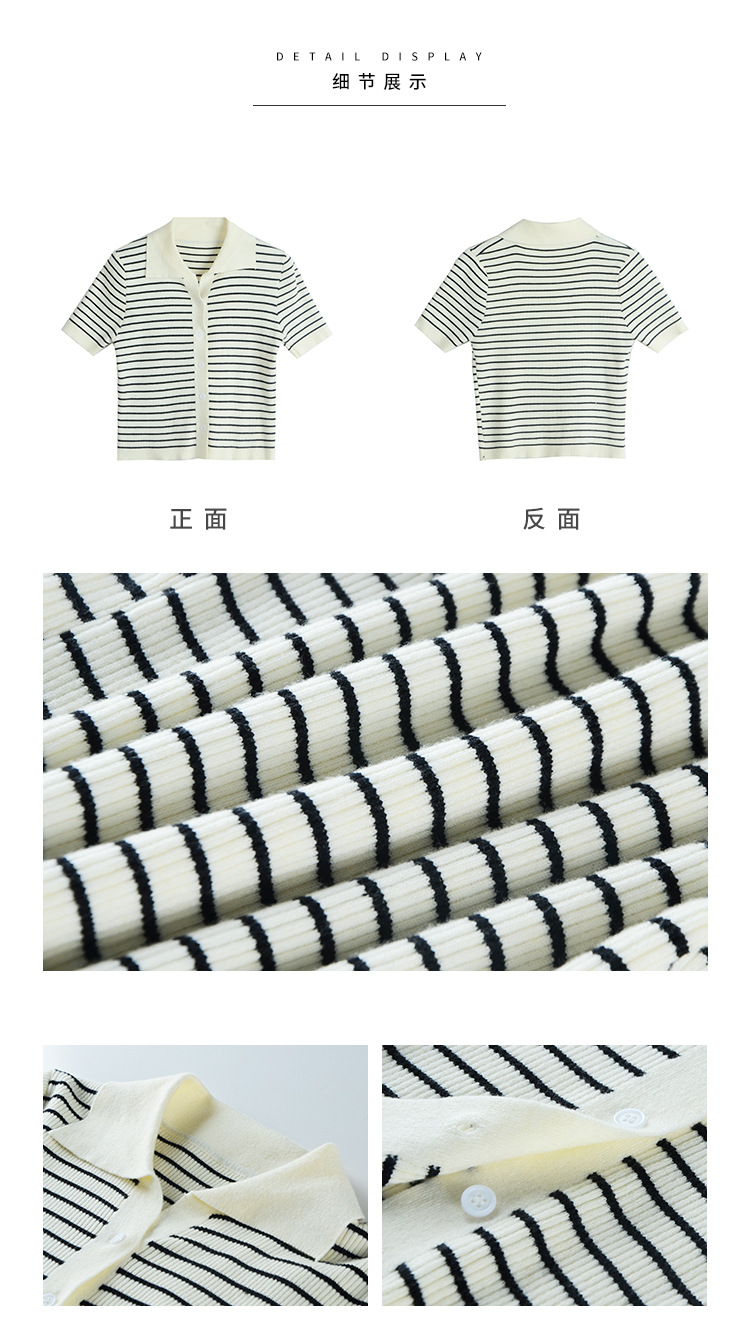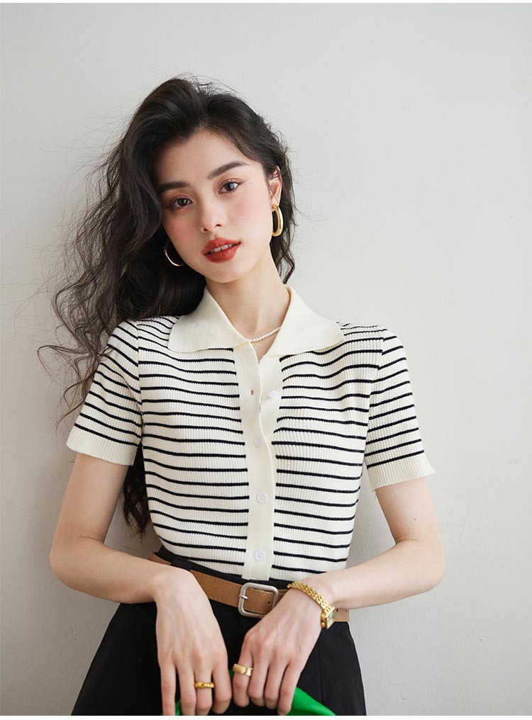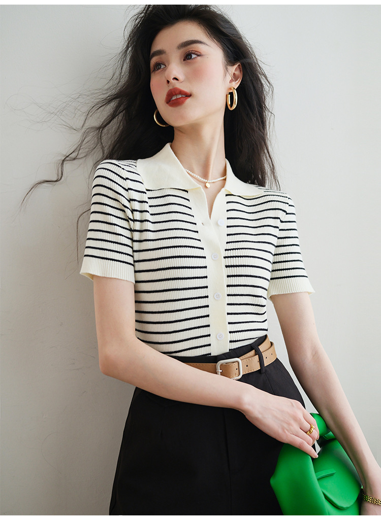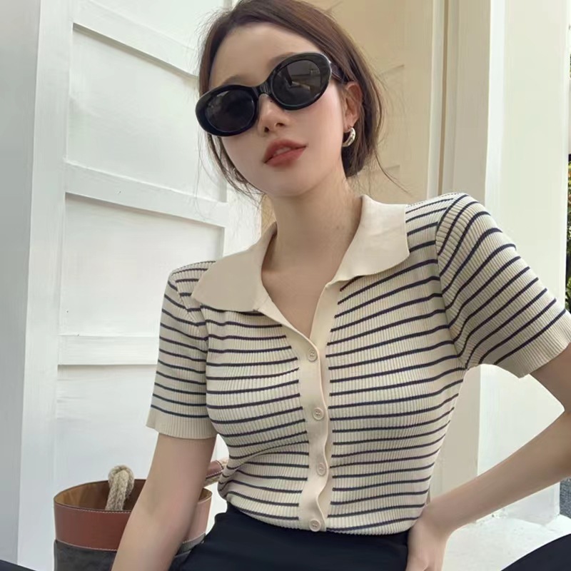 반팔 스트라이프 스웨터 여성용 폴로 칼라 짧은 봄과 여름 새로운 프랑스 틈새 소형 남성 슬림핏 숄더 탑