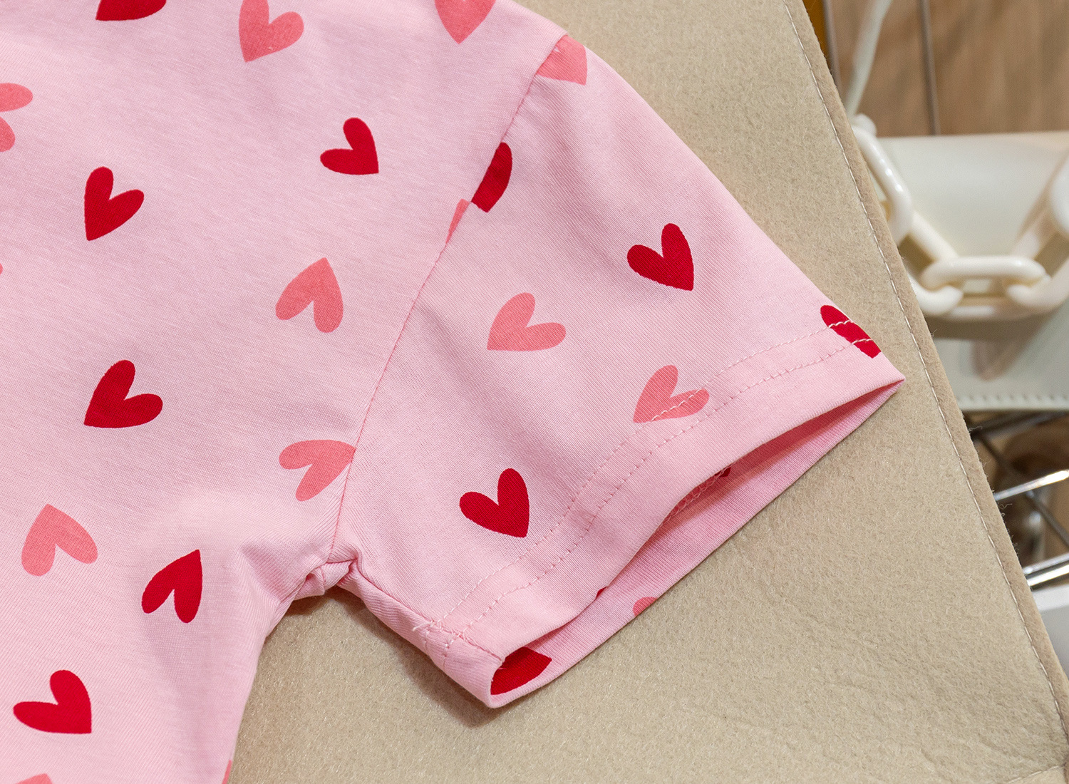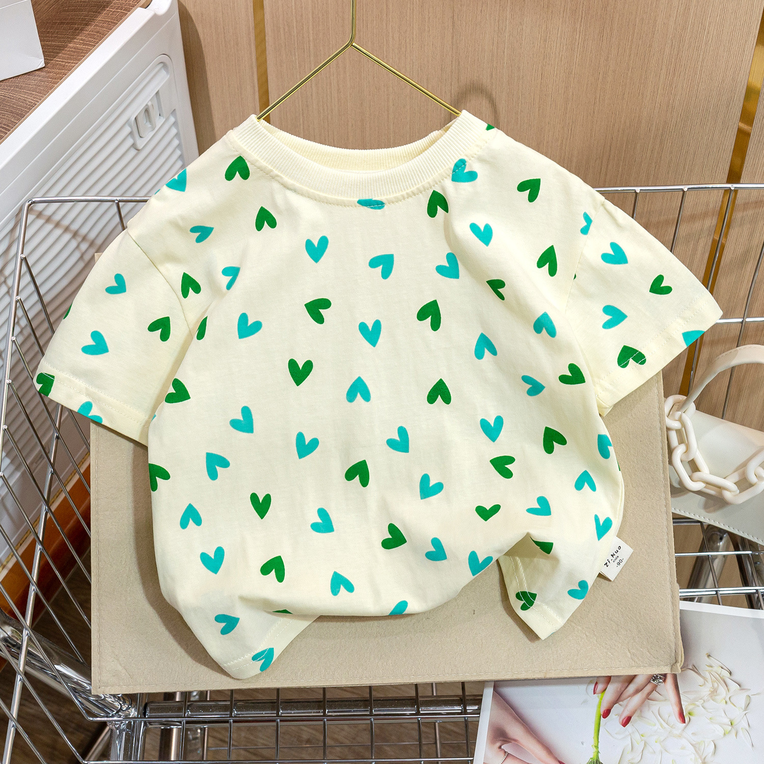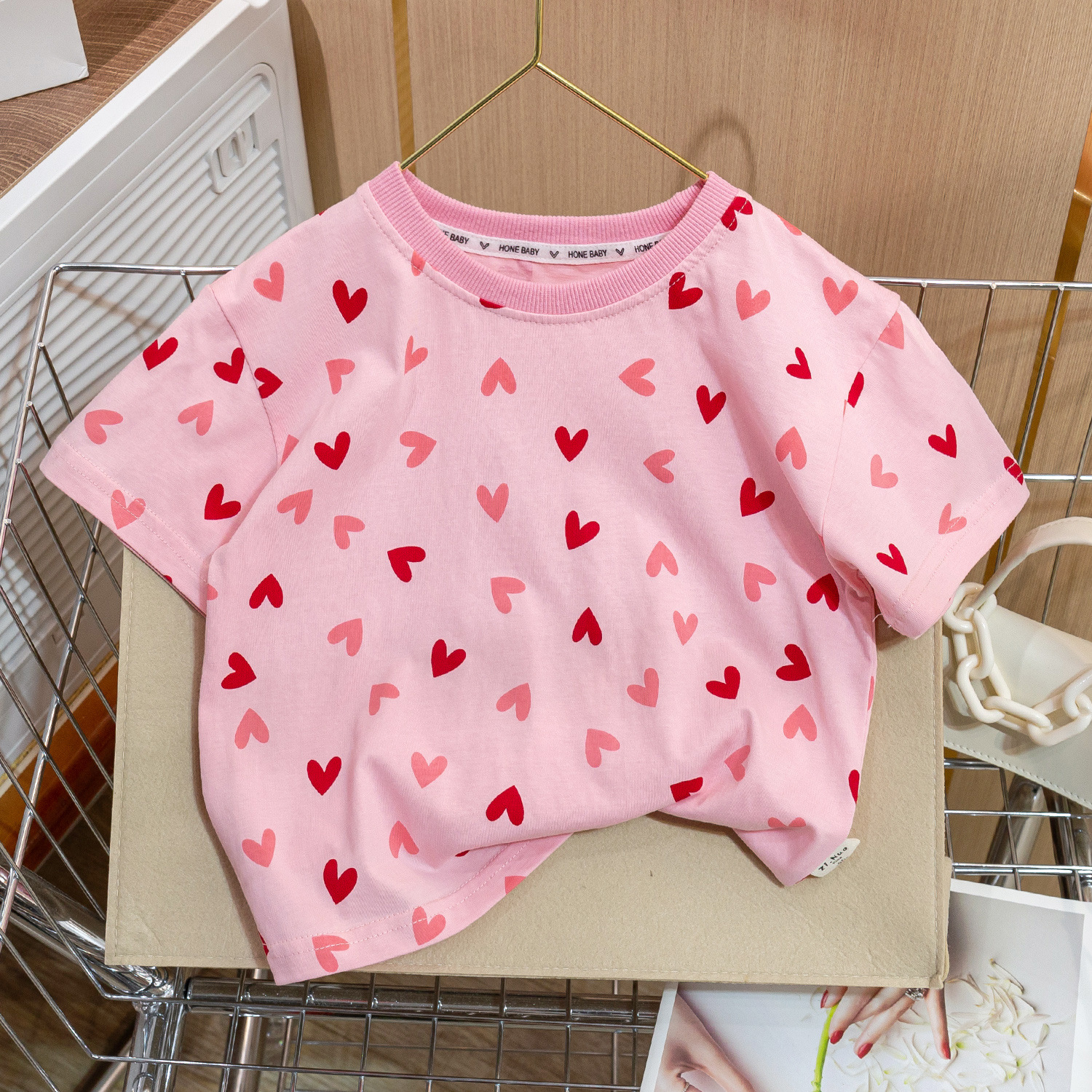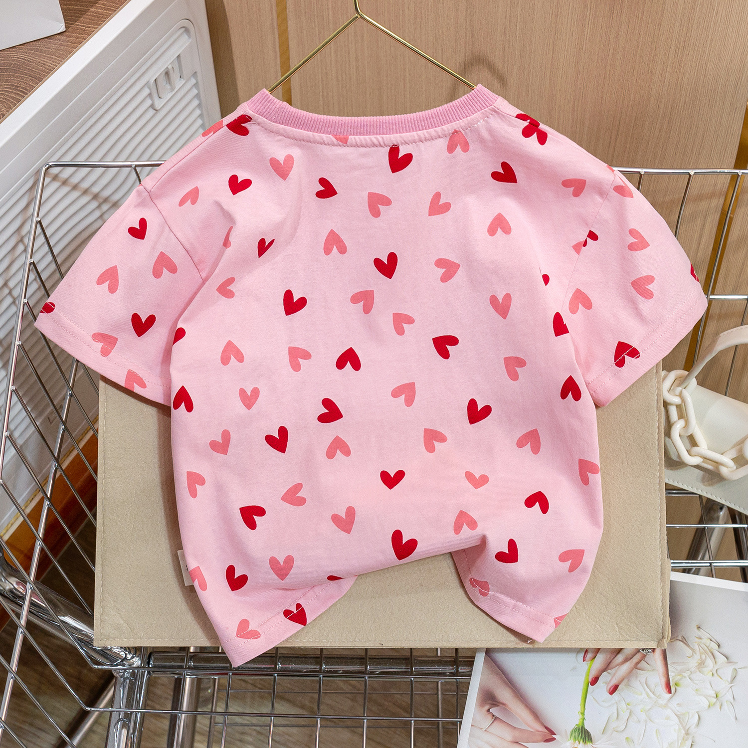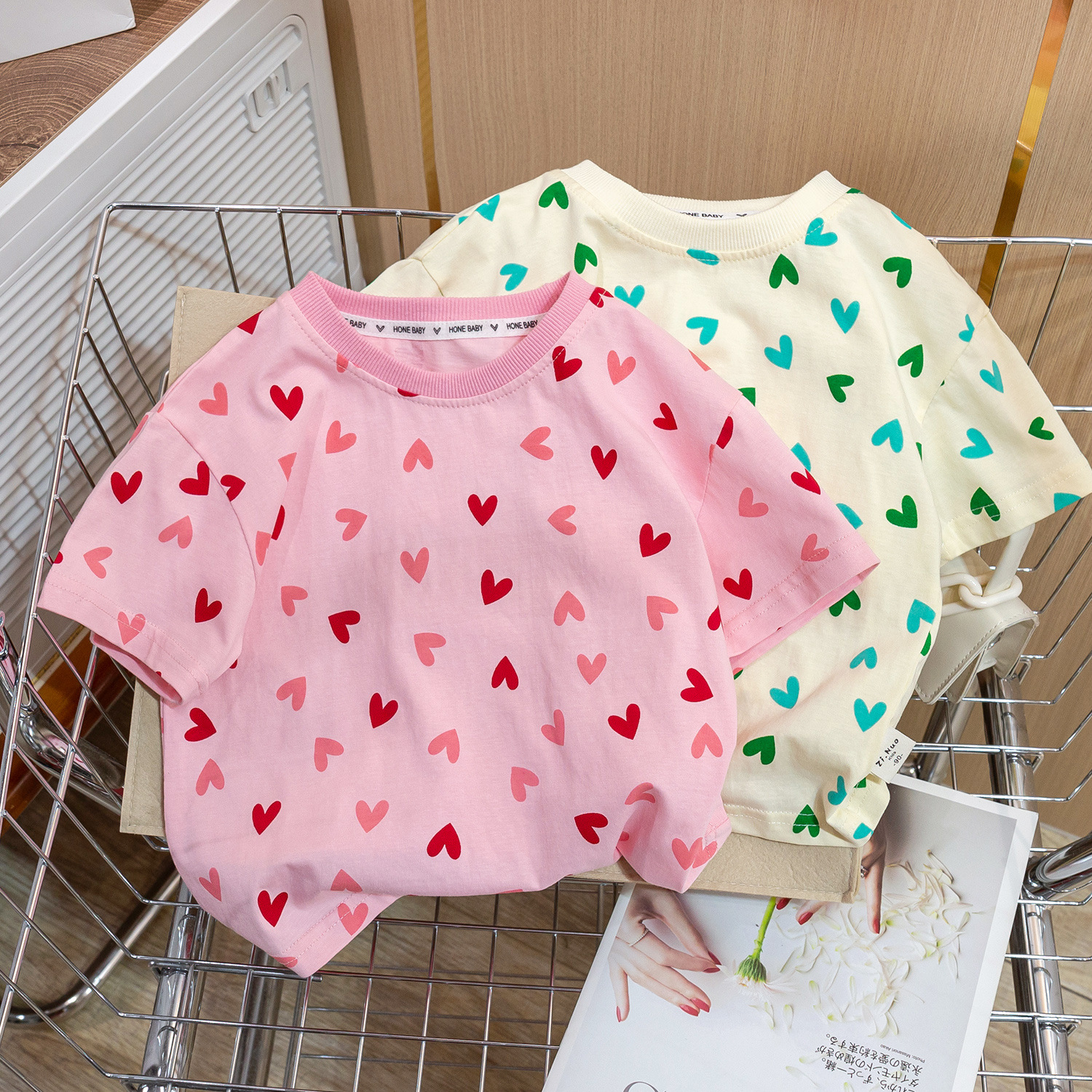 여아 한국식 심플 러브 프린트 반팔 티셔츠 여름 새로운 베이비 웨스턴스타일 스위트 루즈한 반팔 탑