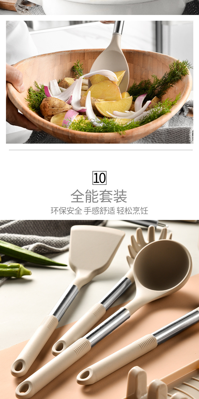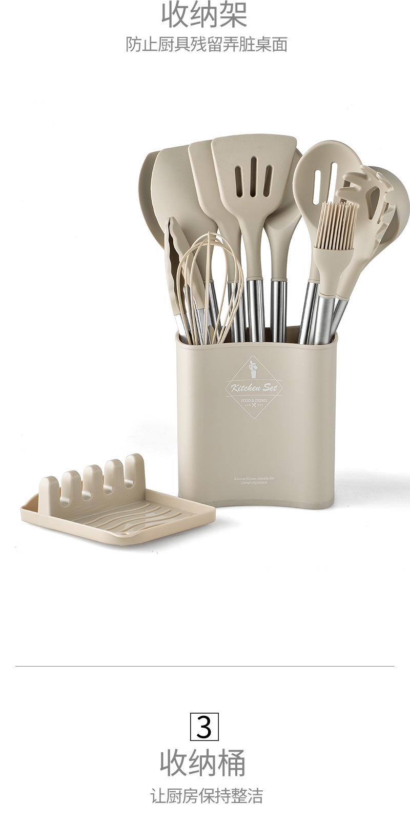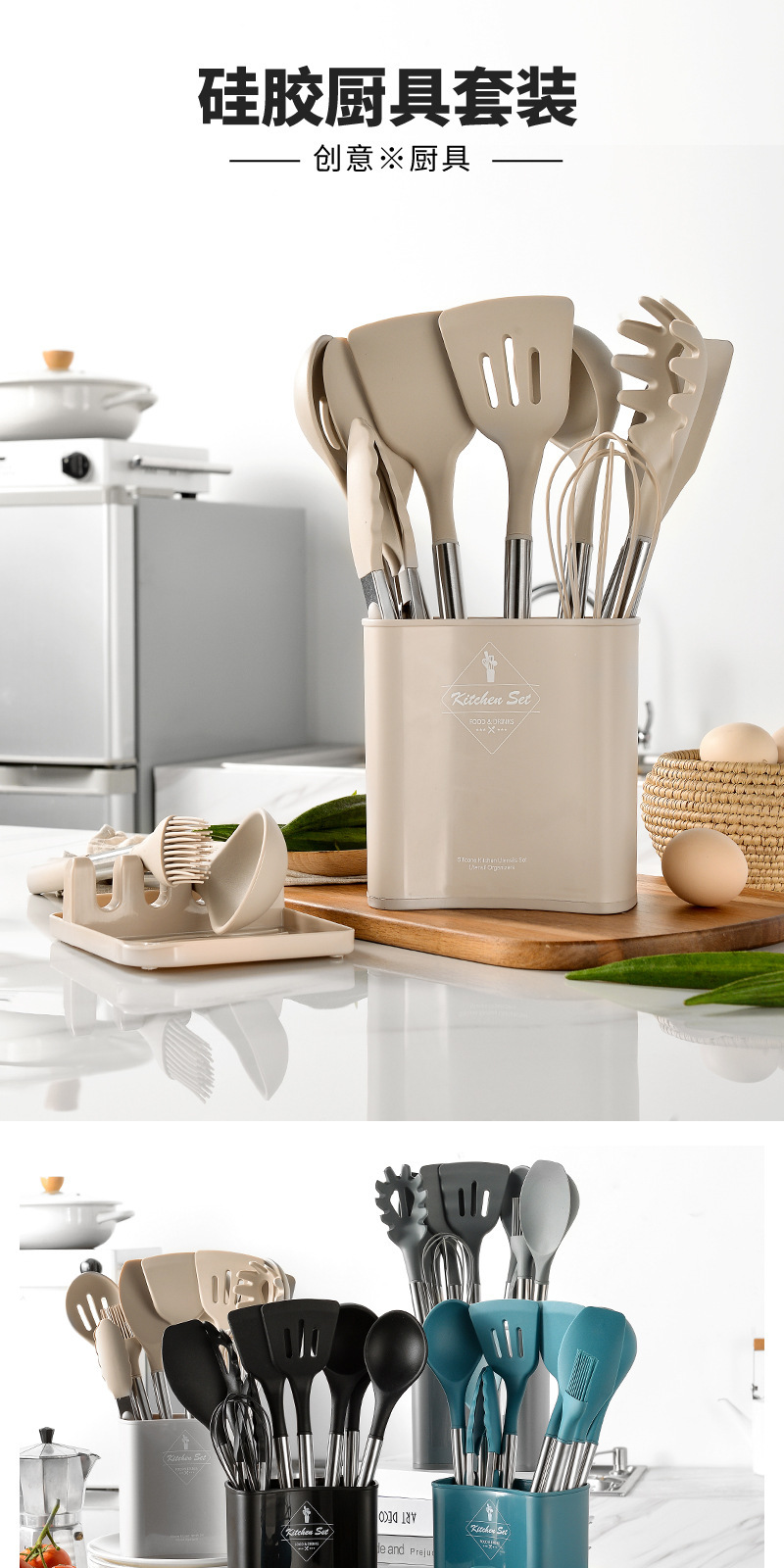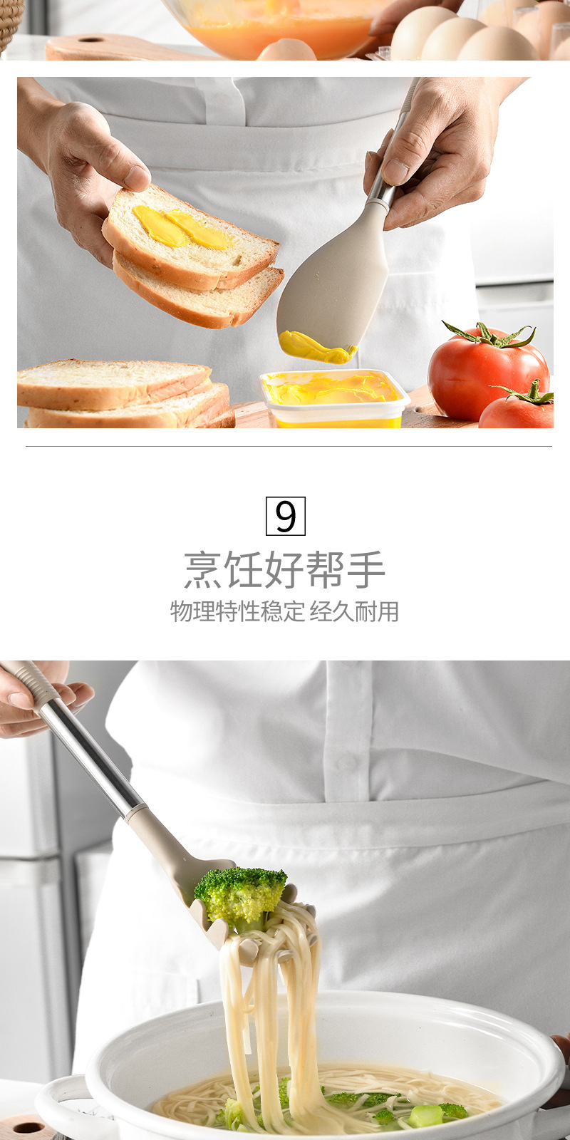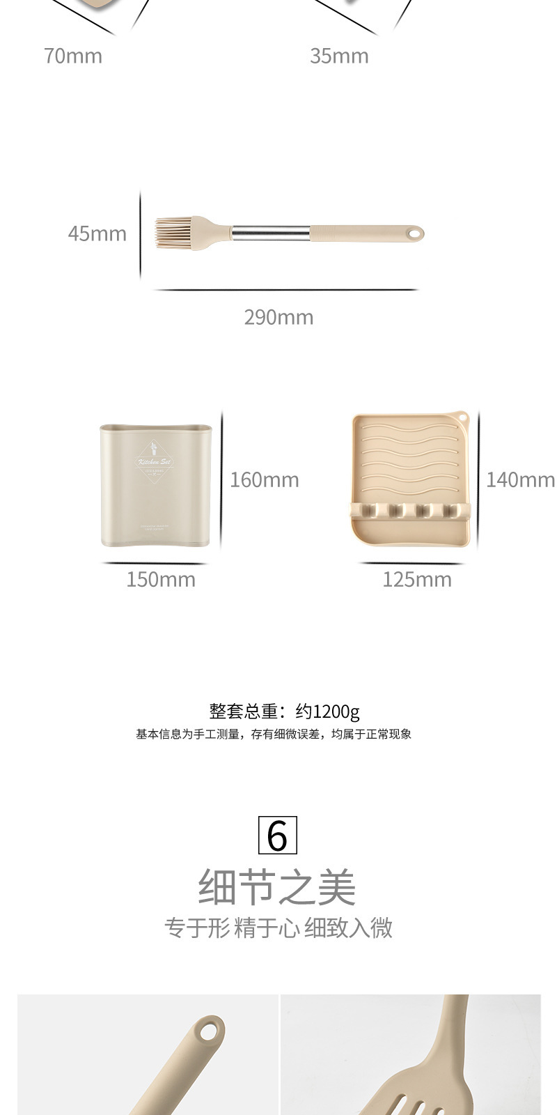 漏铲83g,汤勺87g,小汤勺81g,平头铲83g,刮刀108g,锅铲86g,食物夹118g,打蛋器39.5g,油刷59g,漏勺73g,意粉爪87g,收纳桶207g,收纳架62.5g,彩盒140g,整套约1315g(手工测量)