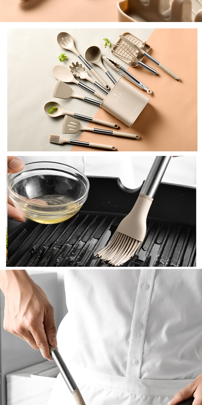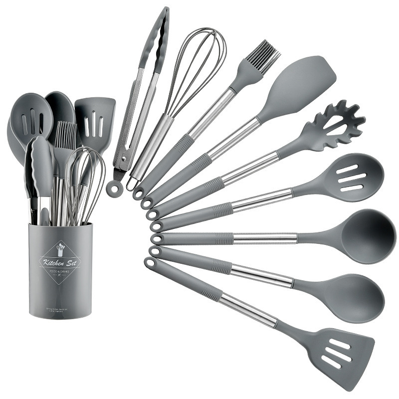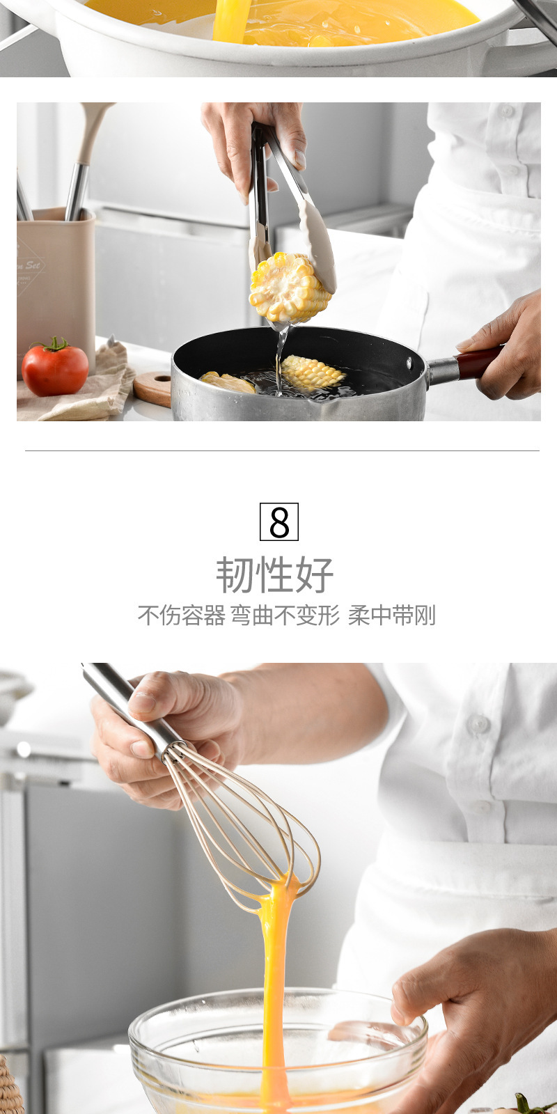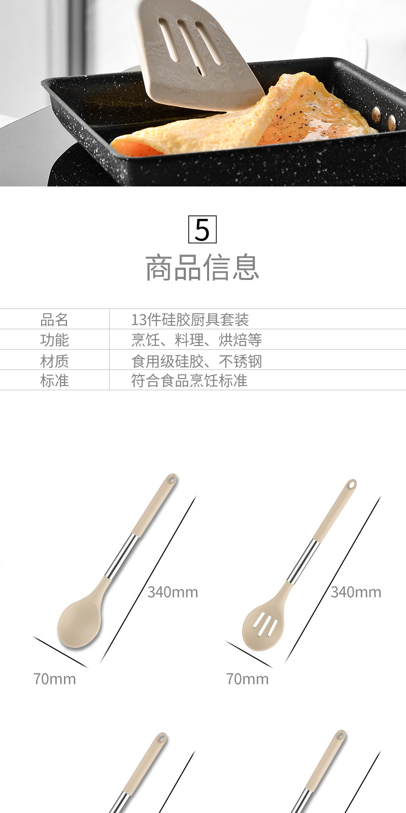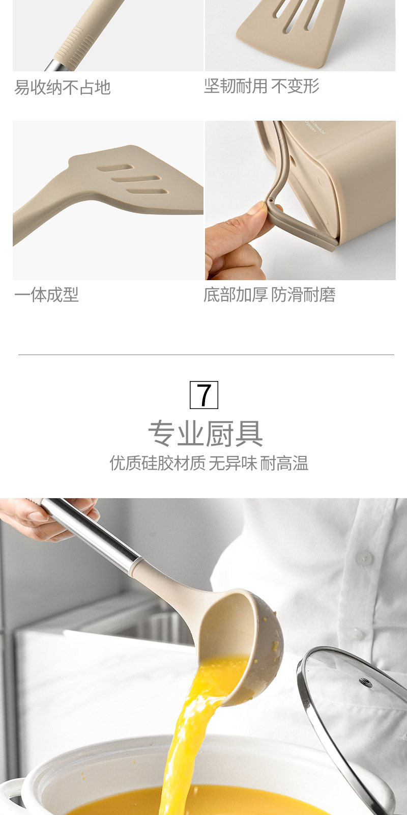 漏铲83g,汤勺87g,小汤勺81g,平头铲83g,刮刀108g,锅铲86g,食物夹118g,打蛋器39.5g,油刷59g,漏勺73g,意粉爪87g,收纳桶207g,收纳架62.5g,彩盒140g,整套约1315g(手工测量)