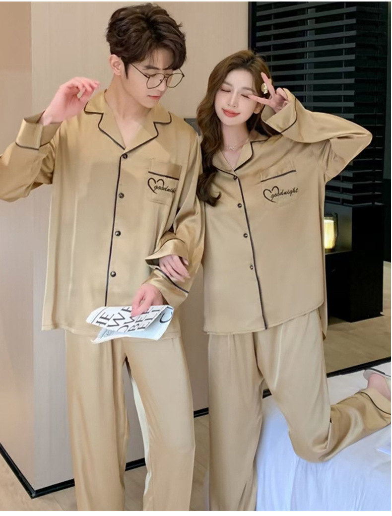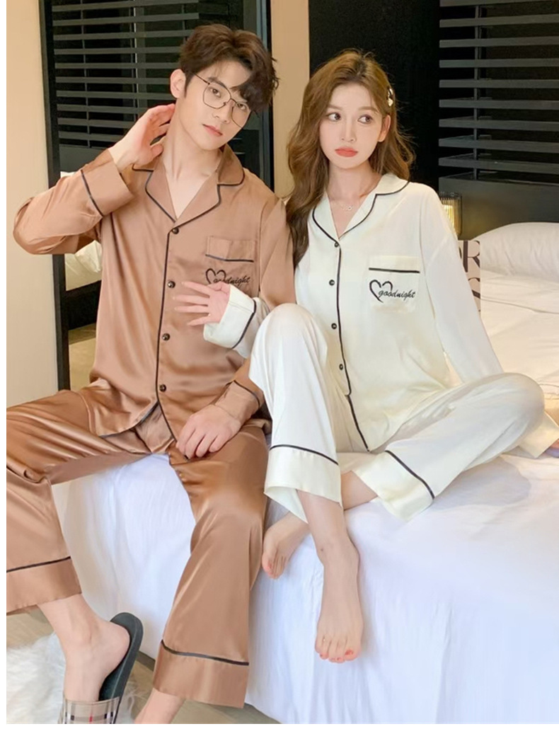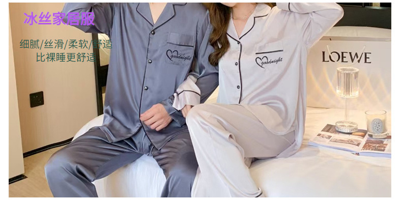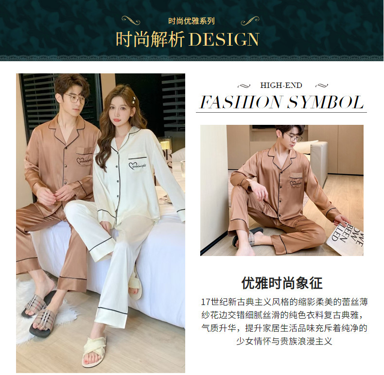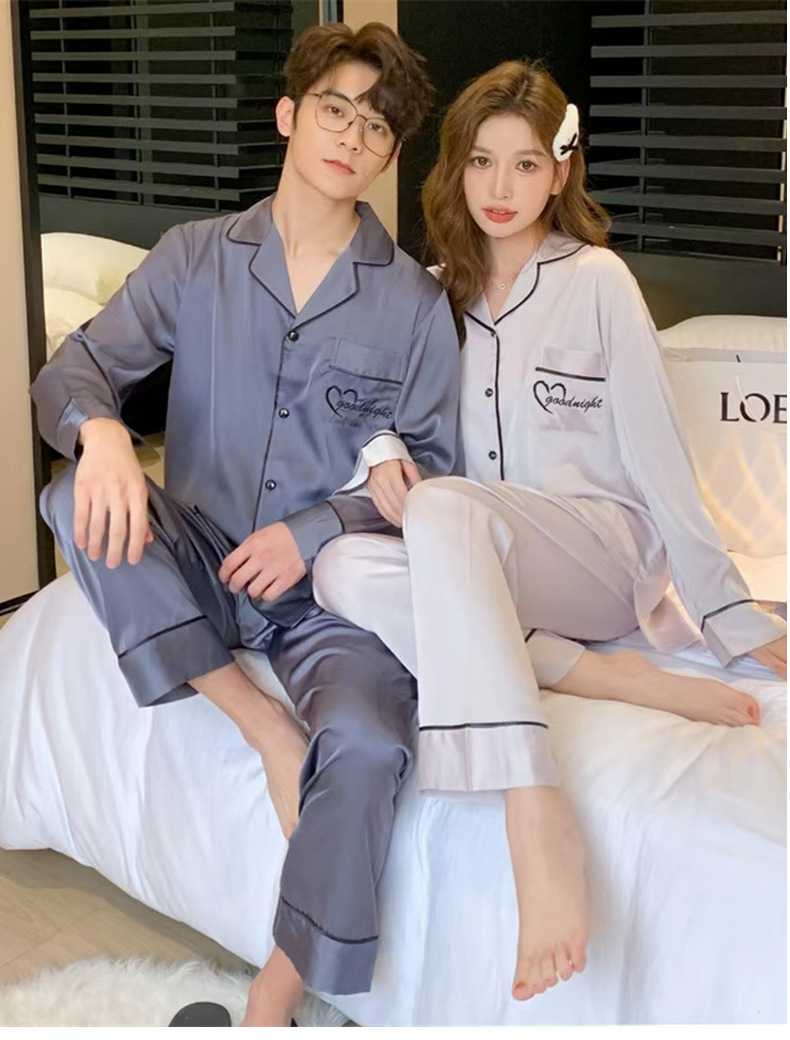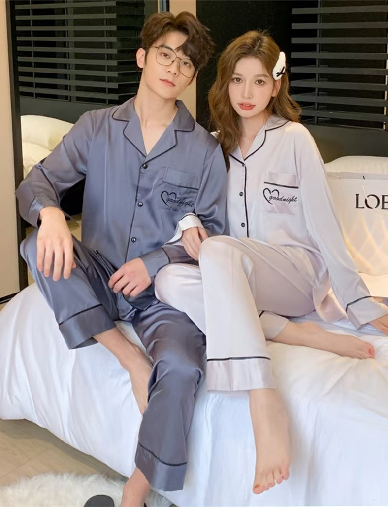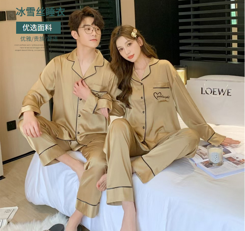 커플 잠옷 여성용 아이스 실크 얇은 긴팔 바지 투피스 세트 2023 새로운 남성 의상 가정복스토어 가기