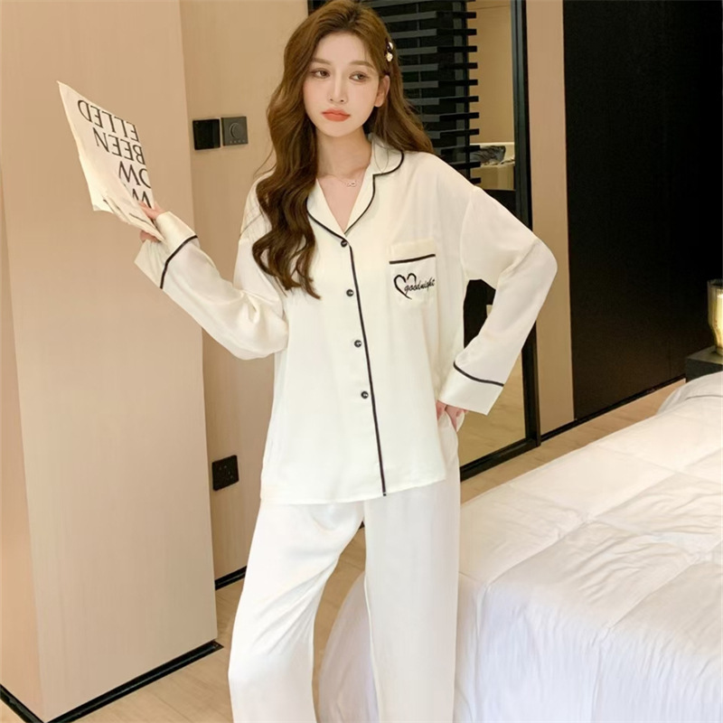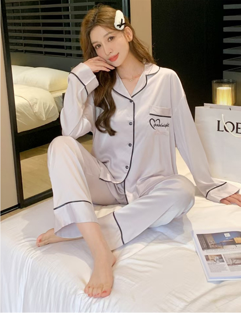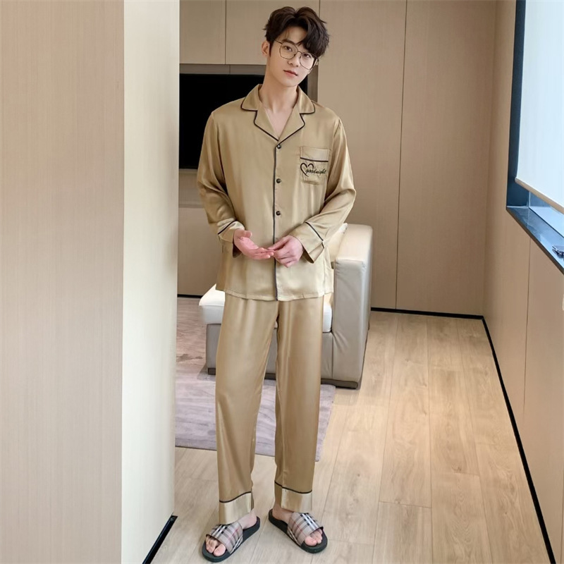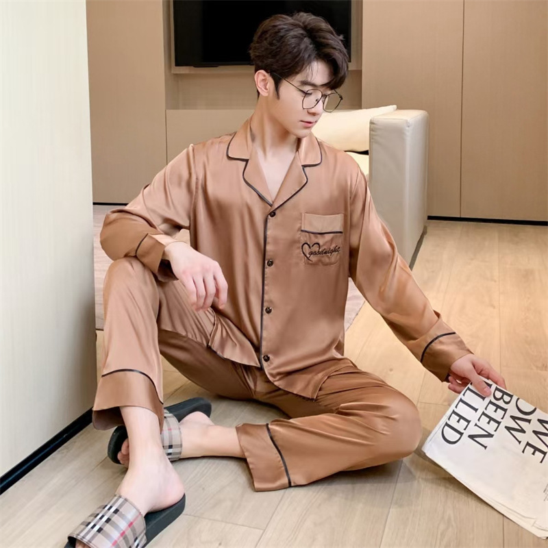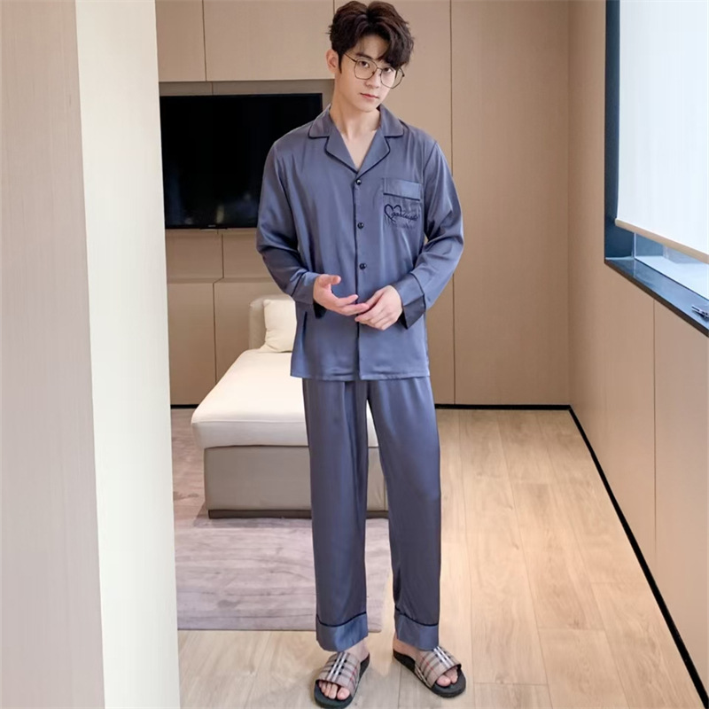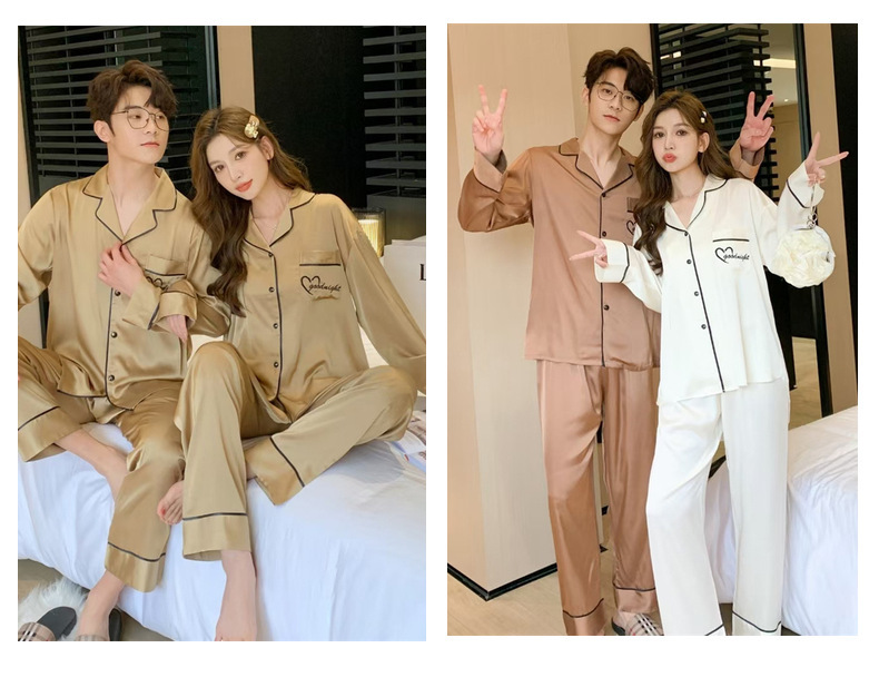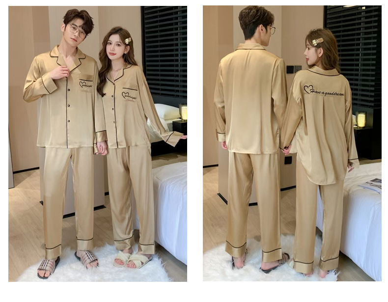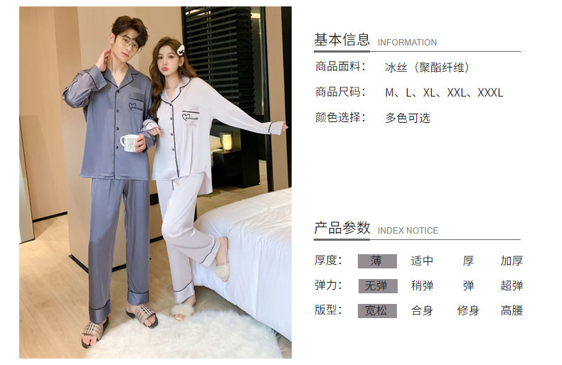 커플 잠옷 여성용 아이스 실크 얇은 긴팔 바지 투피스 세트 2023 새로운 남성 의상 가정복스토어 가기