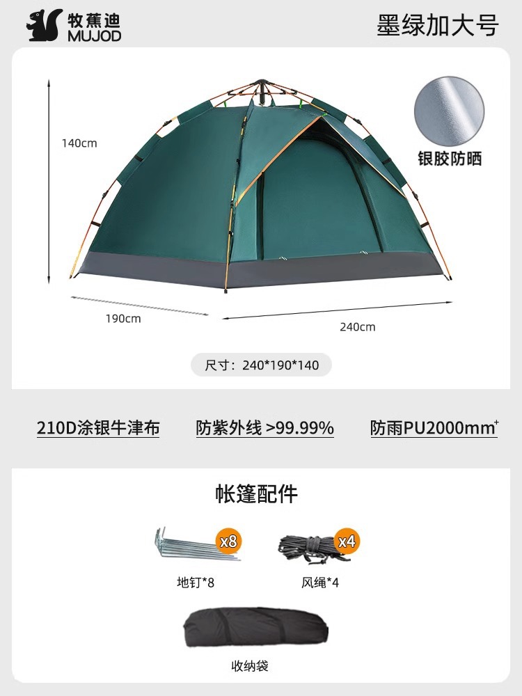 • 240*190*140cm 단층 짙은 녹색 텐트 초대형