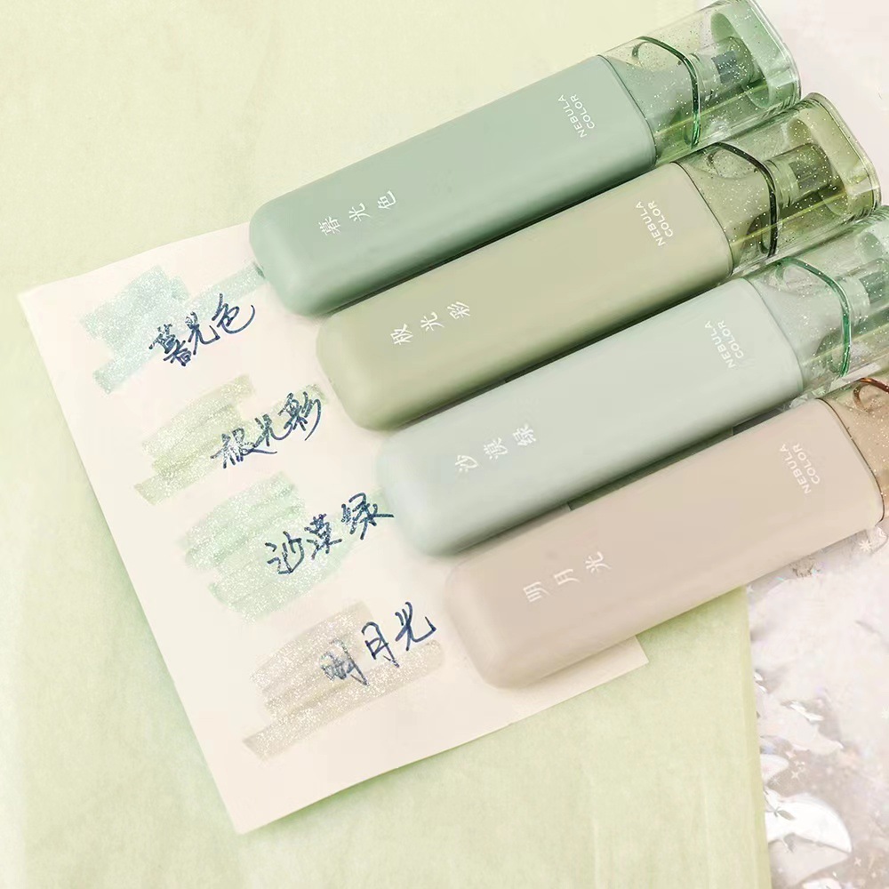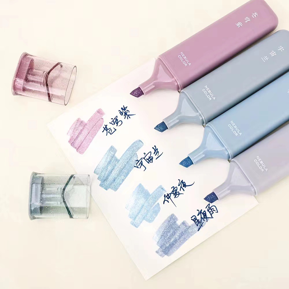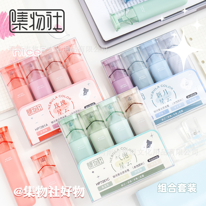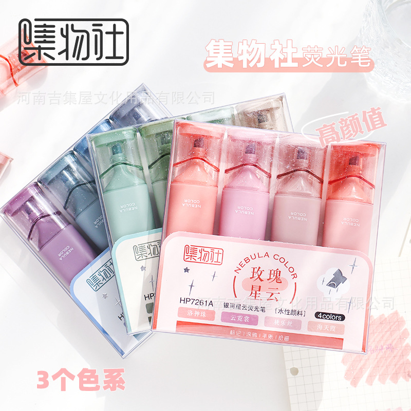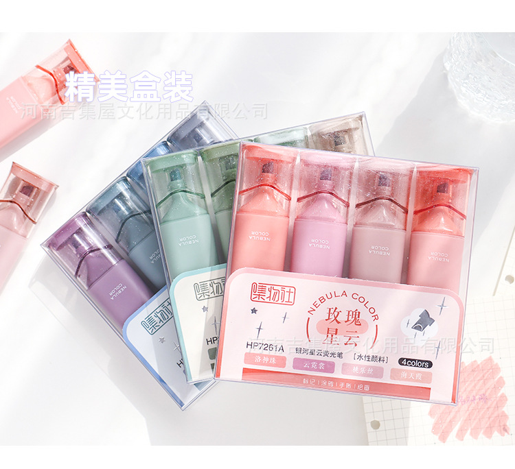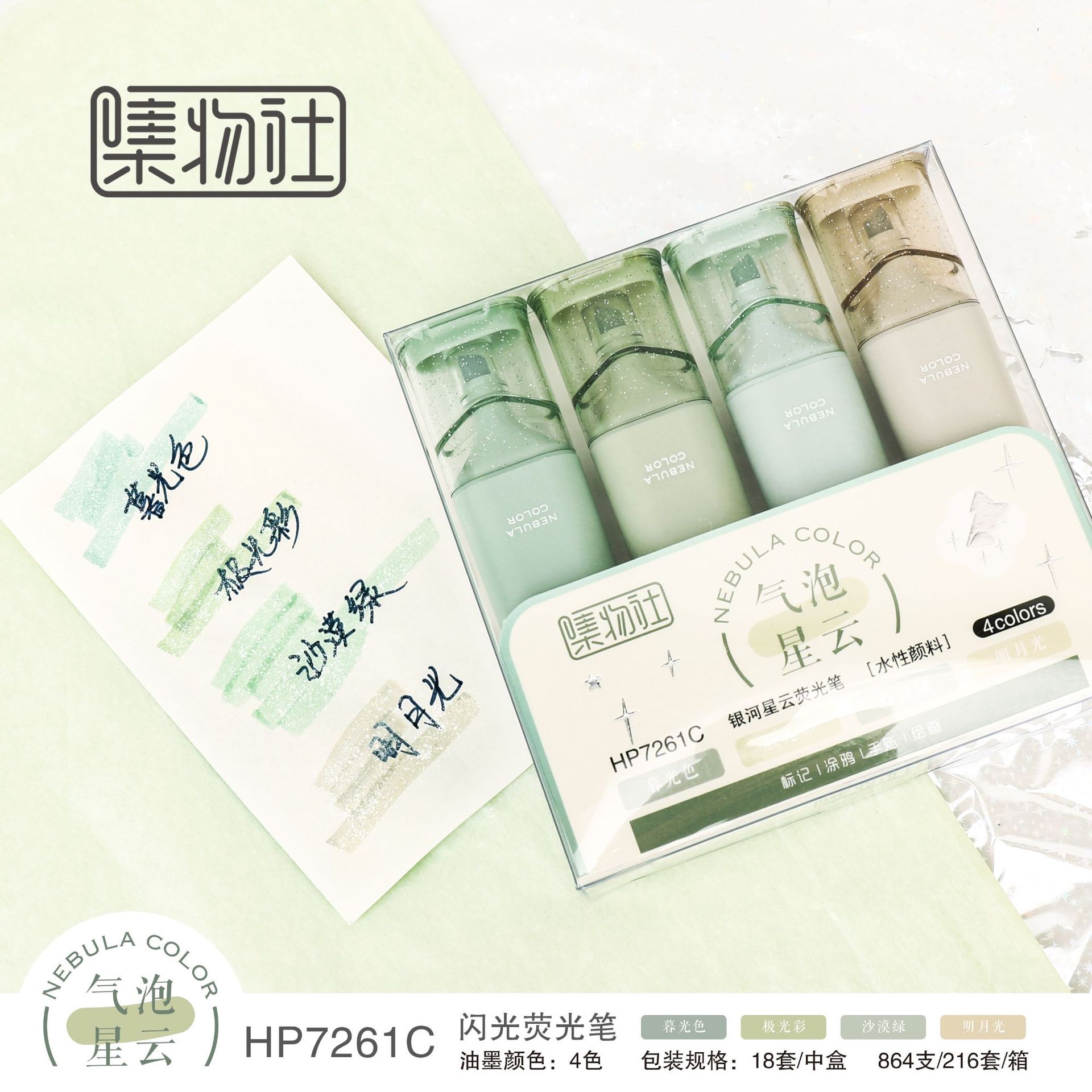 集物社—银河星云闪光荧光笔。三种色系HP7261A玫瑰星云/HP7261B新月星云/HP7261C气泡星云;包装规格:4支/套,18套/中包,216套/箱,全新12色超闪光墨水,满足不同渠道需求。闪粉荧光笔,落笔如银河!