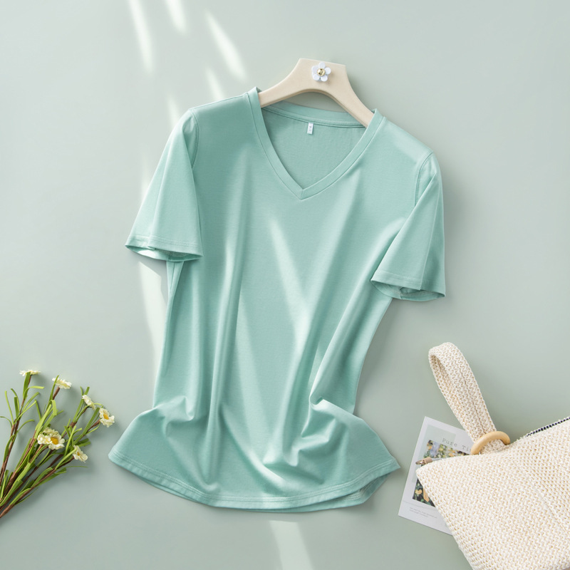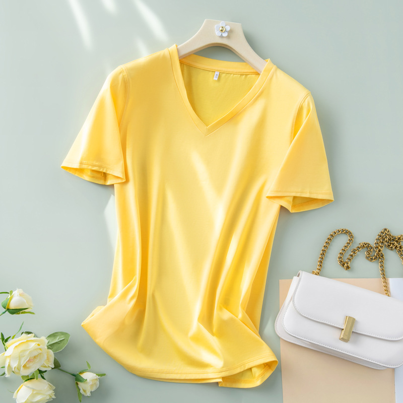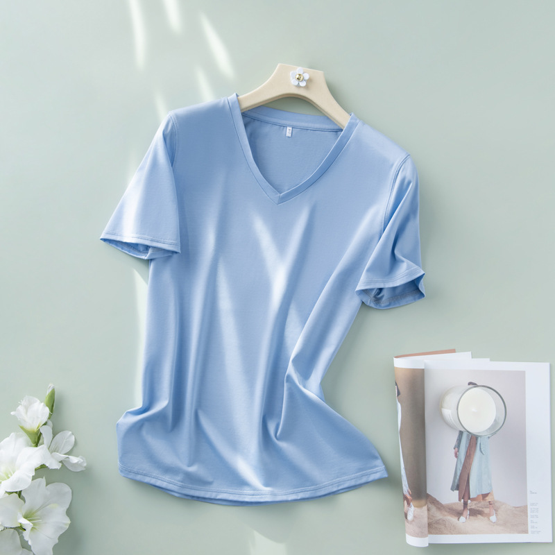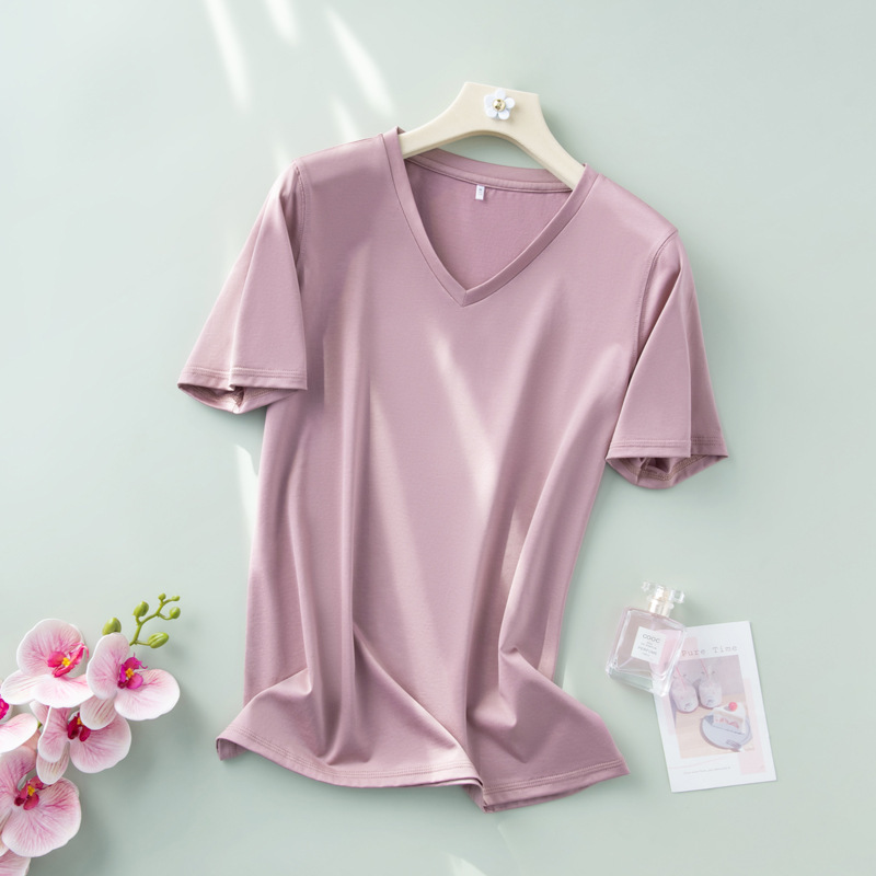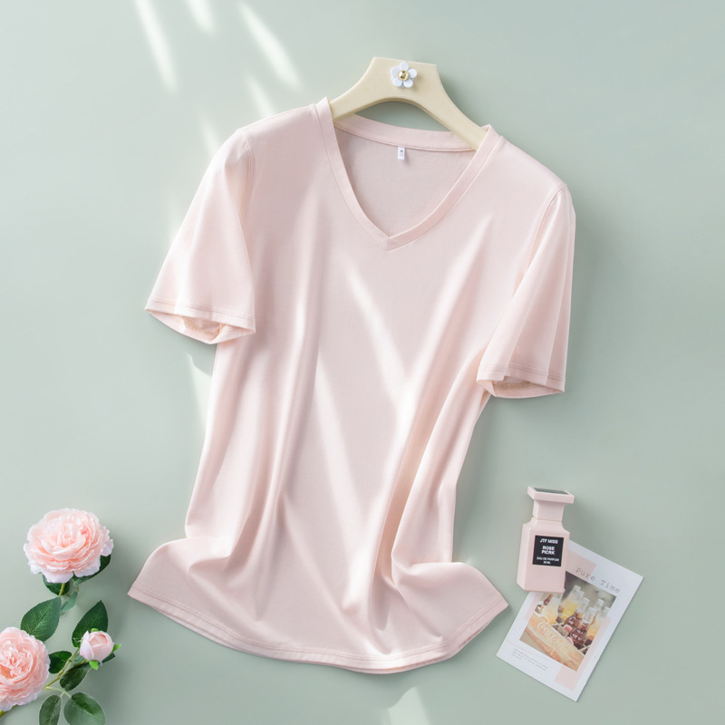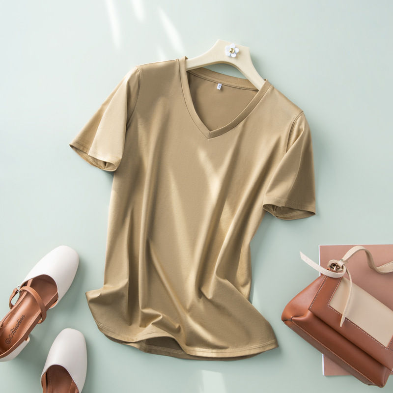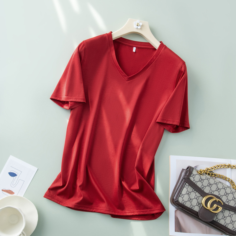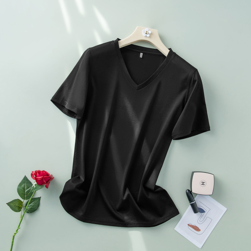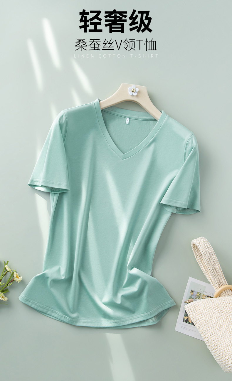라이트 럭셔리 뽕나무 실크 반팔 티셔츠 여성용 올매치 브이넥 탑 2023 여름 신상 아이스 쿨 브이넥 반팔 베이스 셔츠
