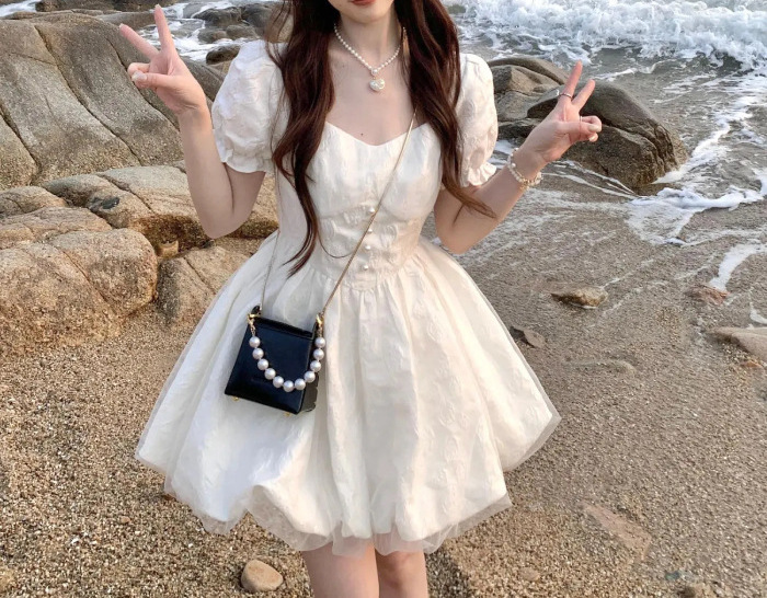法式甜辣小众高级网纱拼接泡泡袖连衣裙女学生超仙花苞裙公主女装====侧边有拉链