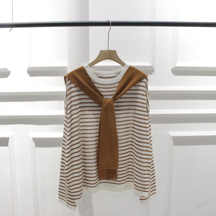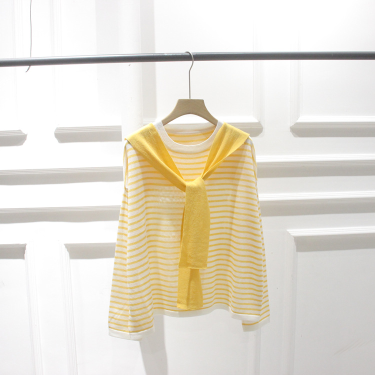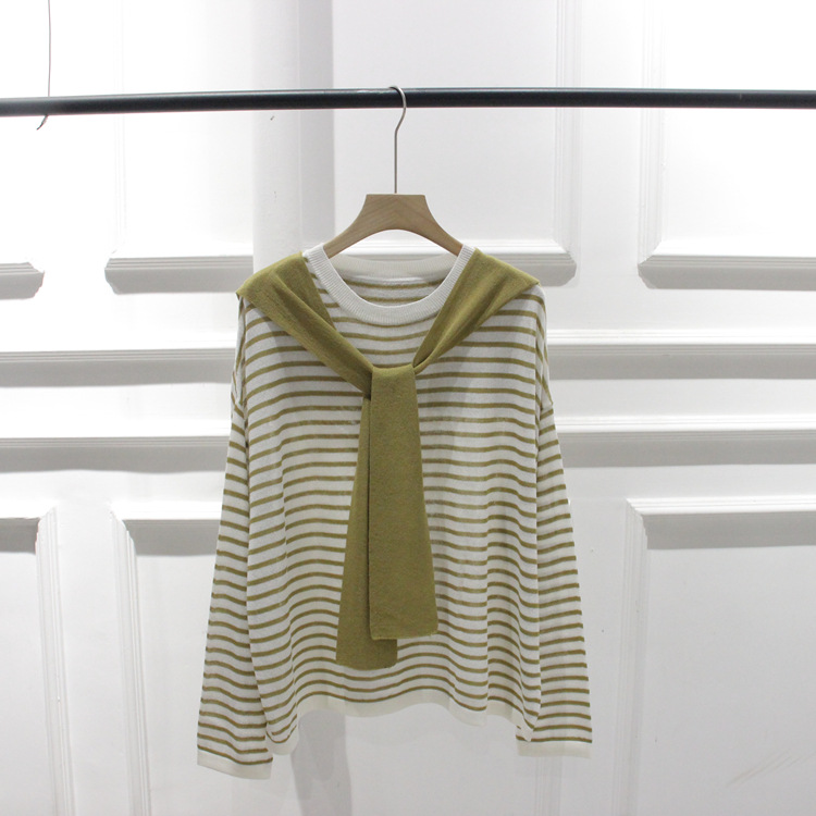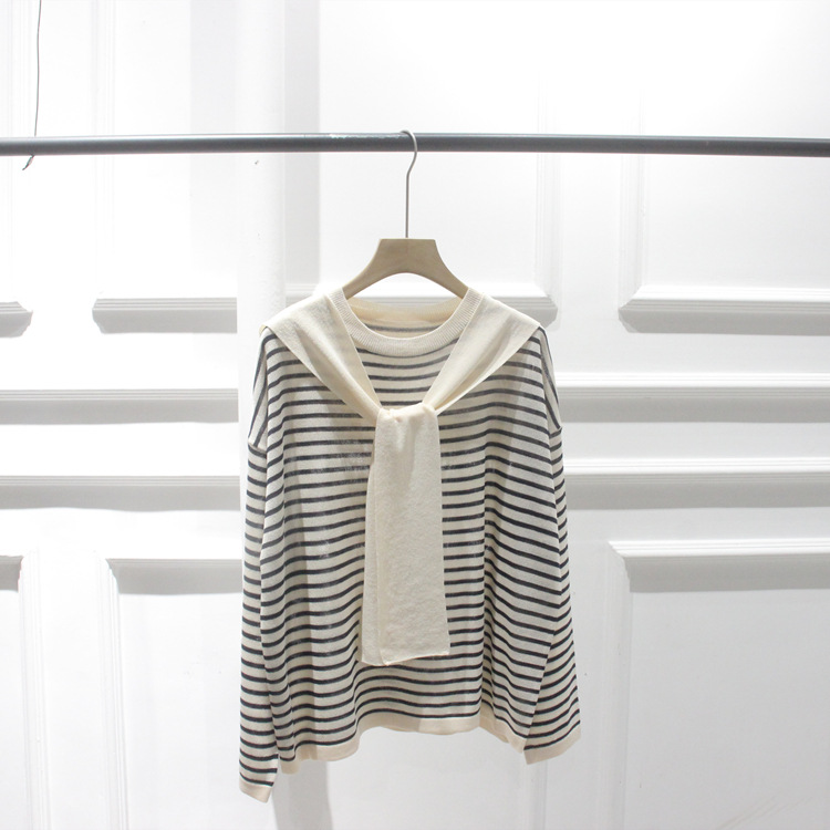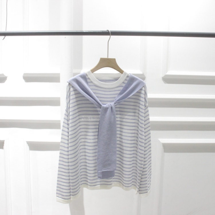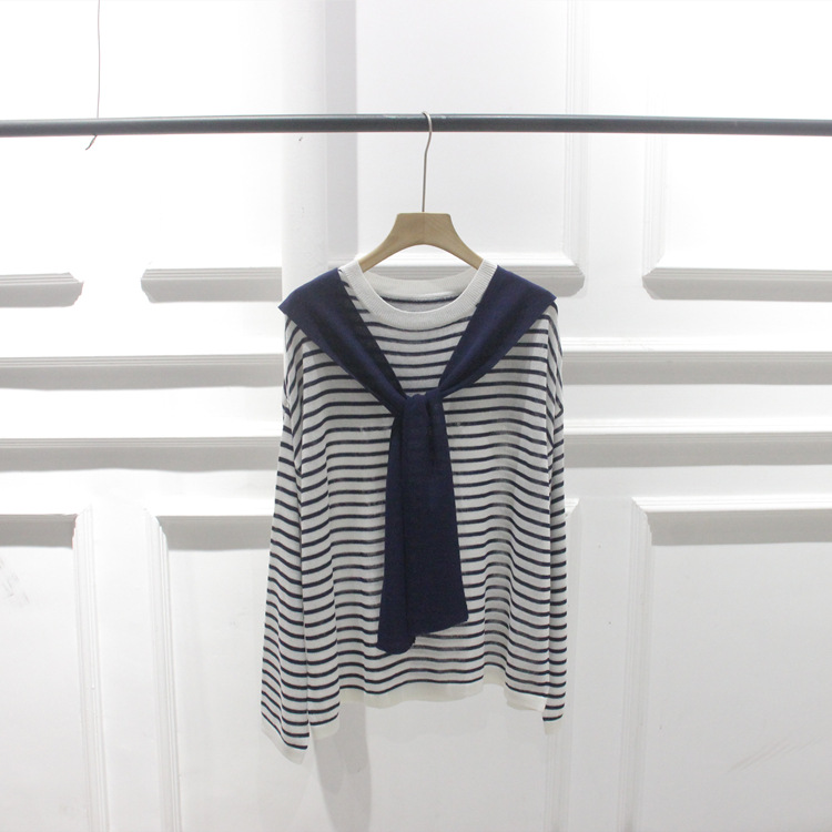 한국 주문 봄과 여름 새 둥근 목 줄무늬 가짜 투피스 니트웨어 레이스 풀오버 여성스토어 가기