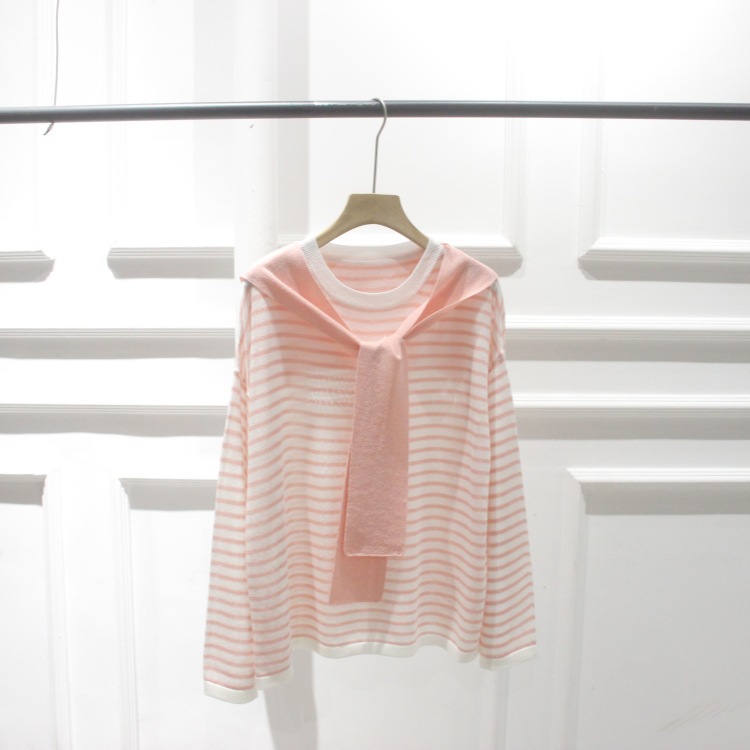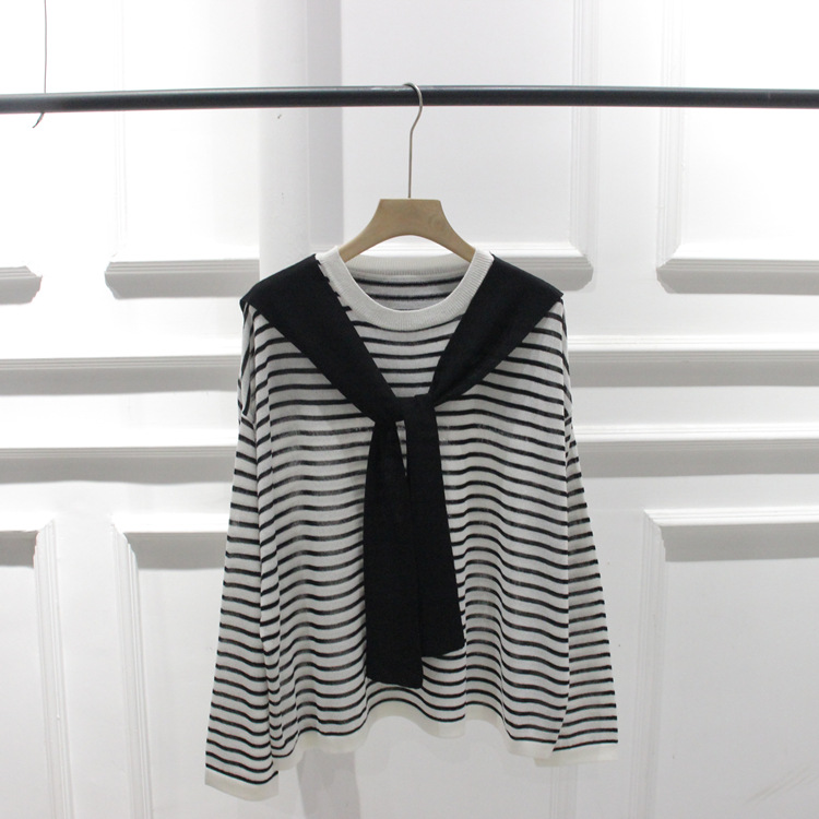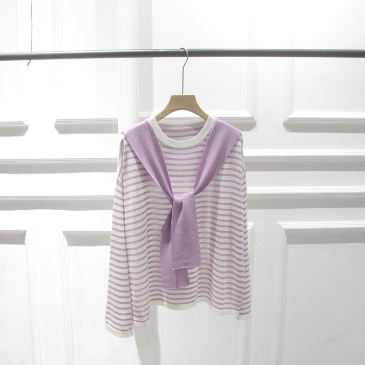 한국 주문 봄과 여름 새 둥근 목 줄무늬 가짜 투피스 니트웨어 레이스 풀오버 여성