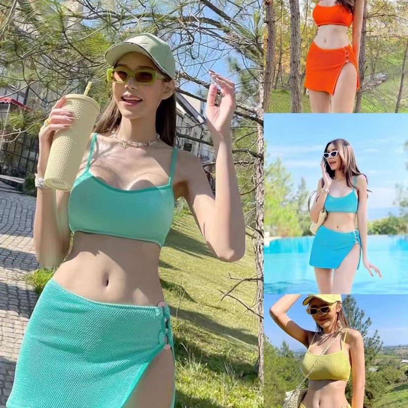 소스 공장 새로운 캔디 컬러 비키니 3 피스 세트 인 스타일 휴가 온천 스커트 사진 분할 수영복스토어 가기