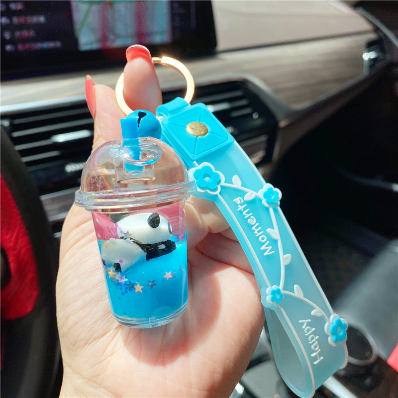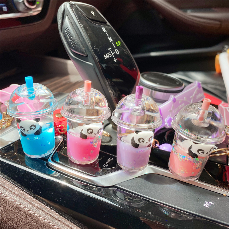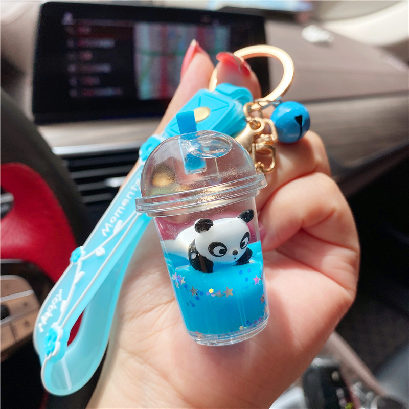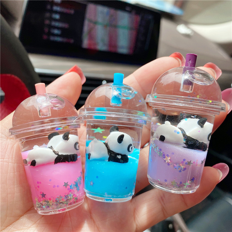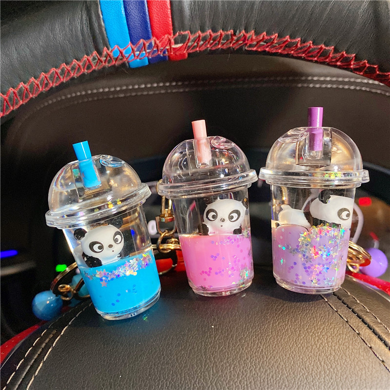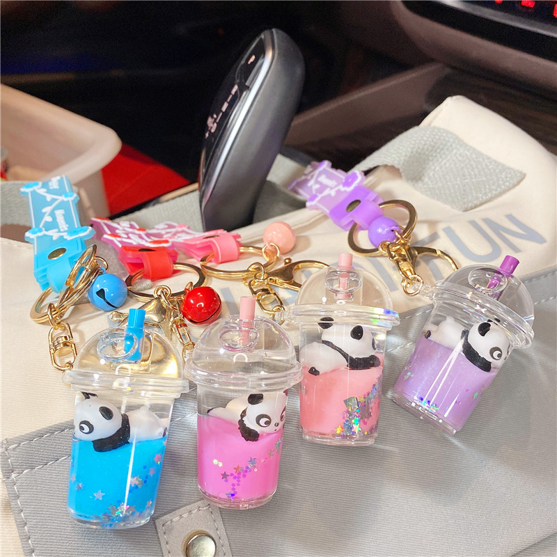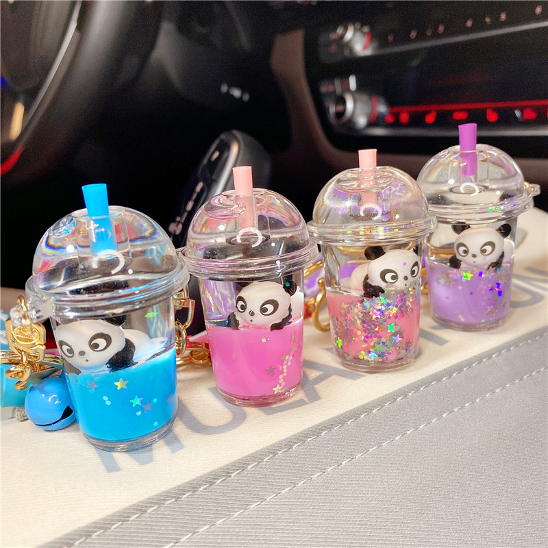 소녀의 마음에 창조적 인 인터넷 연예인 귀여운 팬더 기름 가득 우유 차 컵 떠 다니는 병 열쇠 고리 펜던트 quicksand 펜던트