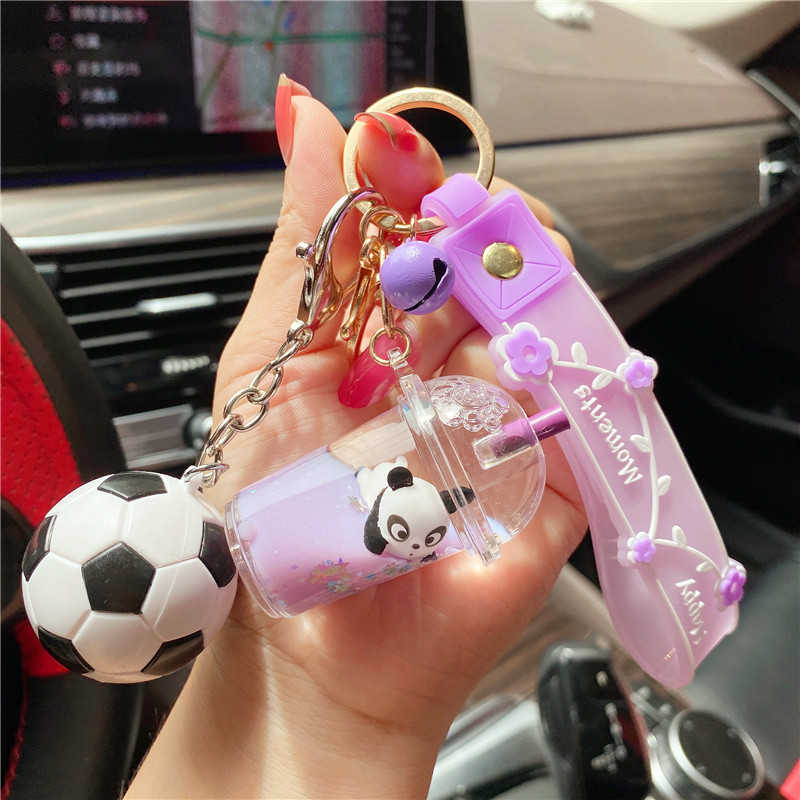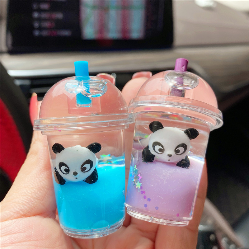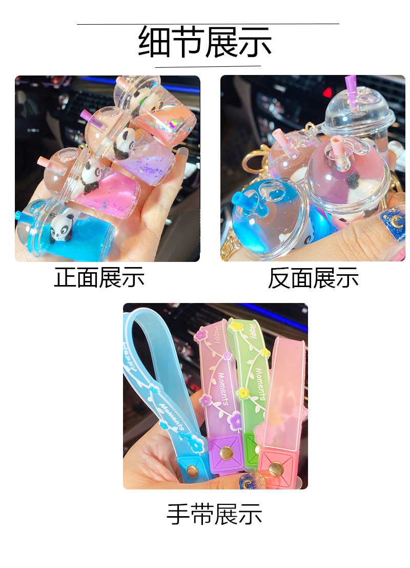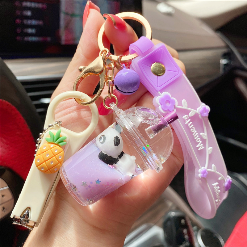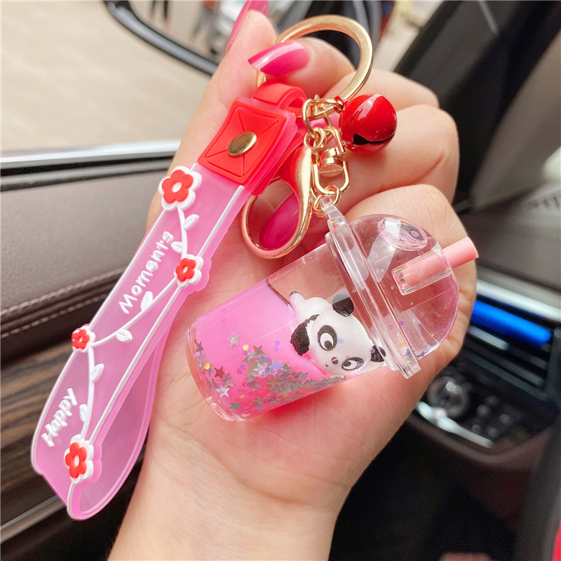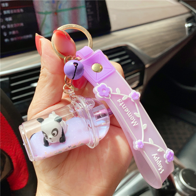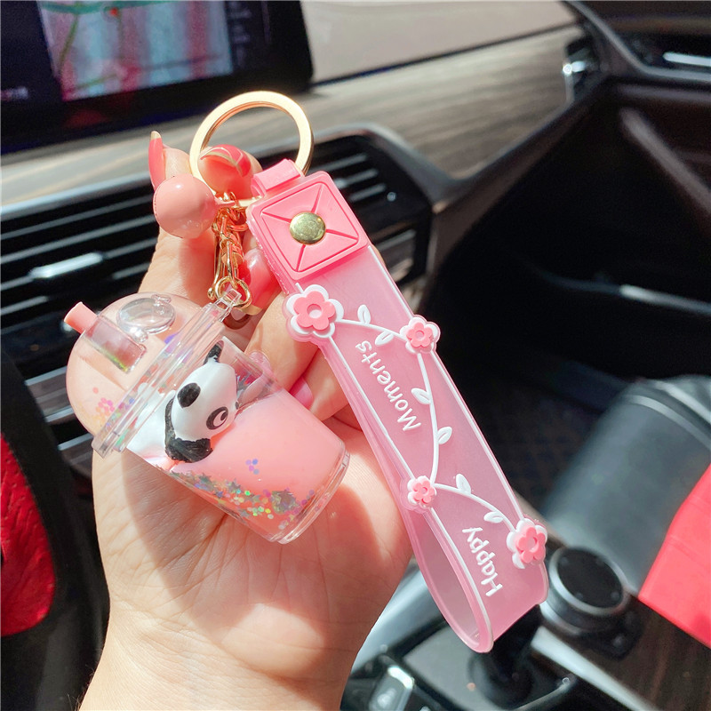 소녀의 마음에 창조적 인 인터넷 연예인 귀여운 팬더 기름 가득 우유 차 컵 떠 다니는 병 열쇠 고리 펜던트 quicksand 펜던트