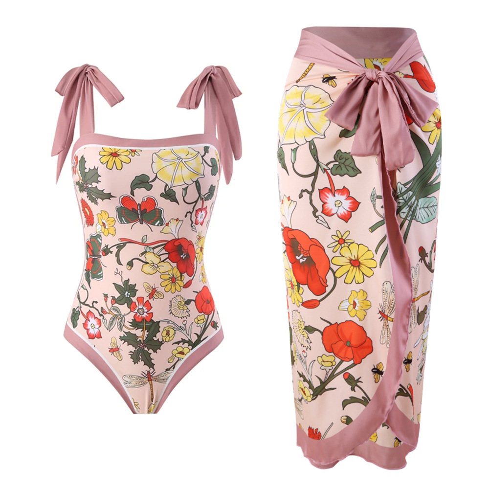 2025现货欧美性感连体泳衣拼色印花两件套涤纶裙热卖爆款泳装套装