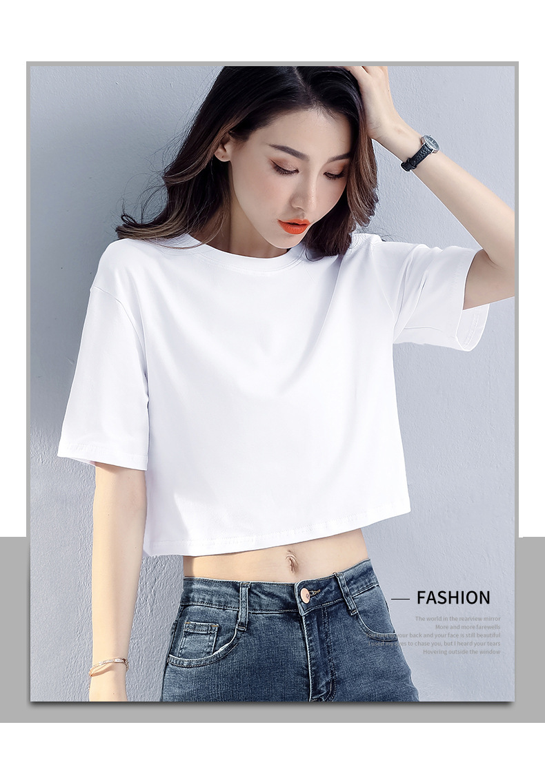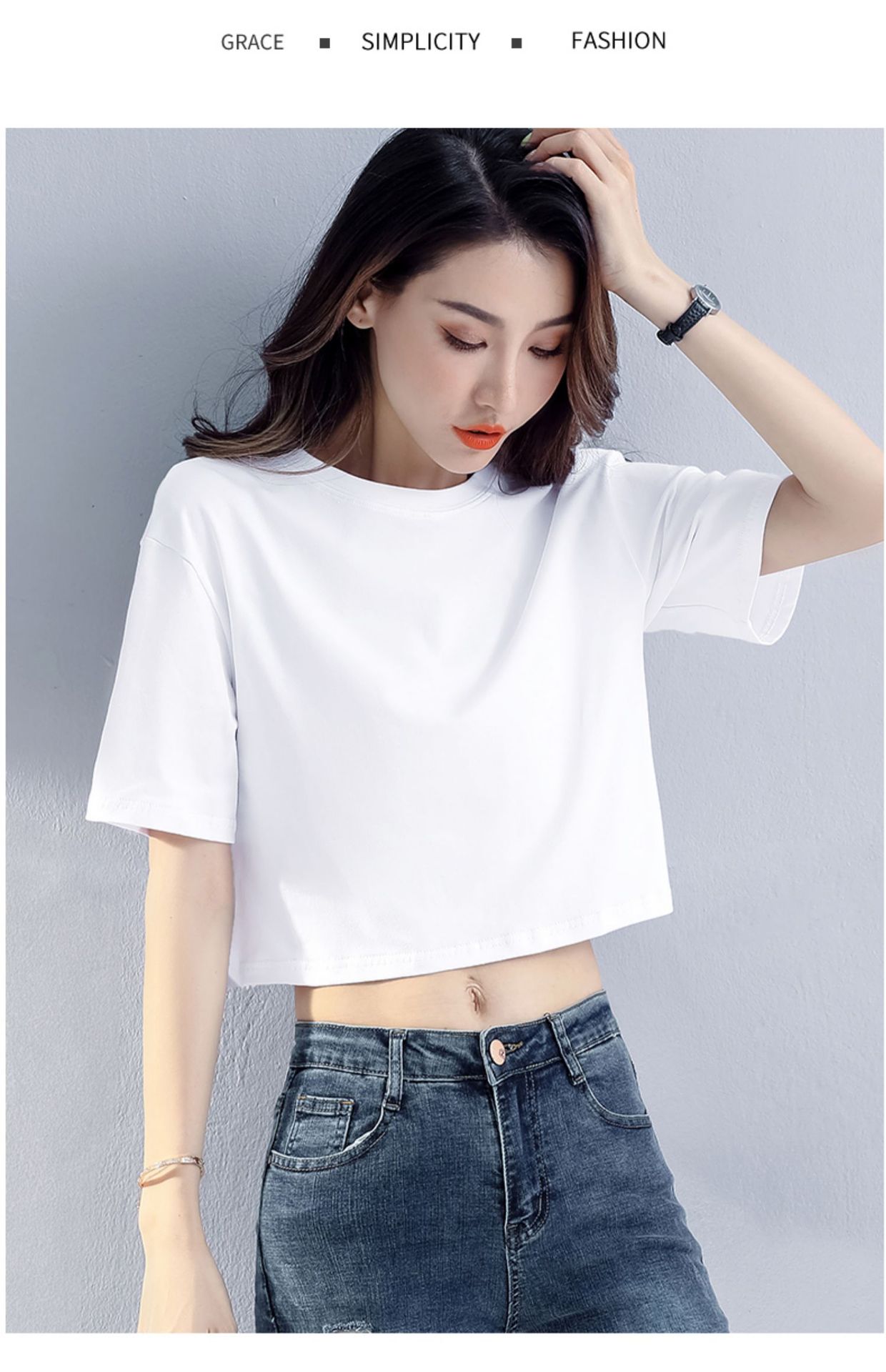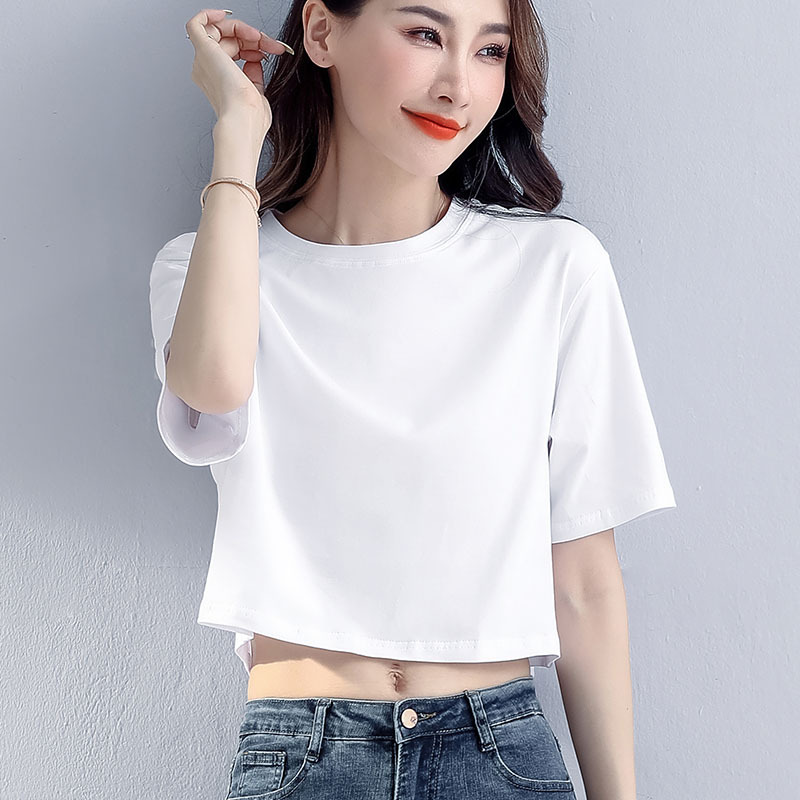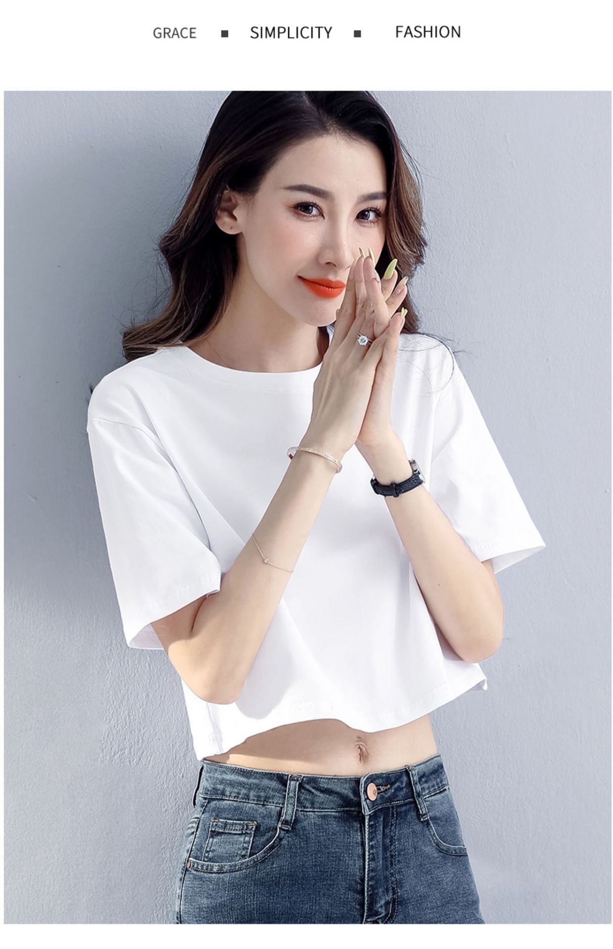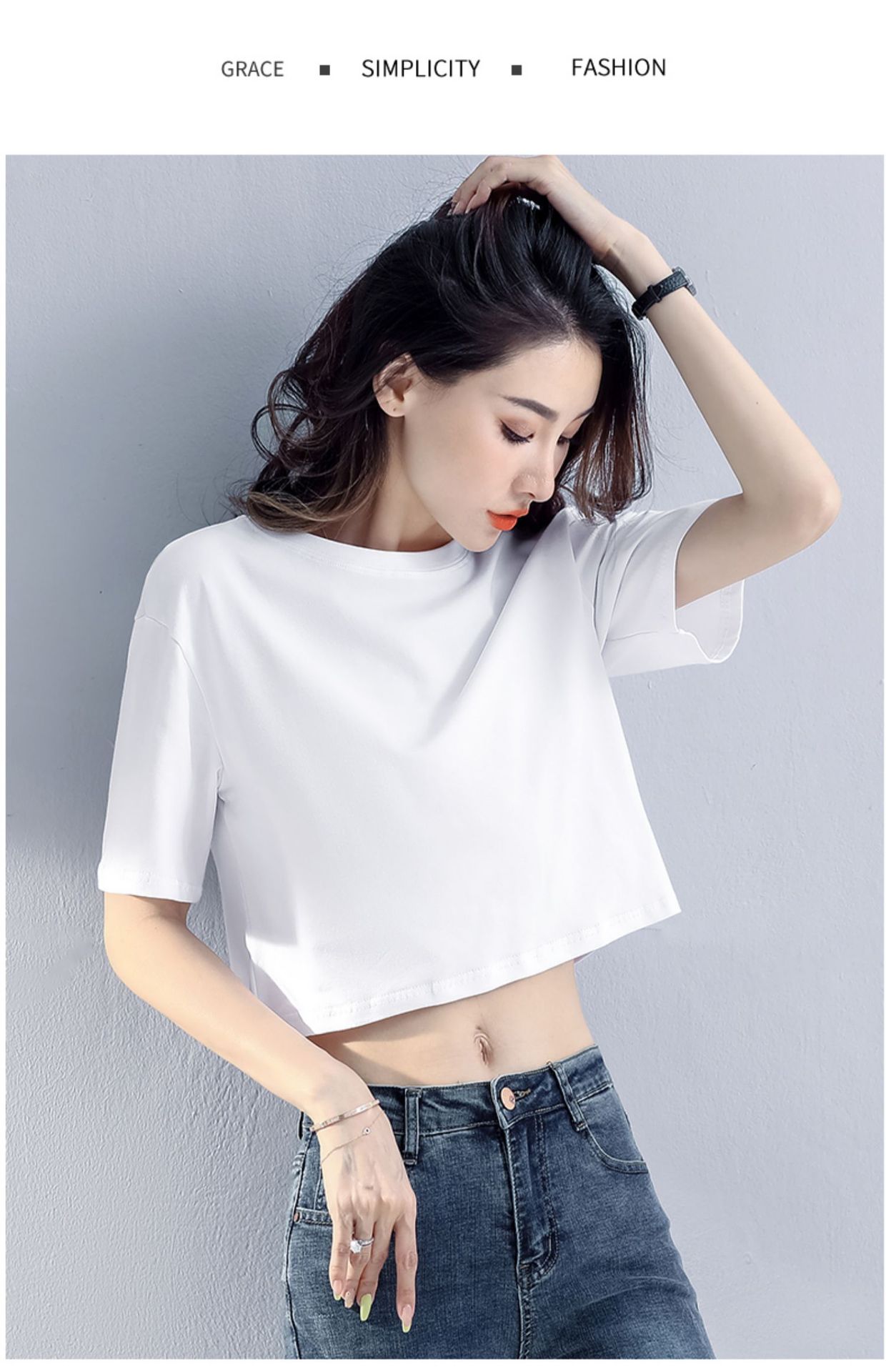 여름 여성용 루즈한 배꼽 노출 반팔 티셔츠, 순면 하이웨이스트 배꼽 노출 여성용 반팔 흰색 티셔츠 탑스토어 가기