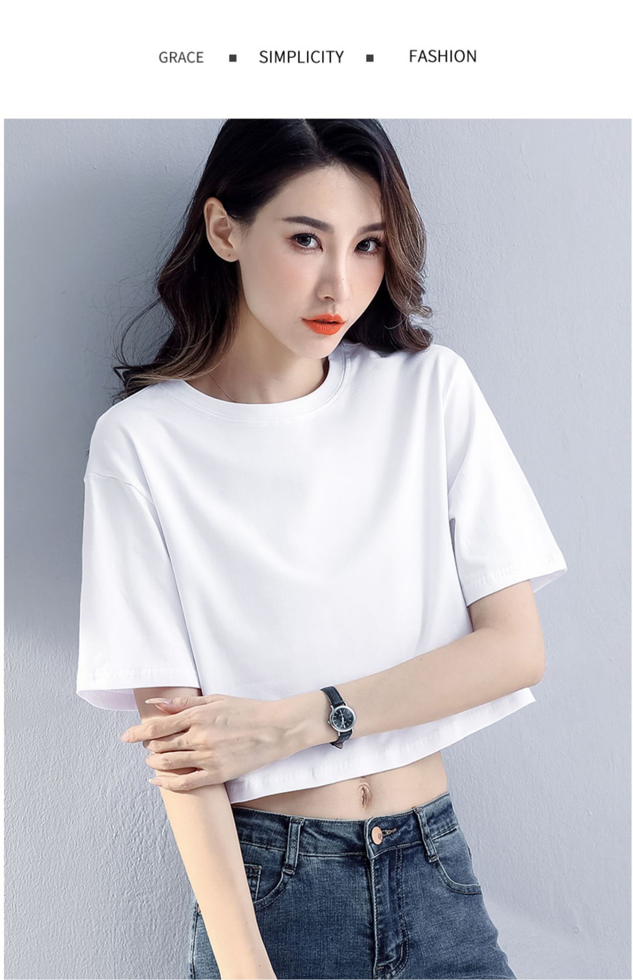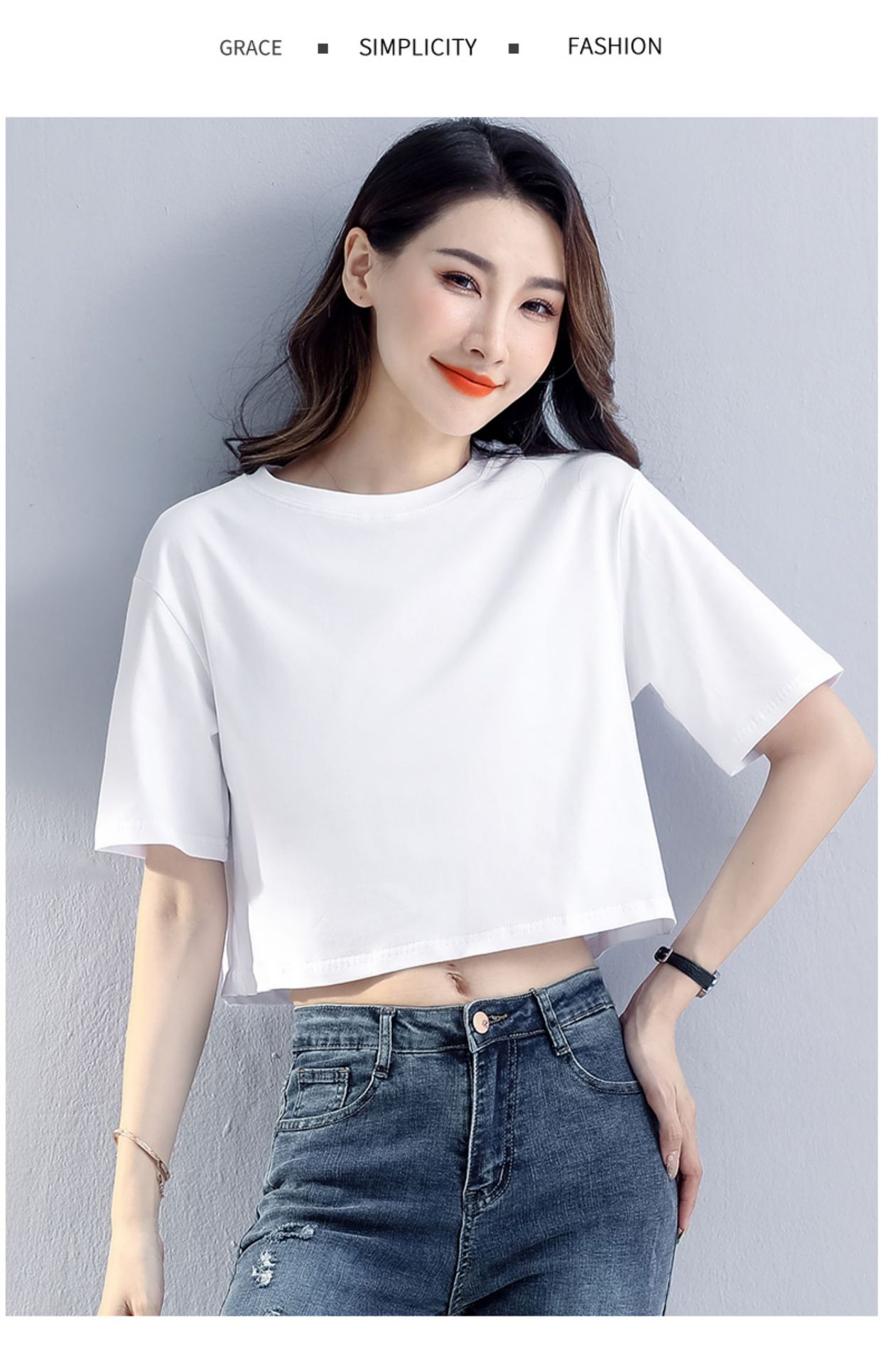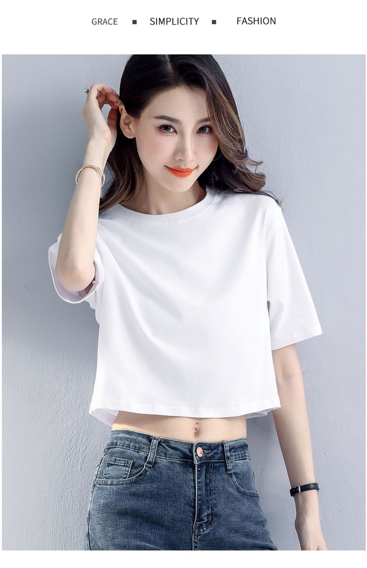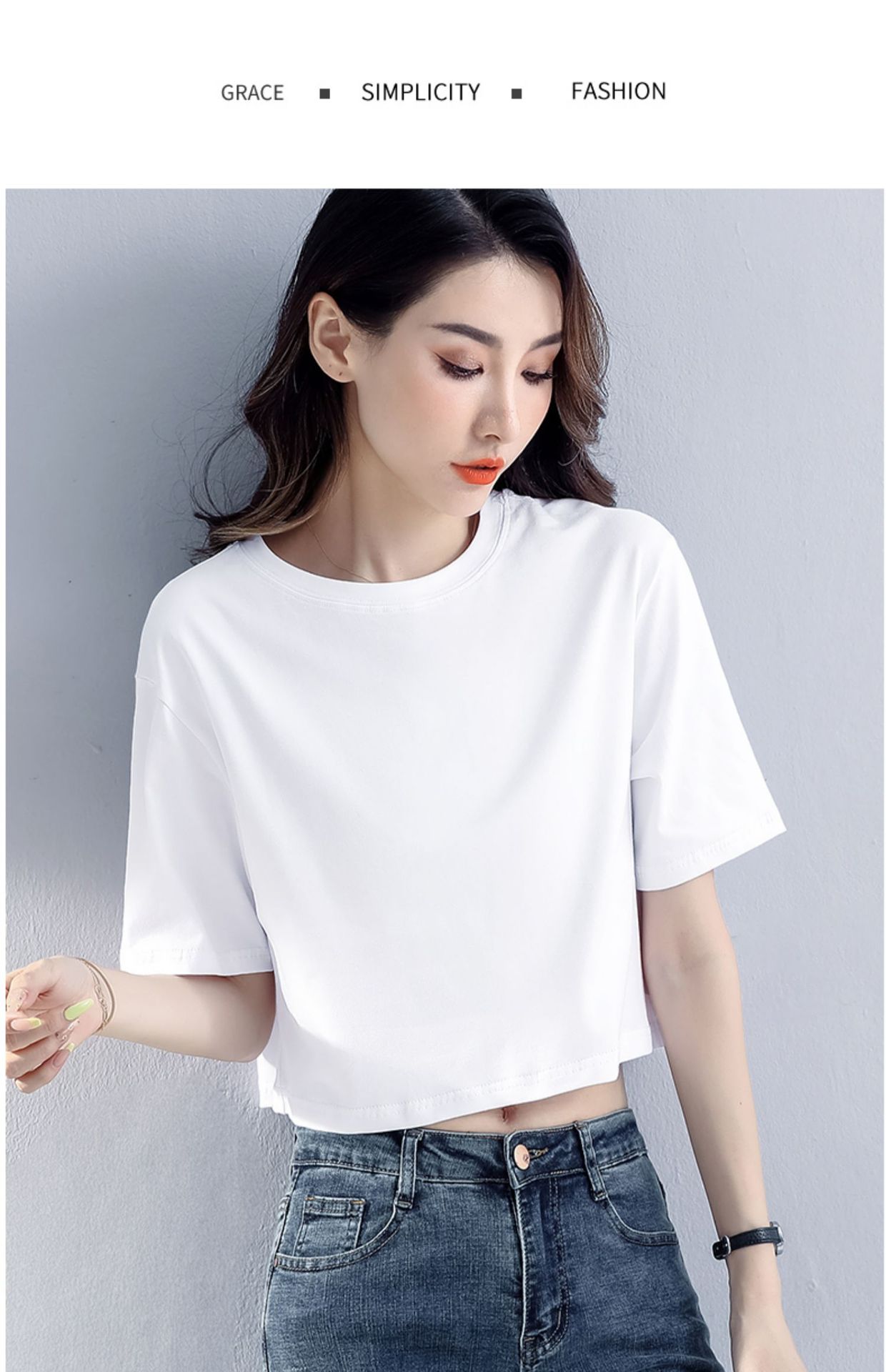 여름 여성용 루즈한 배꼽 노출 반팔 티셔츠, 순면 하이웨이스트 배꼽 노출 여성용 반팔 흰색 티셔츠 탑스토어 가기