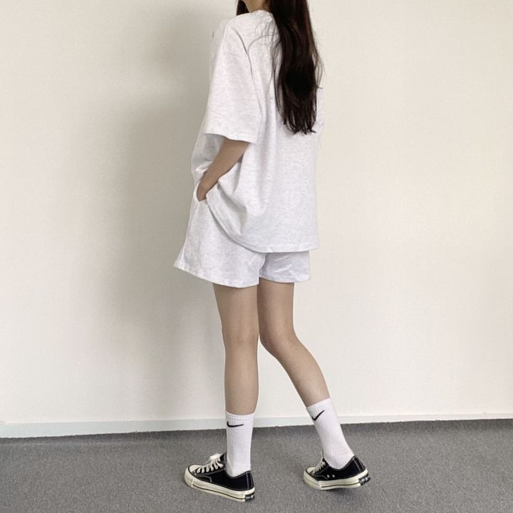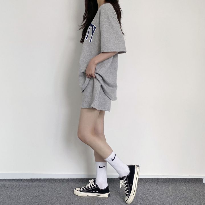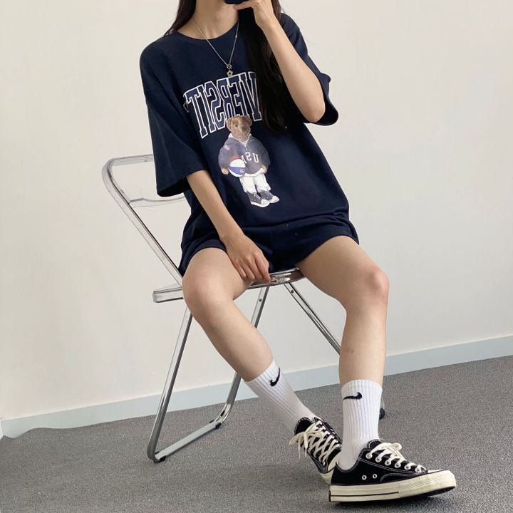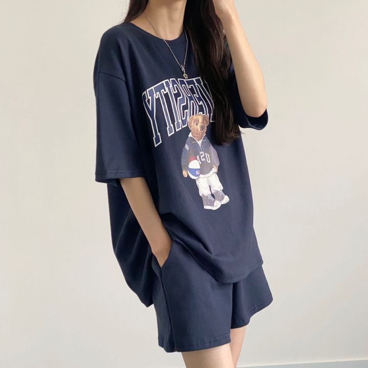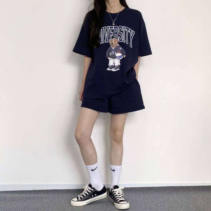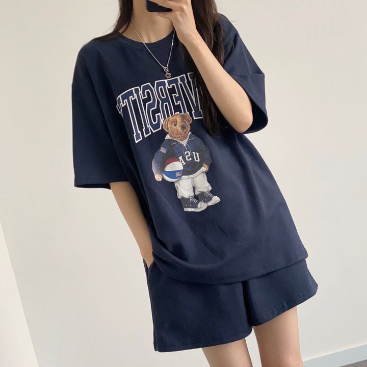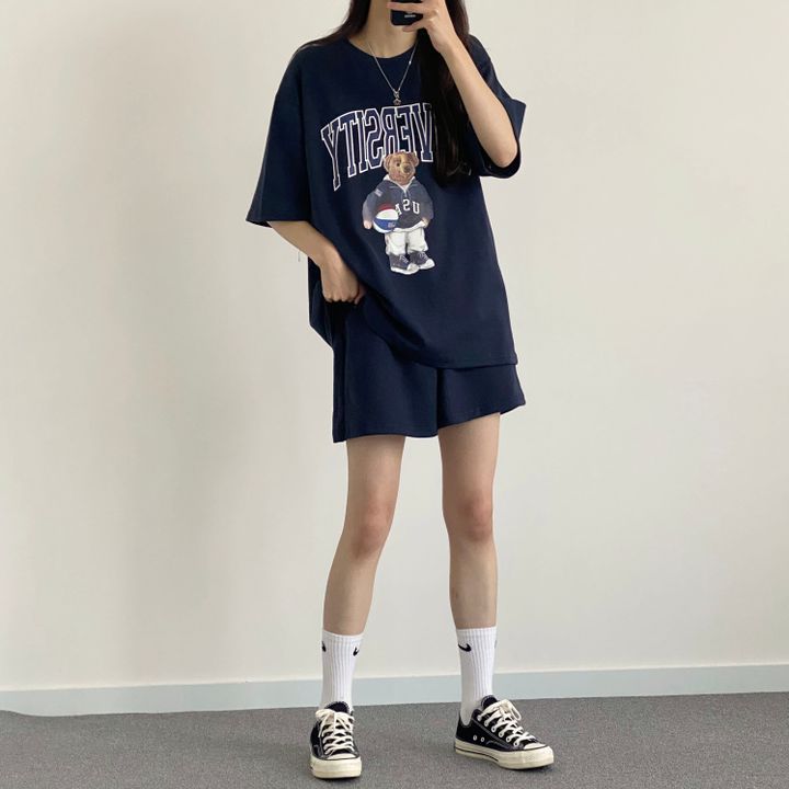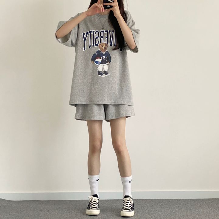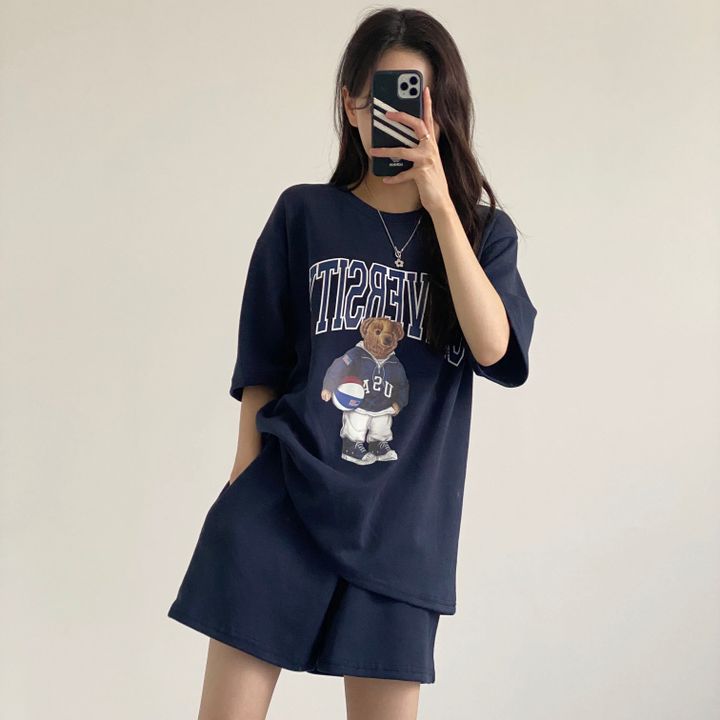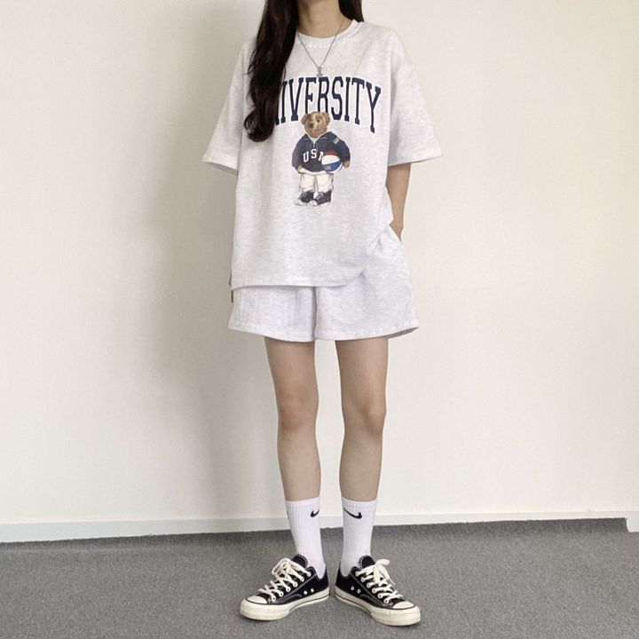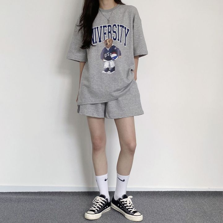 100 면 투피스 세트 여성 플러스 사이즈 한국 스타일 여름 패션 캐주얼 스포츠웨어 만화 반팔 반바지 여성 의류스토어 가기