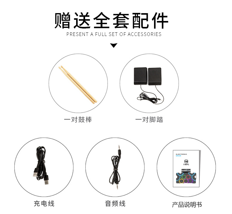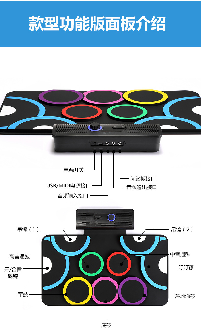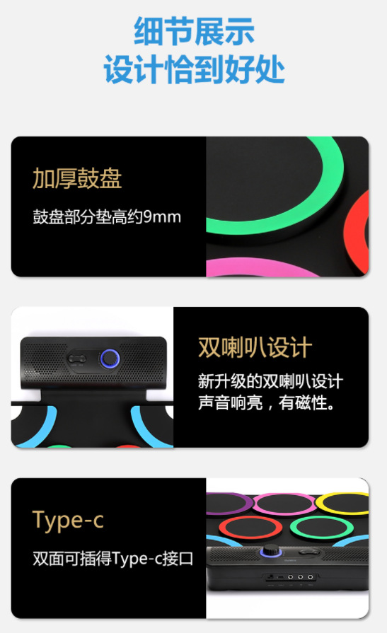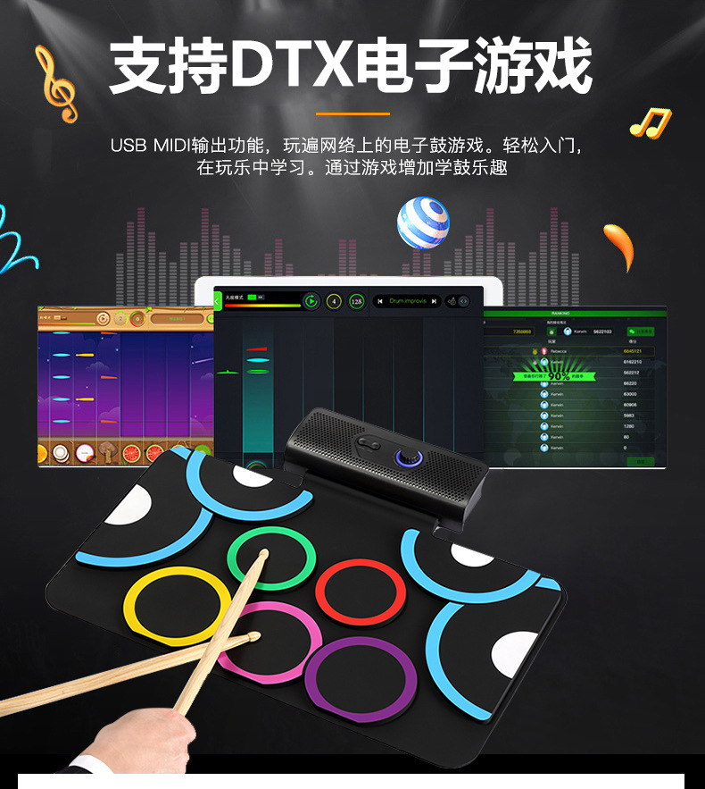 PD-1 핸드 롤 드럼 충전식 듀얼 스피커 블루투스 비디오 게임 DTX 게임 접이식 발 페달 휴대용 실리콘 전자 드럼