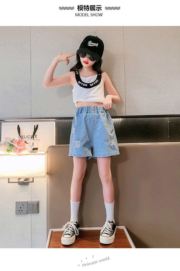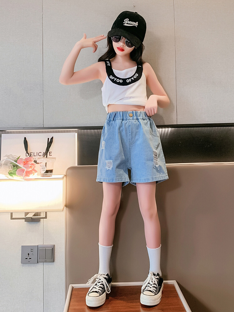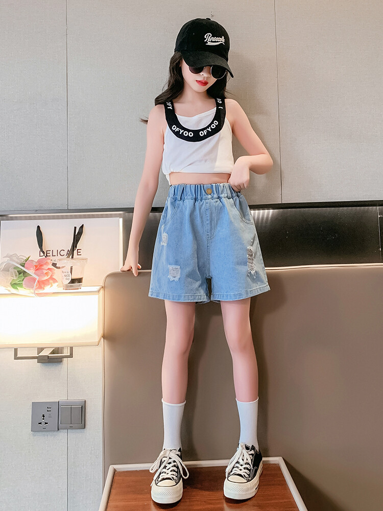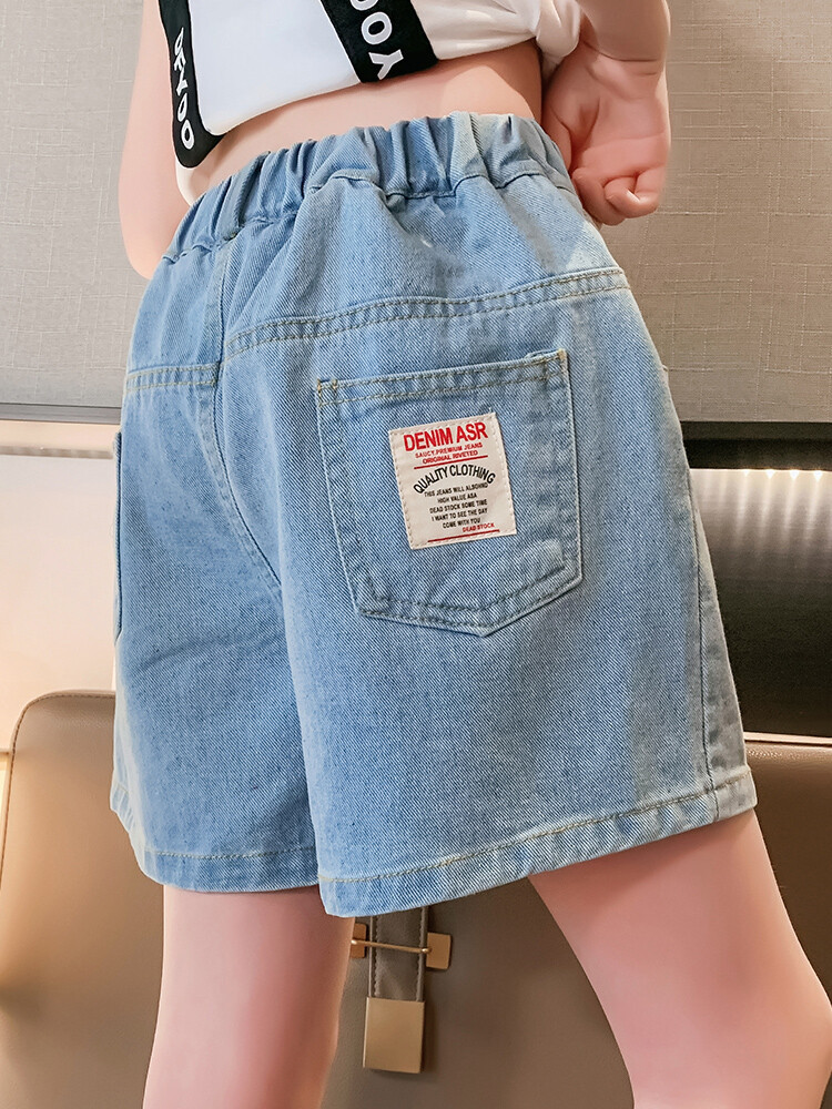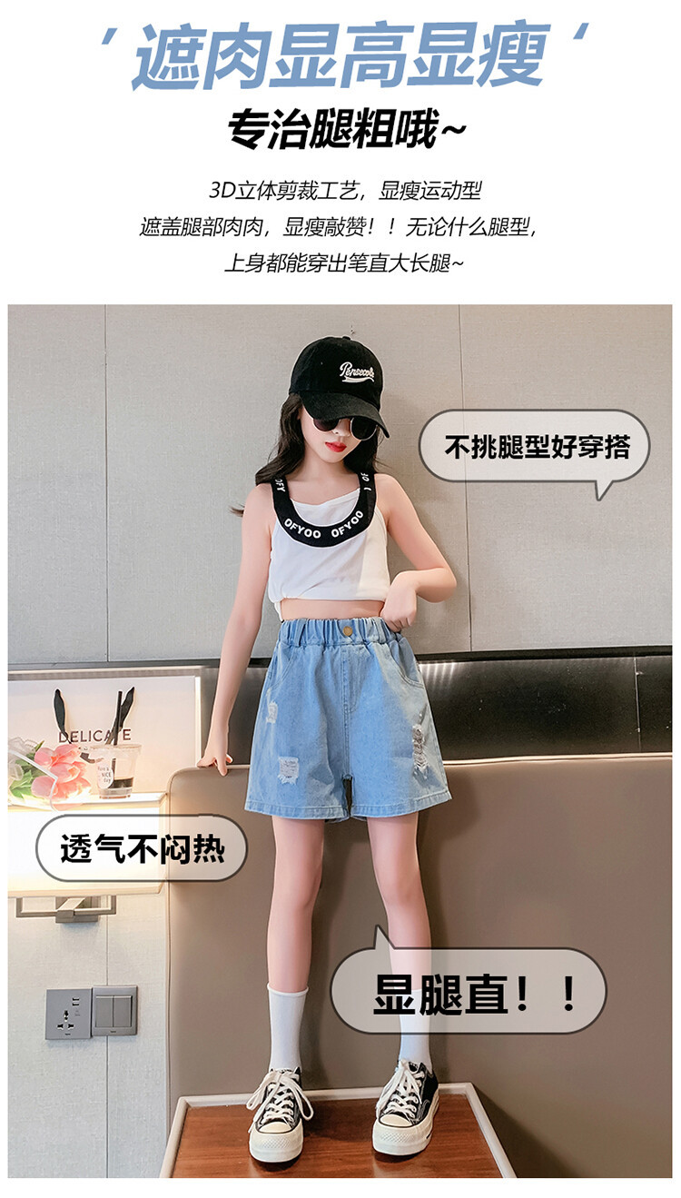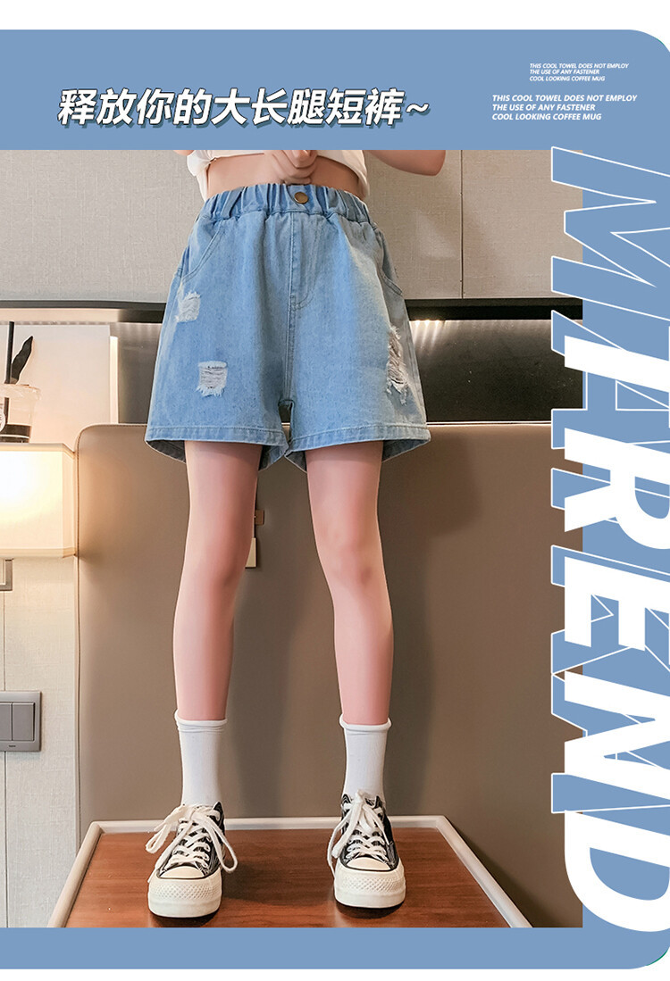 여아 반바지 사이버 인기 찢어진 데님 반바지 겉옷 여름 바지 여름 여아 느슨한 큰 어린이 서양 스타일스토어 가기