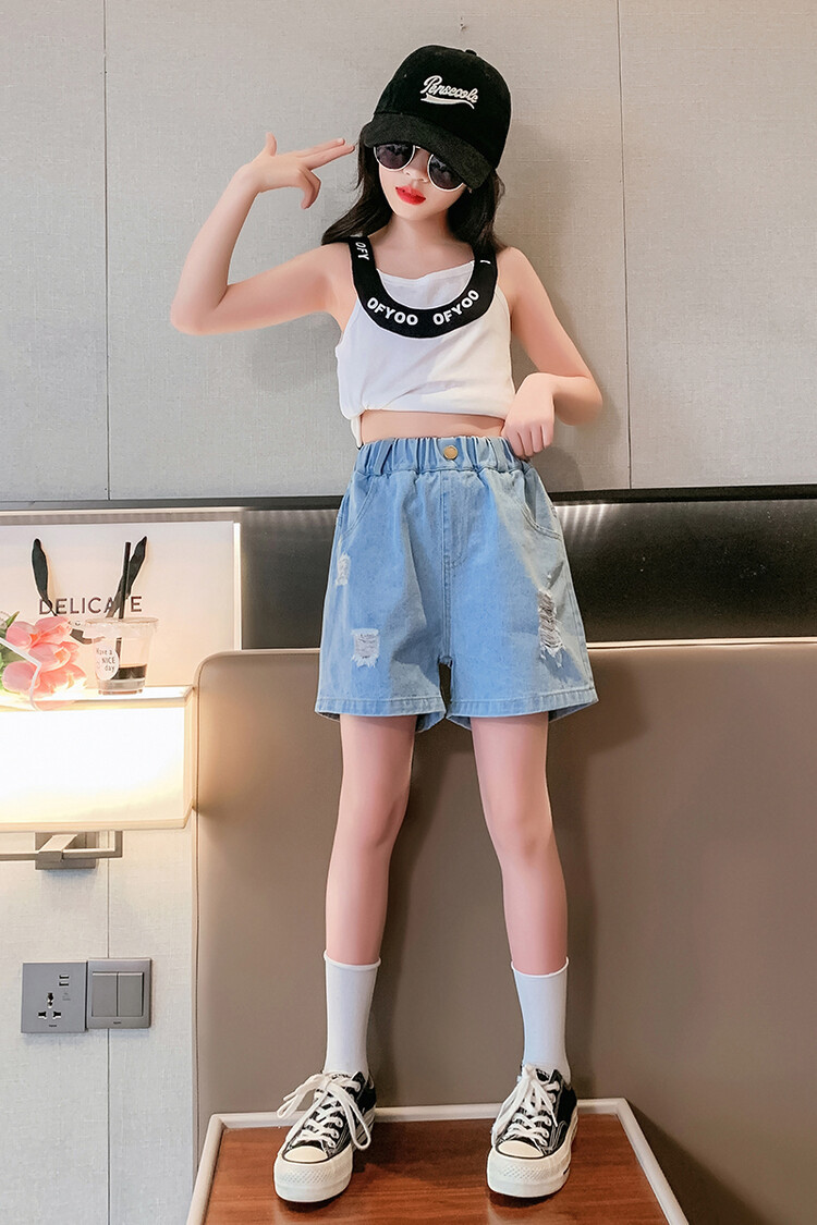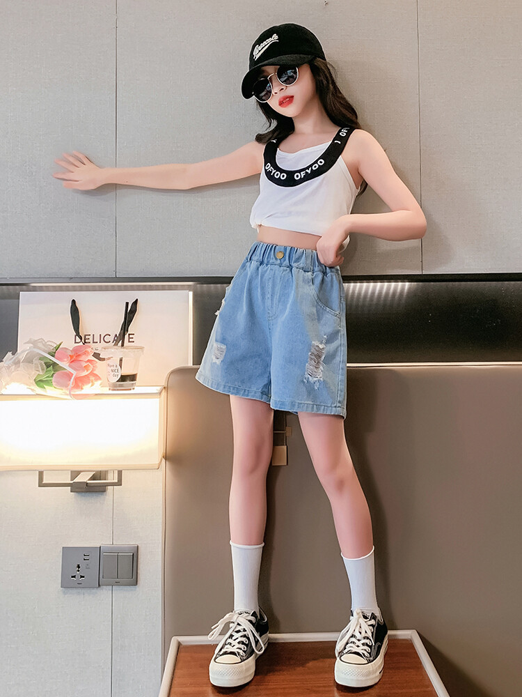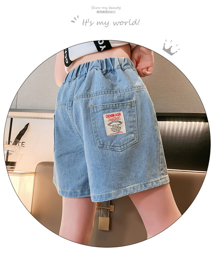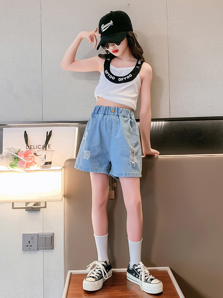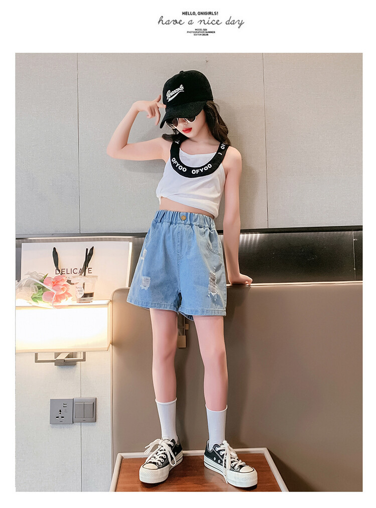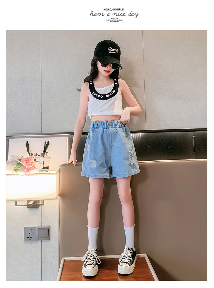 여아 반바지 사이버 인기 찢어진 데님 반바지 겉옷 여름 바지 여름 여아 느슨한 큰 어린이 서양 스타일스토어 가기