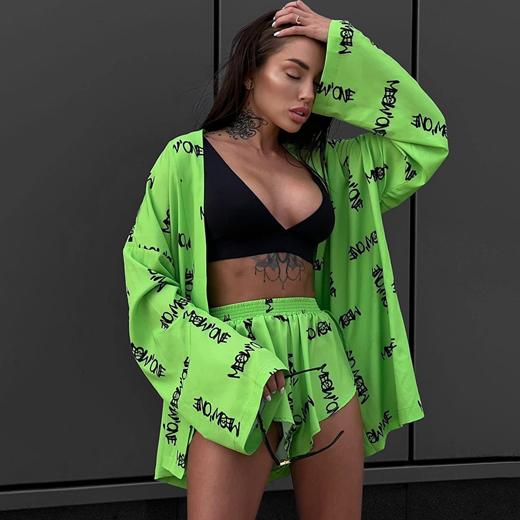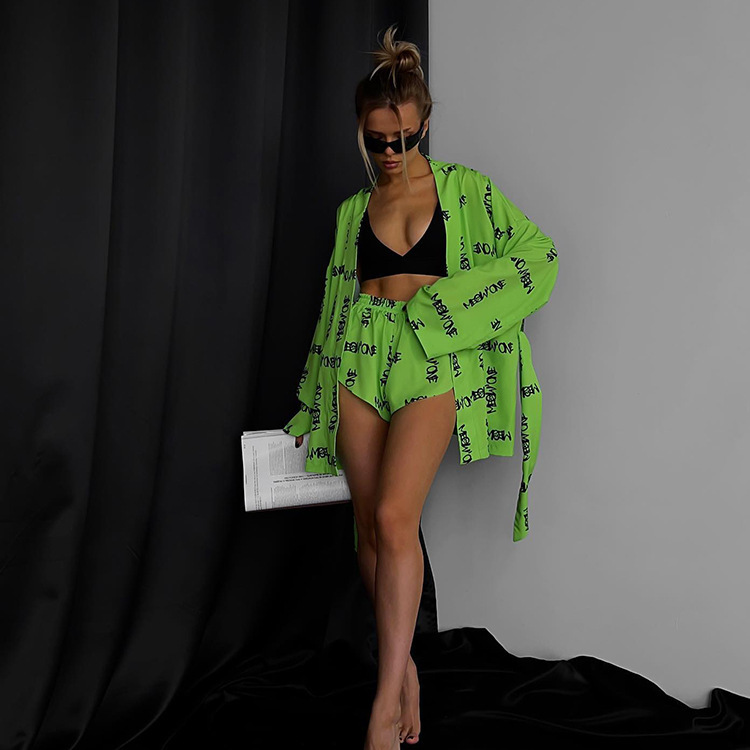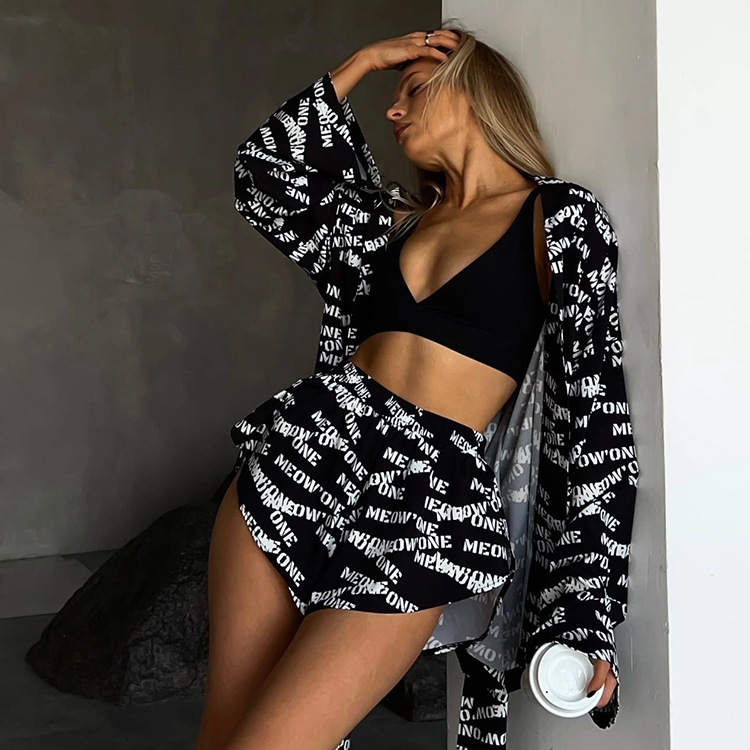 2023 유럽과 미국의 새로운 느슨한 인쇄 여성의 캐주얼 레이스 업 긴 소매 잠옷 하이 웨이스트 반바지 세트 가정 의류스토어 가기