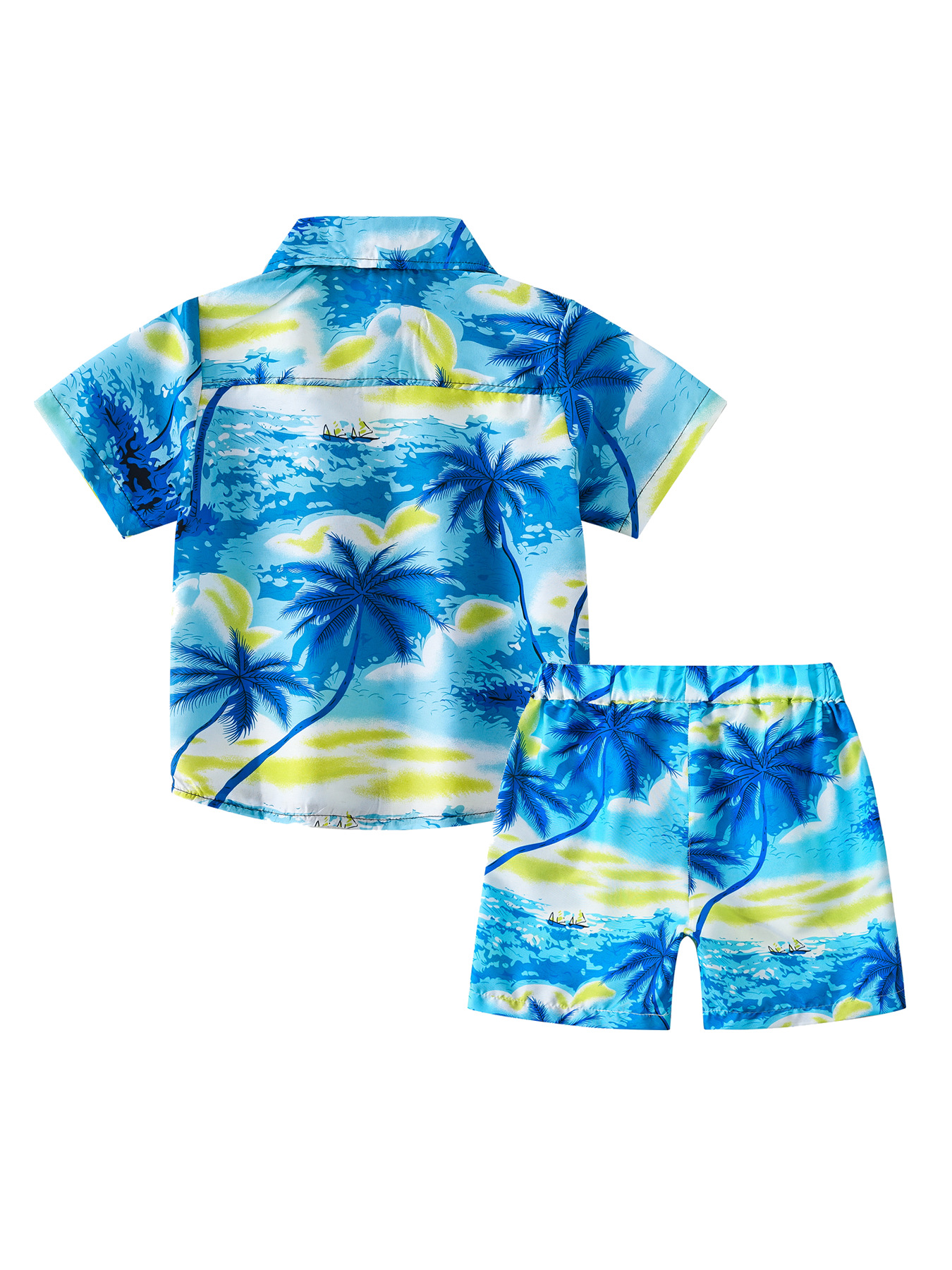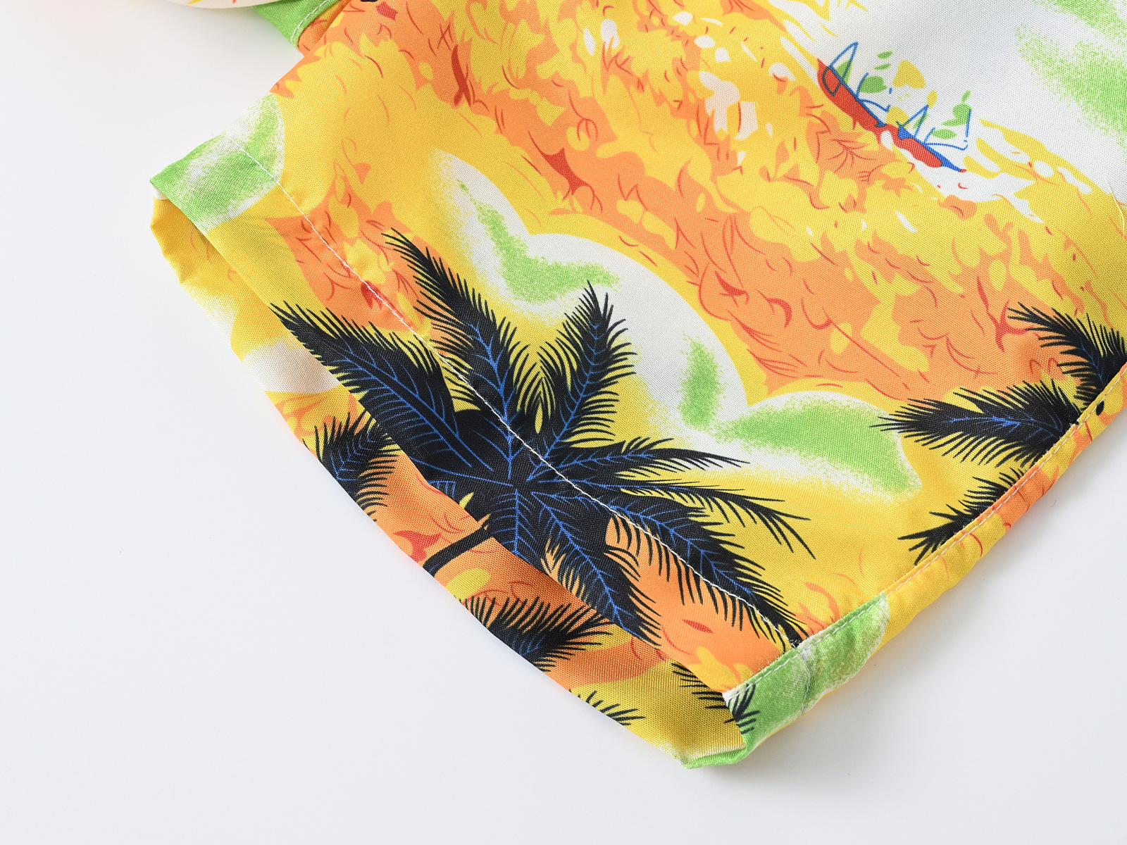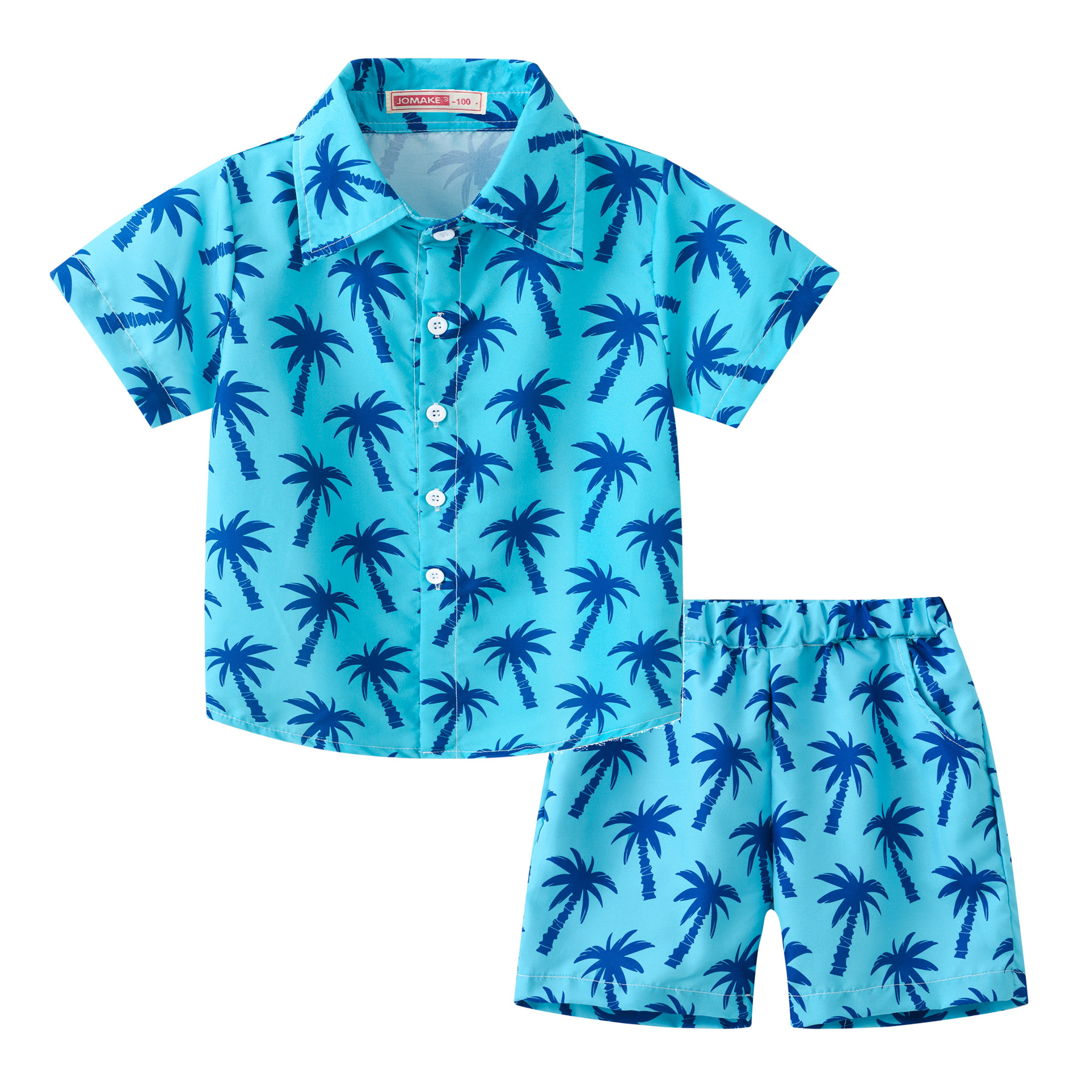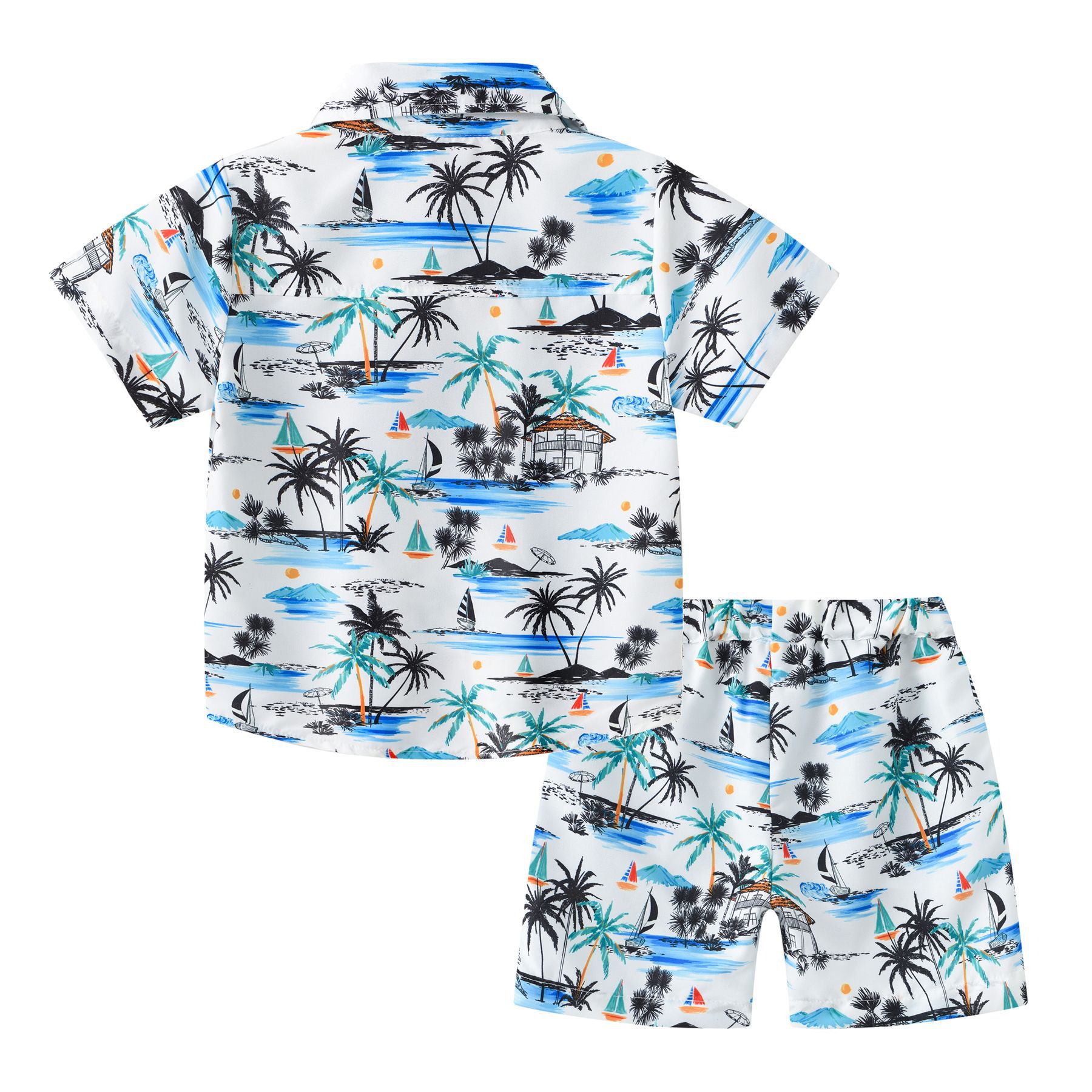 해변 스타일 휴일 스타일 해변 캐주얼 인쇄 코코넛 그 로브 포켓 셔츠 반바지 세트 그린 스트링 아동복 도매스토어 가기