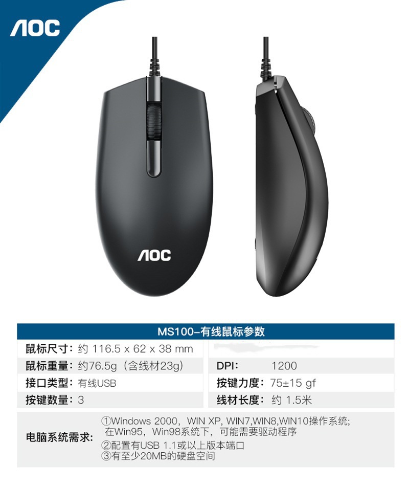 AOC/TPV MS100 비즈니스 카운터 웨이트 느낌 마우스 usb 유선 노트북 데스크탑 외부 소스 도매스토어 가기