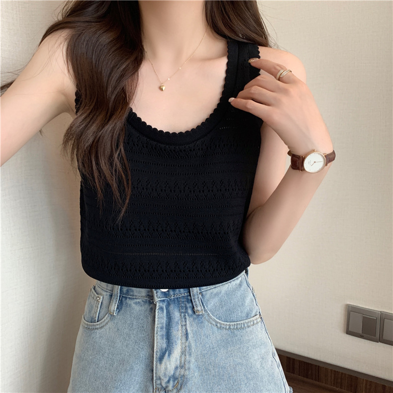 여성을위한 민소매 중공 니트 조끼 2024 여름 새로운 라운드 넥 틈새 겉옷