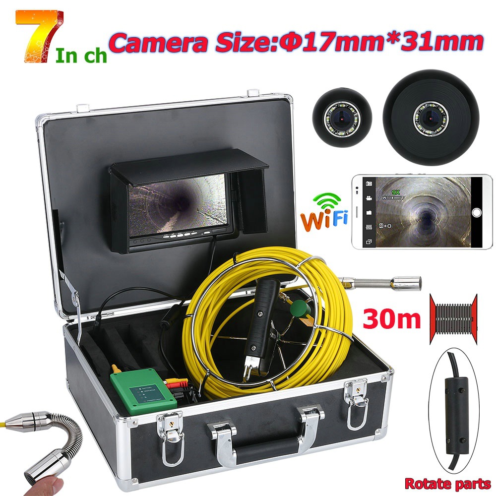 型号:F9717WF-30M 7寸,17mm探头,高清1000线 ,镜头角度145度,30米管道内窥镜,4500MA内置电池,带电量显示,灯亮度可调,内置WIFI热点,无线距离100M,手机APP可观看,拍照,录像,支持安卓与苹果系统,带旋转配件与二个摄像头保护套。