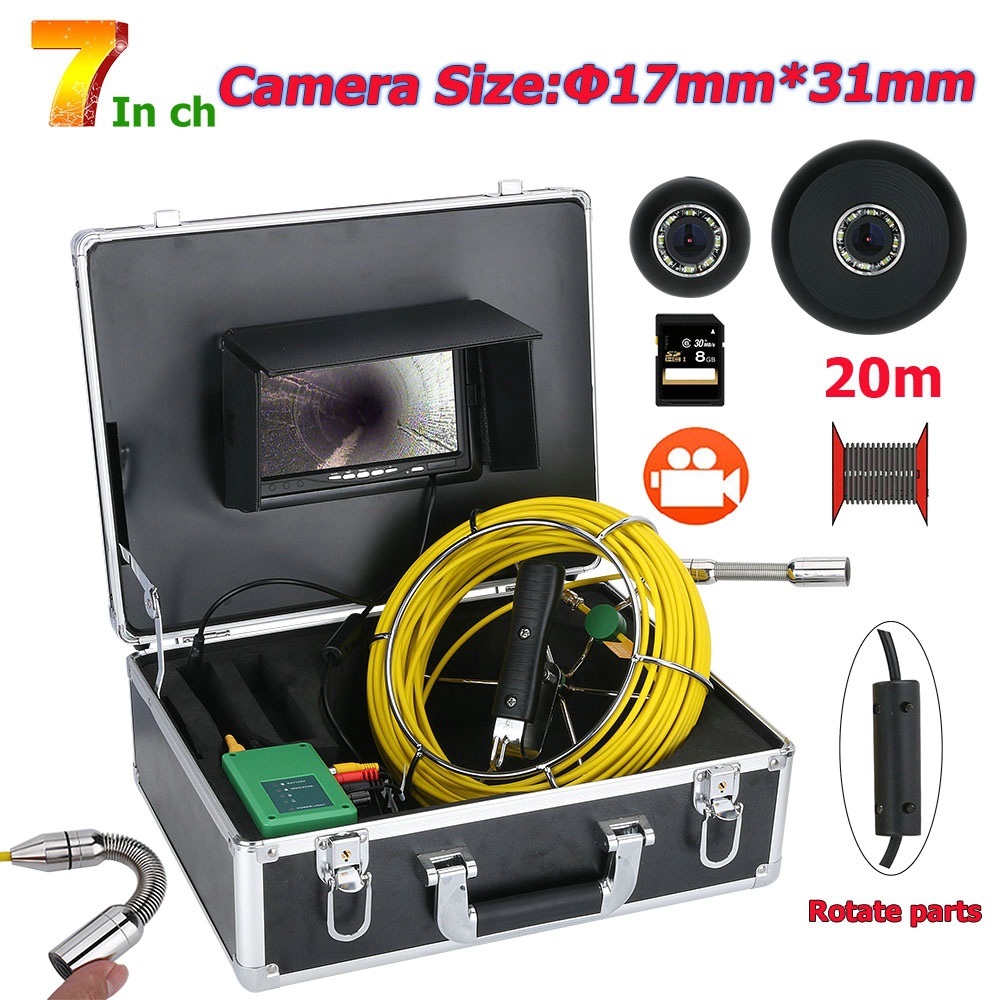 型号:F9717D-20M 7寸录像屏带8G卡,直径17mm不锈钢探头,高清1000线 ,镜头角度145度,20米管道内窥镜,4500MA内置电池,带电量显示,8个白光灯亮度可调,带旋转配件与二个摄像头保护套。可拍照,录像。