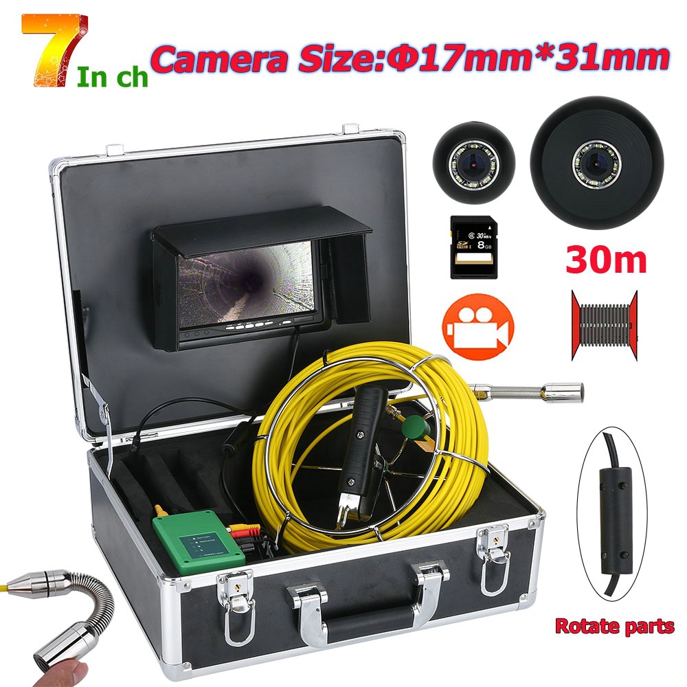 型号:F9717D-30M 7寸录像屏带8G卡,直径17mm不锈钢探头,高清1000线 ,镜头角度145度,30米管道内窥镜,4500MA内置电池,带电量显示,8个白光灯亮度可调,带旋转配件与二个摄像头保护套。可拍照,录像。