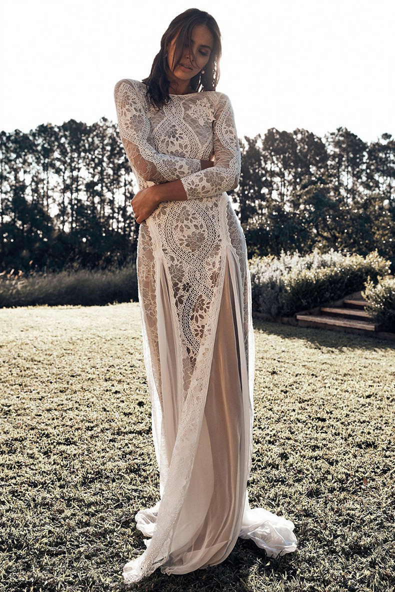 유럽과 미국의 여성 원피스 둥근 목 긴팔 중공 백리스 레이스 연예인 연회 웨딩 원피스