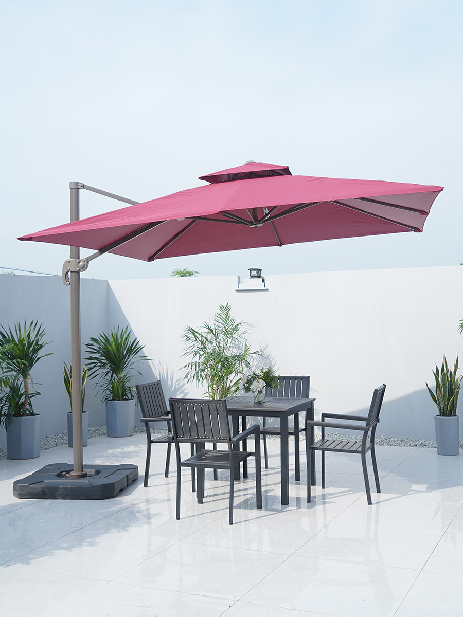 • 정사각형 나무 플라스틱 테이블 + 의자 4 개 + 가장자리 로마 우산 3 미터 정사각형