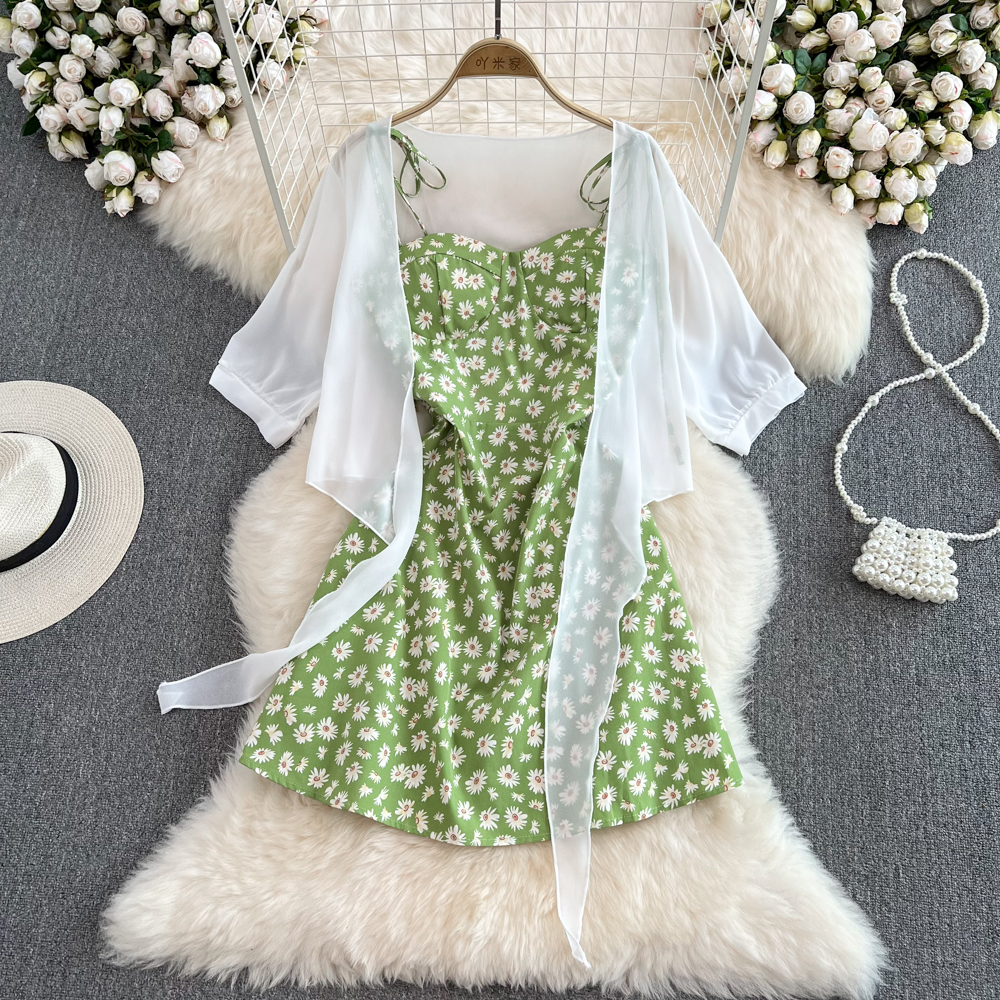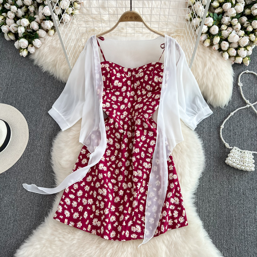 2023 여름 새로운 한국 스타일 여성용 스몰 플로럴 튜브 탑 슬링 원피스 투피스 루즈한 자외선 차단제 가디건스토어 가기