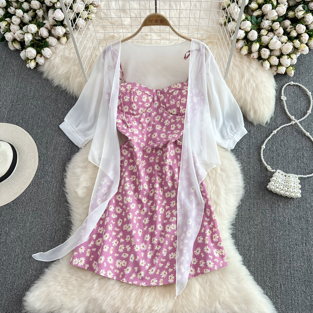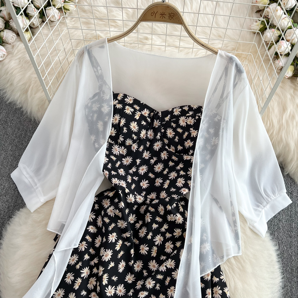 2023 여름 새로운 한국 스타일 여성용 스몰 플로럴 튜브 탑 슬링 원피스 투피스 루즈한 자외선 차단제 가디건