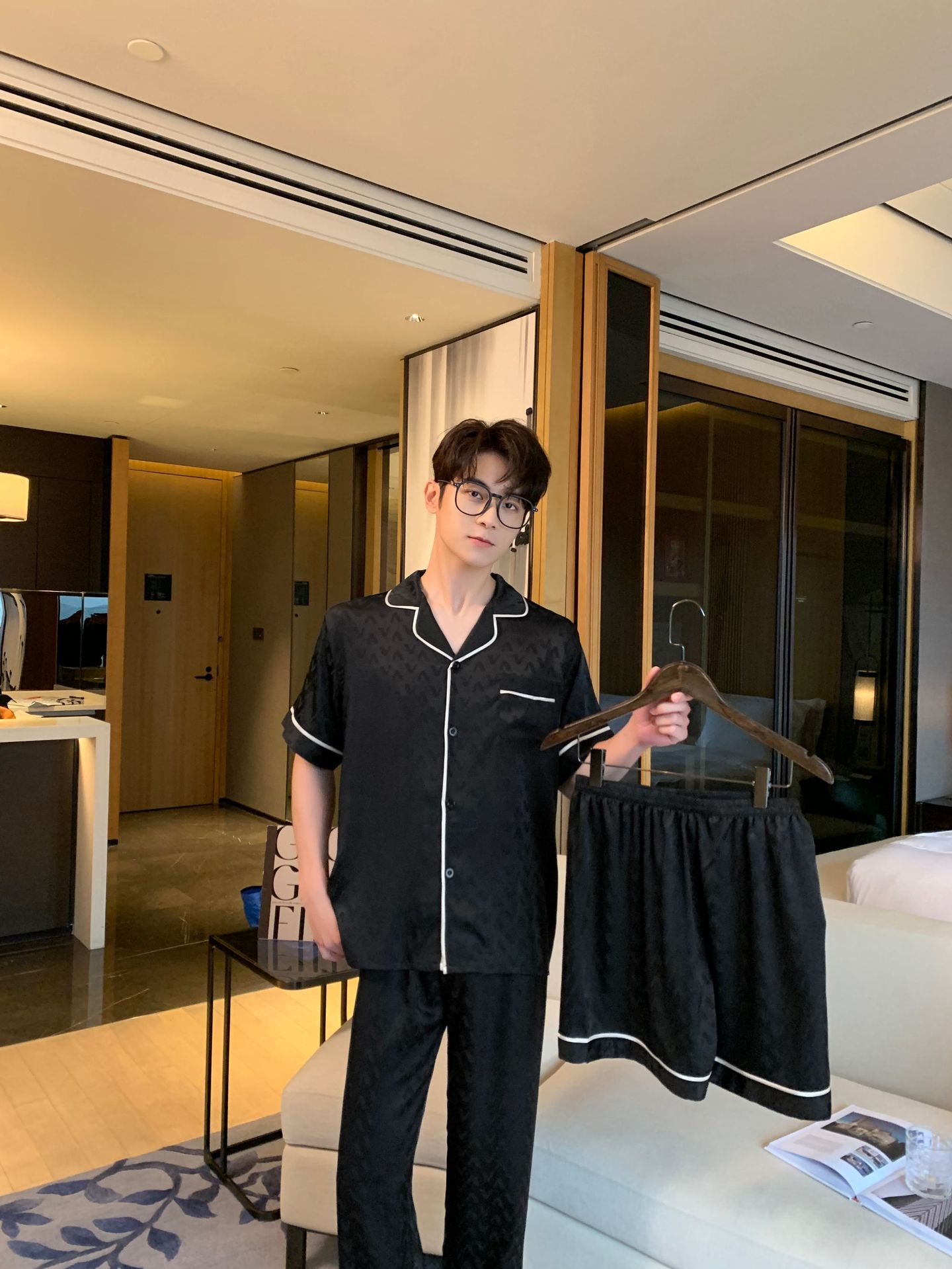 잠옷 남자의 봄과 가을 반팔 반바지 바지 아이스 실크 얇은 자카드 플러스 사이즈 쓰리 피스 가정 의류 세트 N396