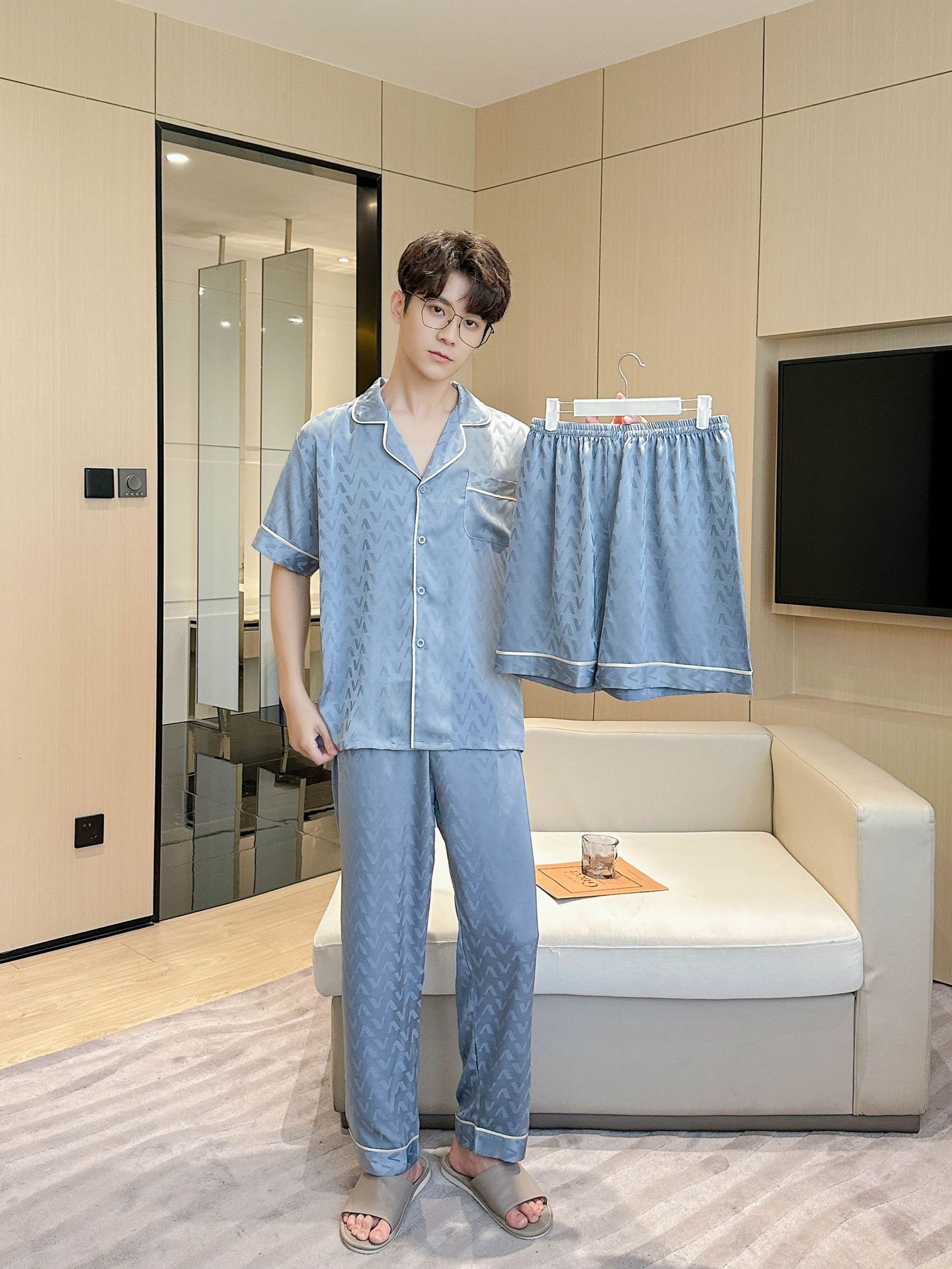 잠옷 남자의 봄과 가을 반팔 반바지 바지 아이스 실크 얇은 자카드 플러스 사이즈 쓰리 피스 가정 의류 세트 N396스토어 가기