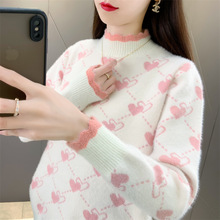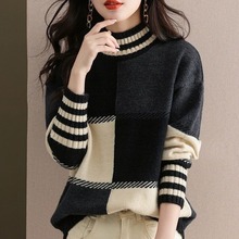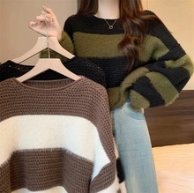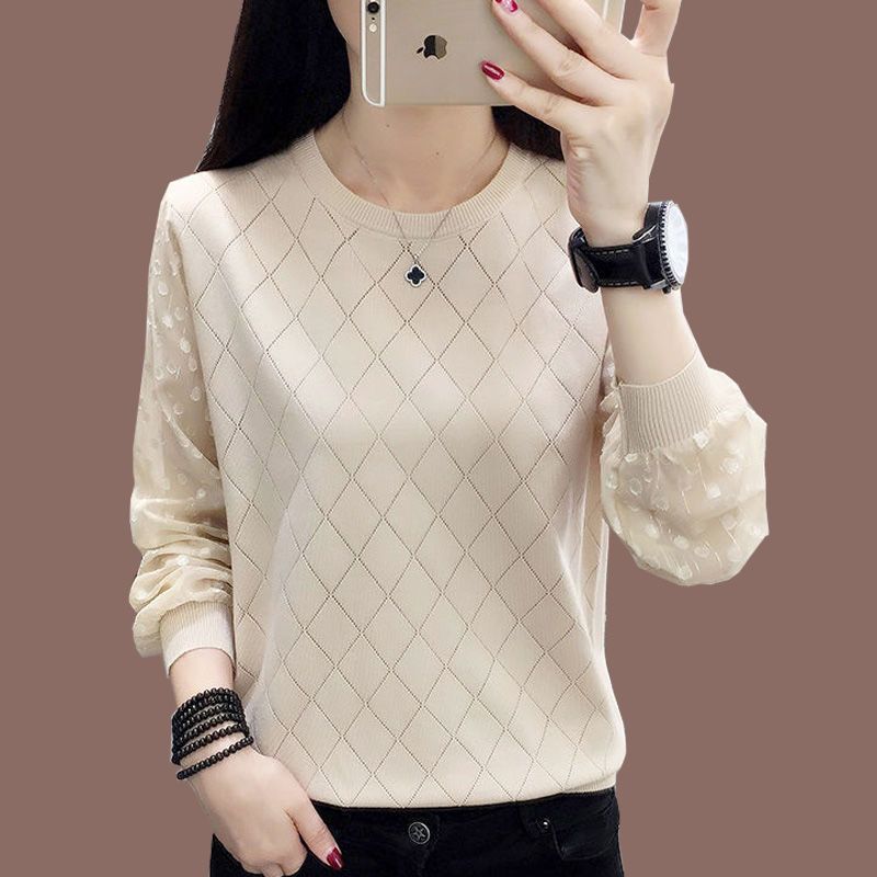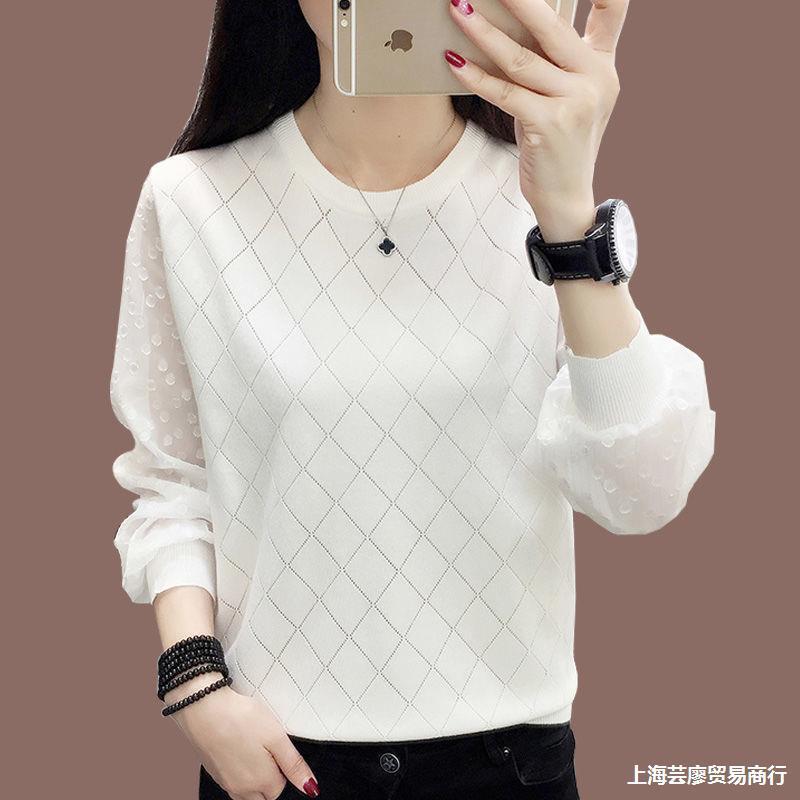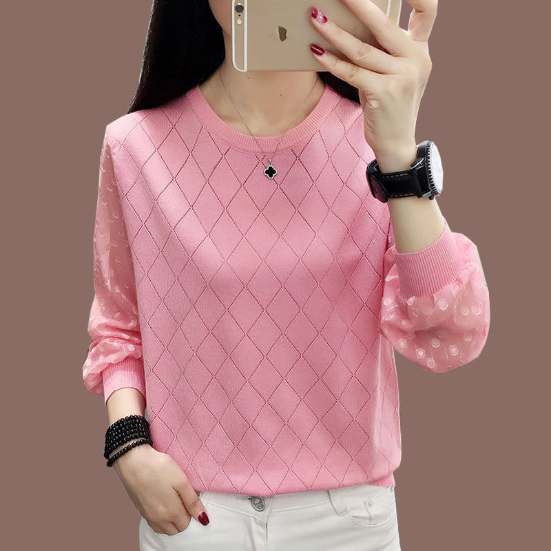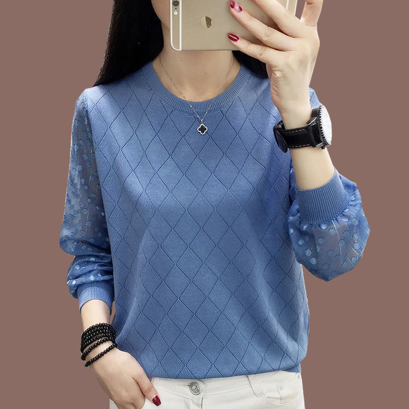 봄과 가을 새로운 긴 소매 니트웨어 플러스 사이즈 쉬폰 레이스 스티칭 스웨터베이스 느슨한 겉옷 얇은 낮은 크루넥