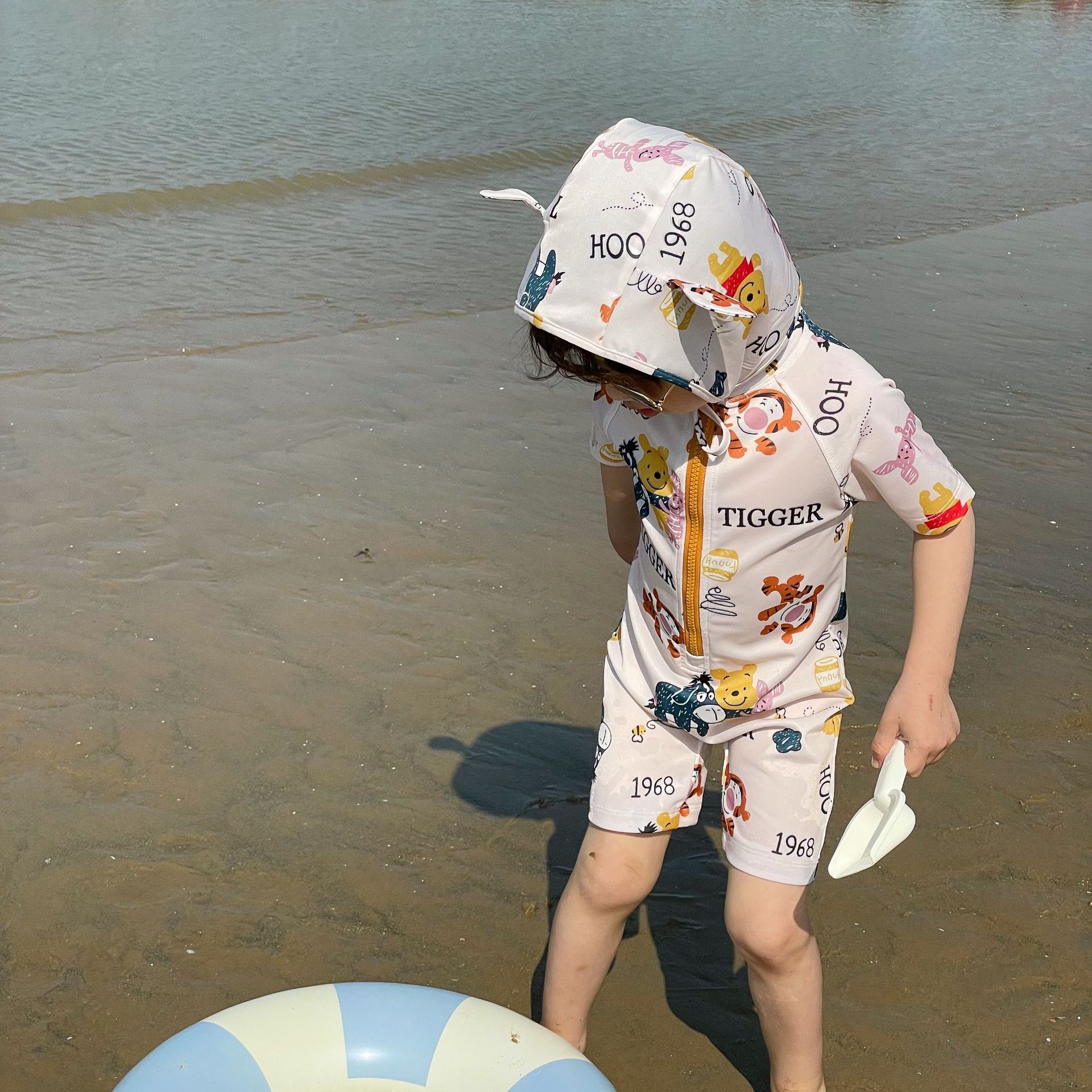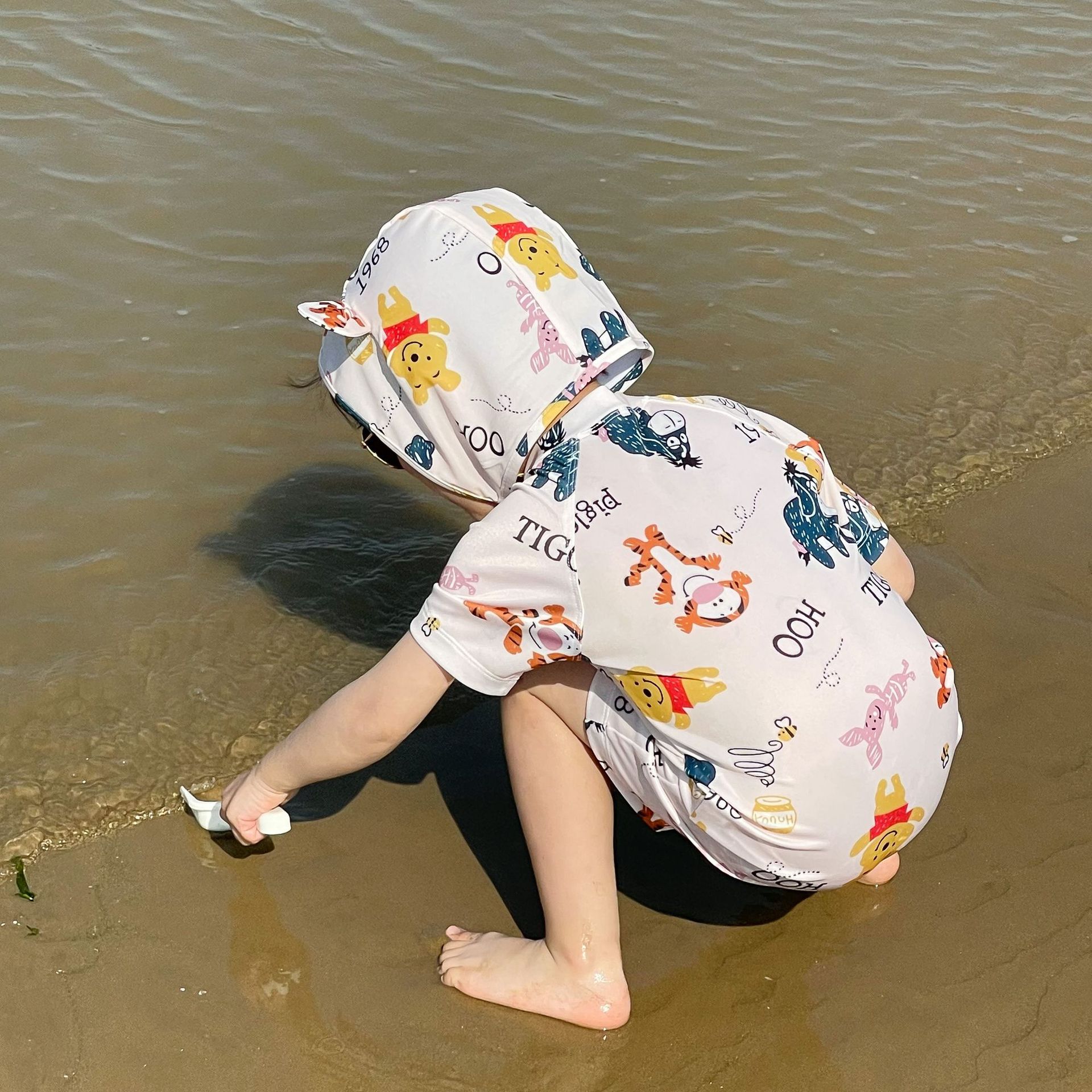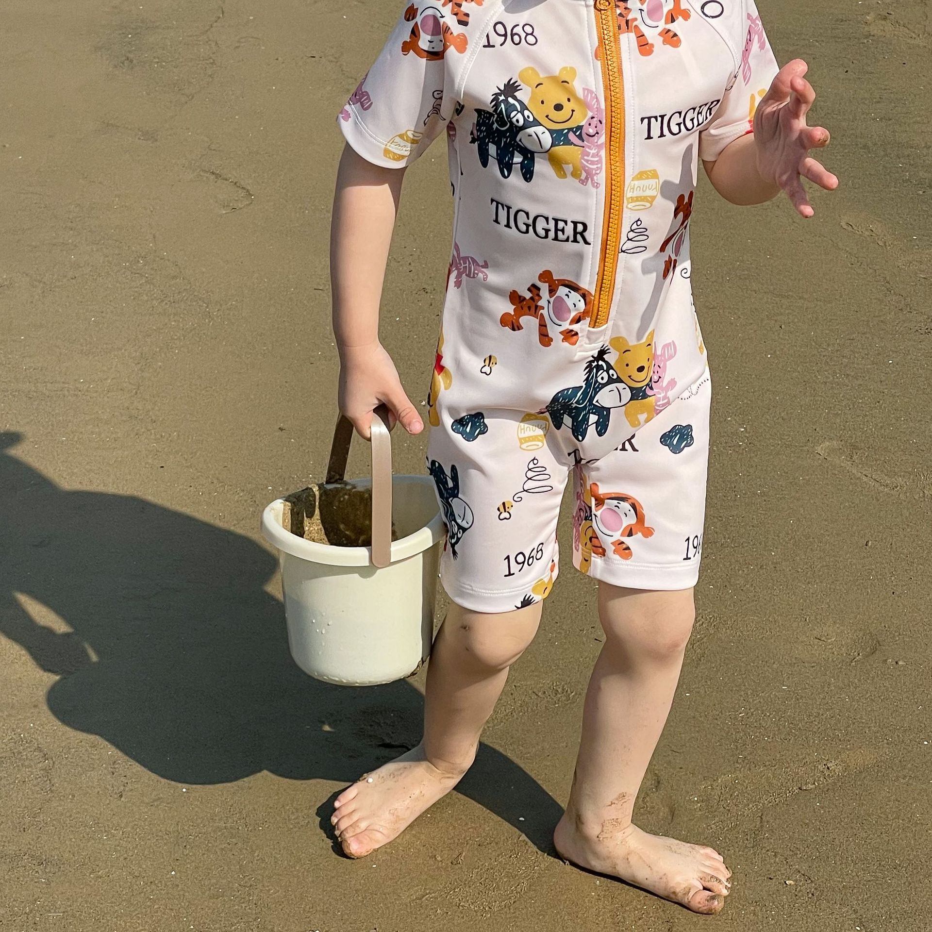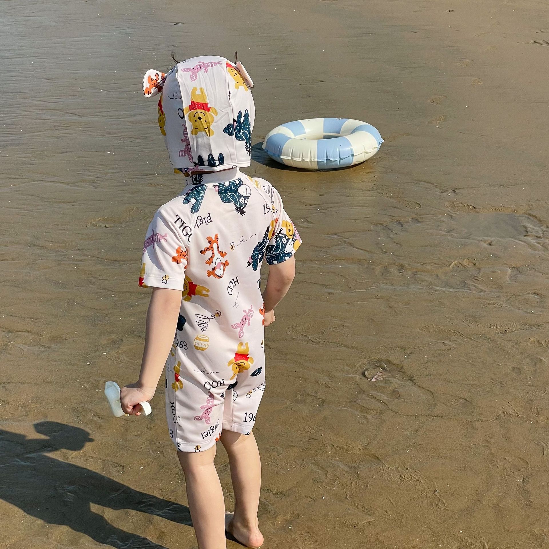 2025 한국판 아동 수영복 남아 여아 원피스 속건 휴가 수영복 귀여운 곰돌이 푸 수영복