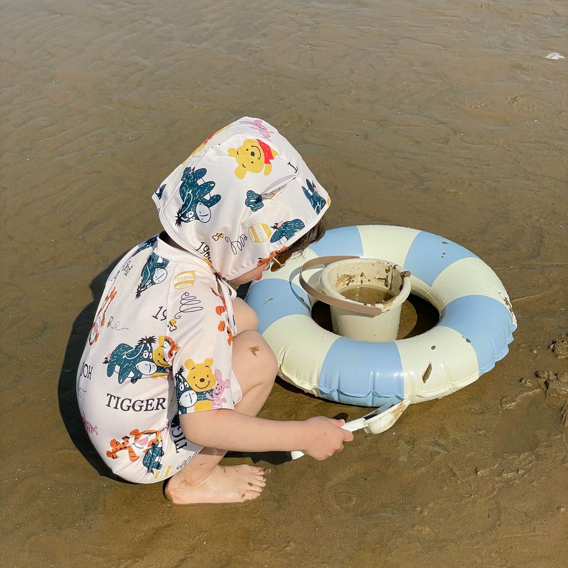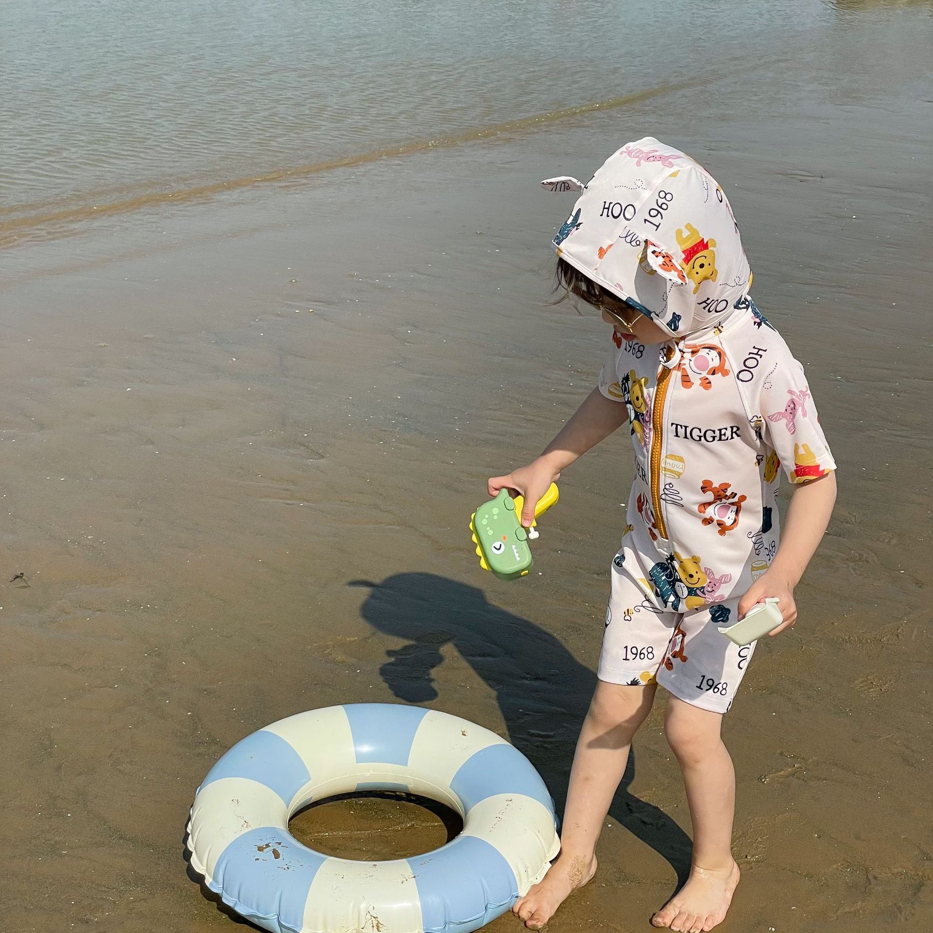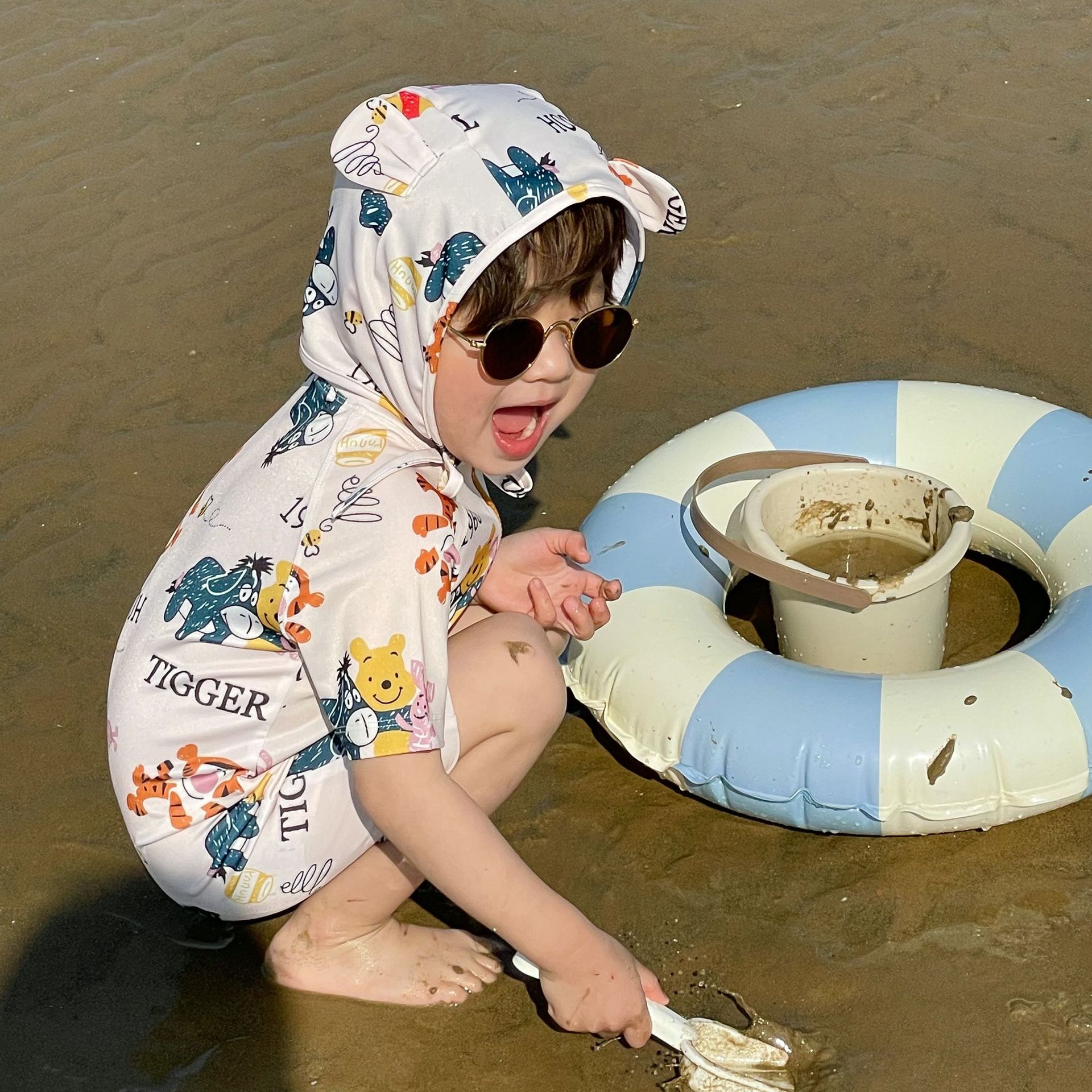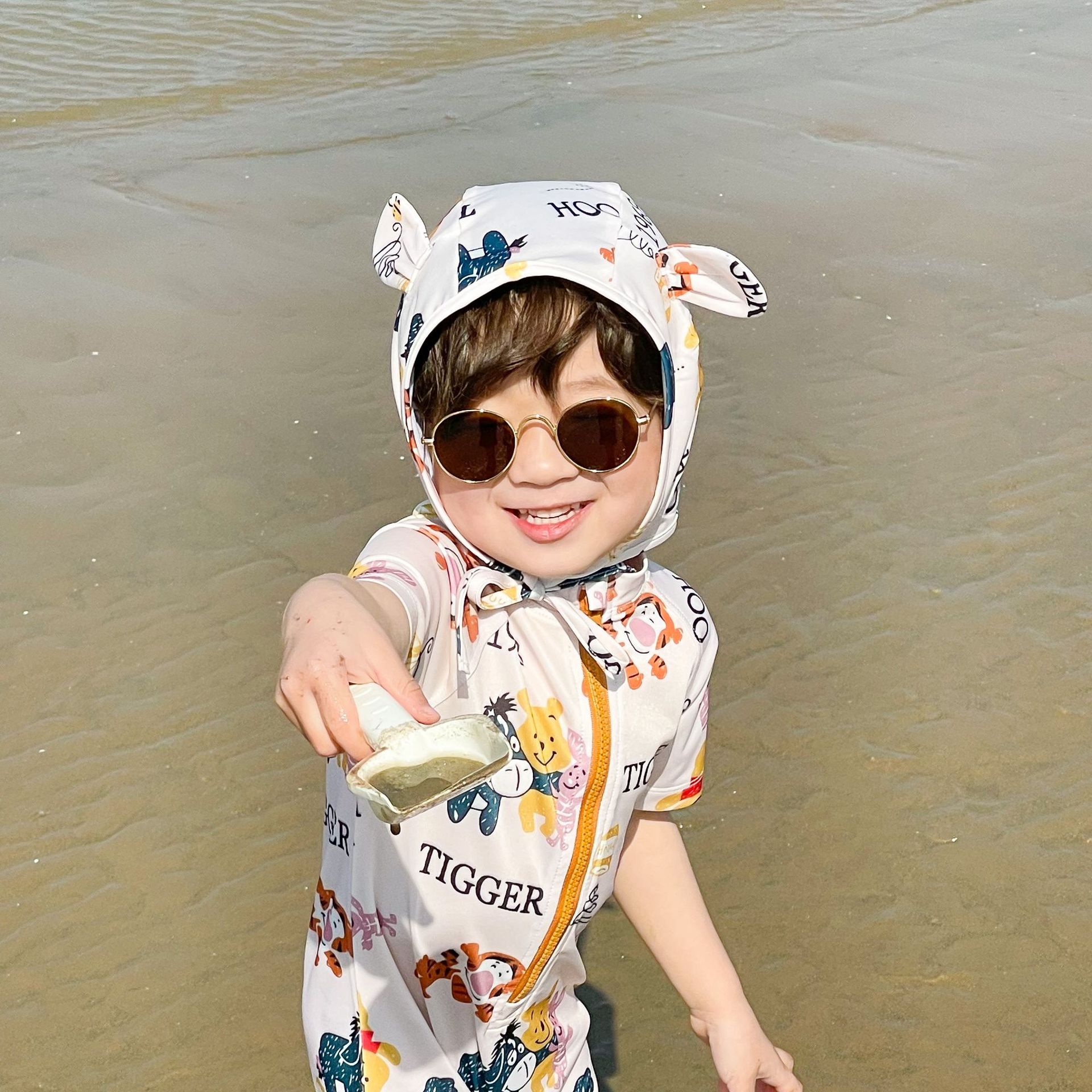 2025 한국판 아동 수영복 남아 여아 원피스 속건 휴가 수영복 귀여운 곰돌이 푸 수영복